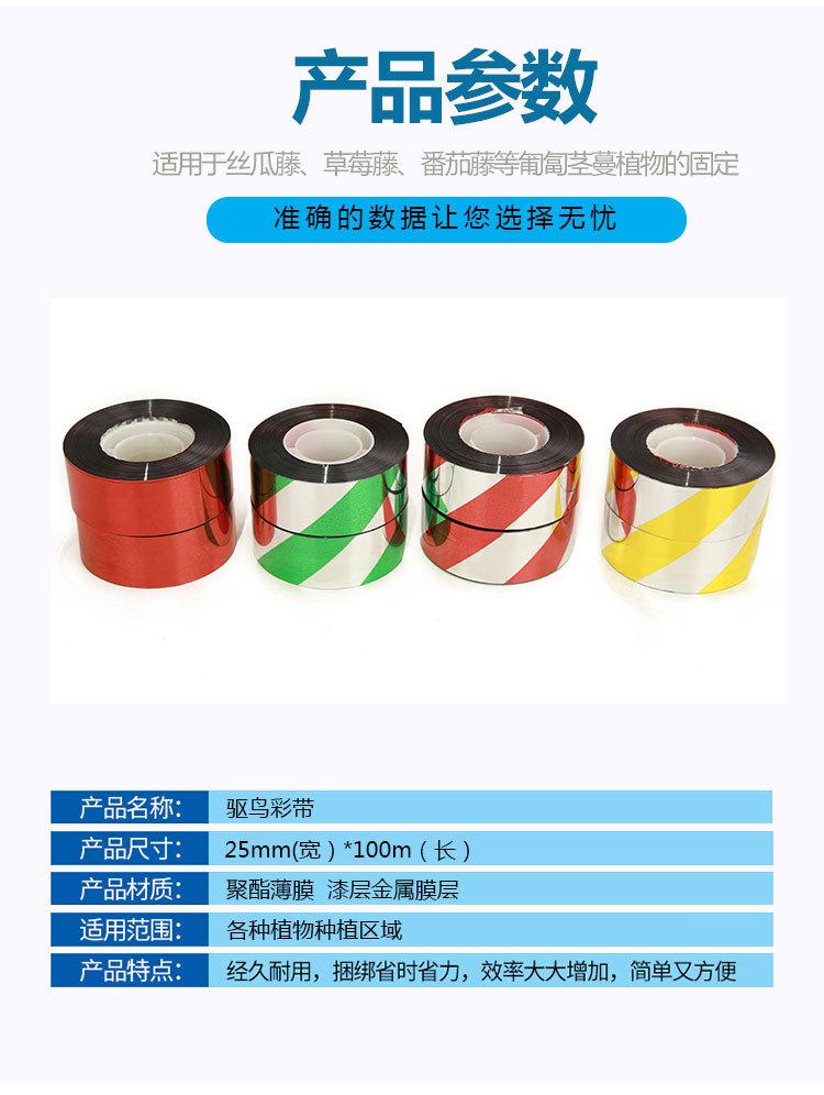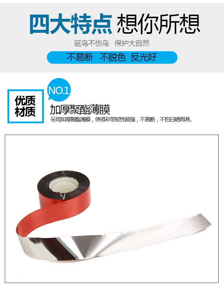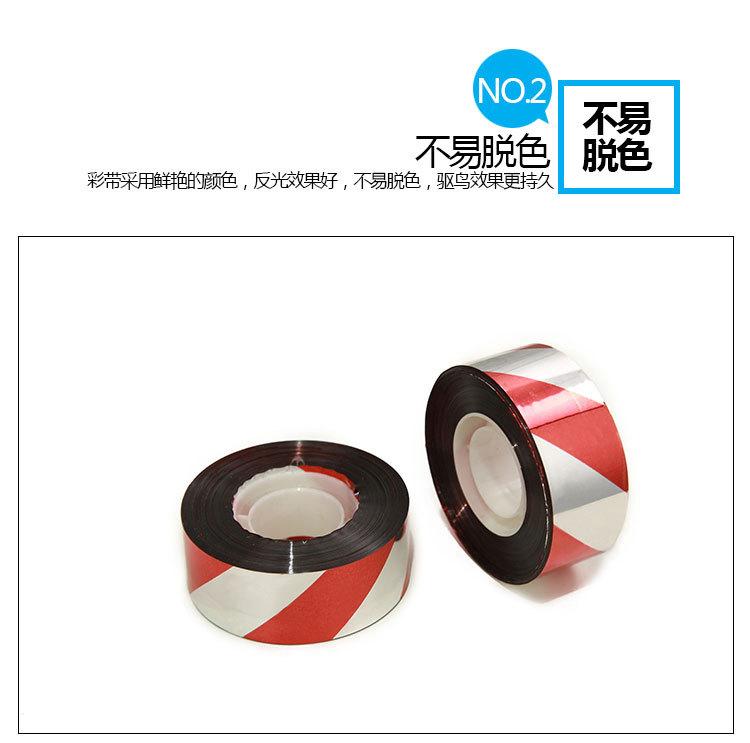 Fita repelente de pássaros é uma fita repelente de pássaros brilhante à base de filme de poliéster. É composta por uma camada de filme de poliéster, uma camada de filme metálico e uma camada de tinta vermelha. Um lado é branco-prateado e o outro lado é vermelho.