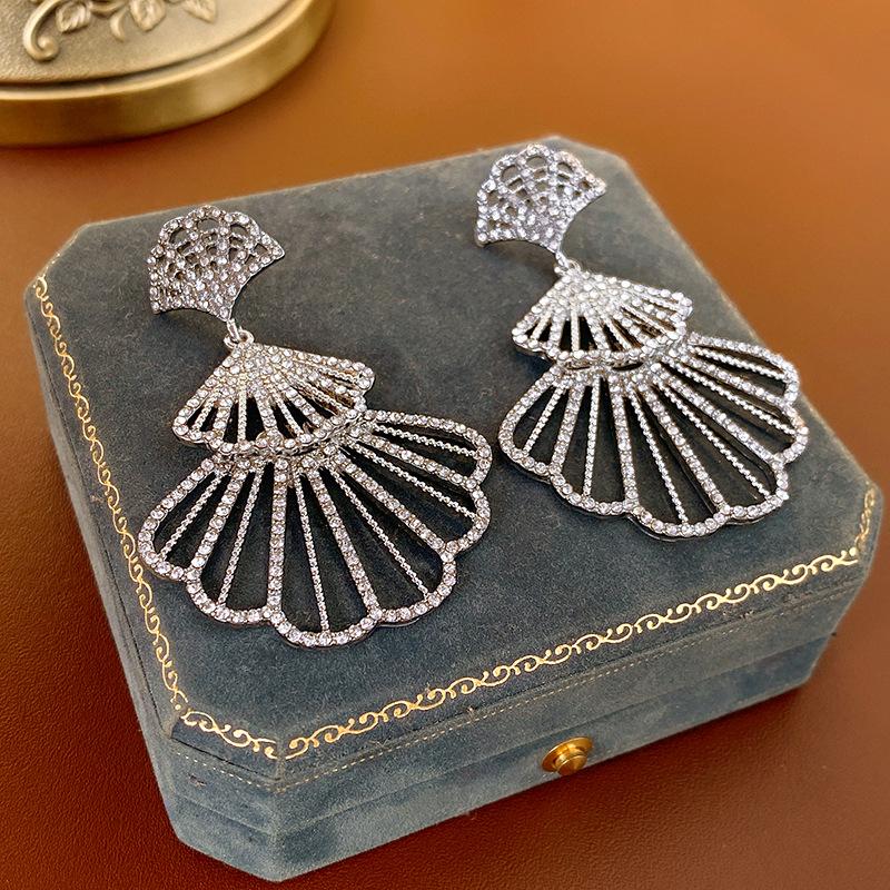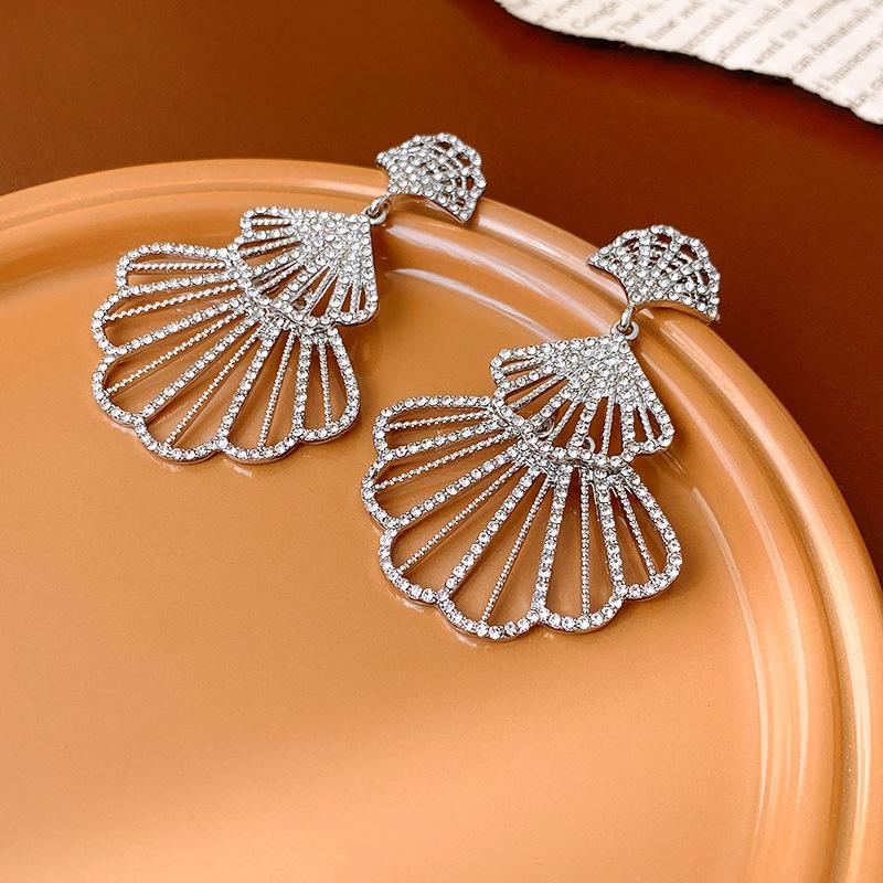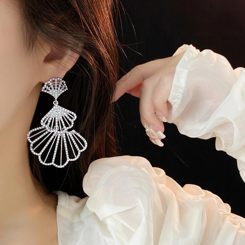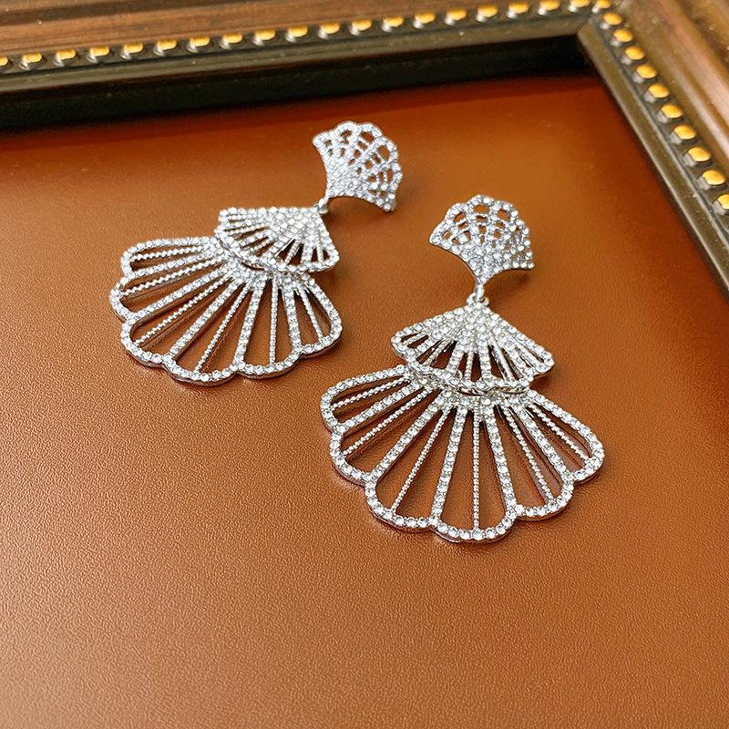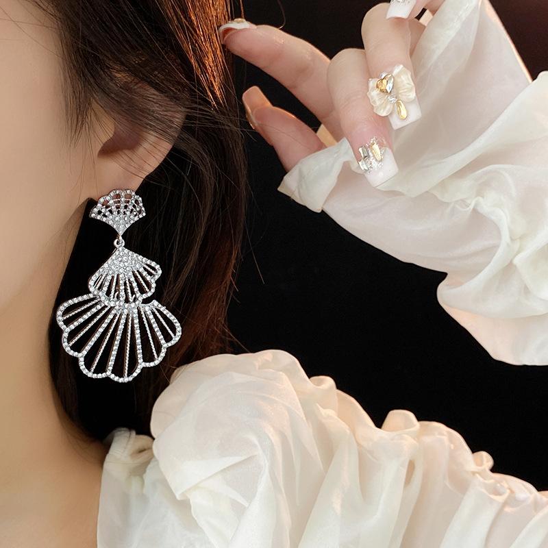Brincos de diamante em forma de leque com agulha de prata, design moderno, brincos transfronteiriços, brincos leves de luxo europeus e americanos, de alta qualidade para mulheres, atacado