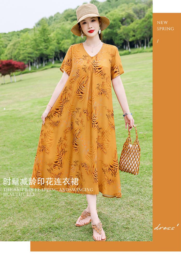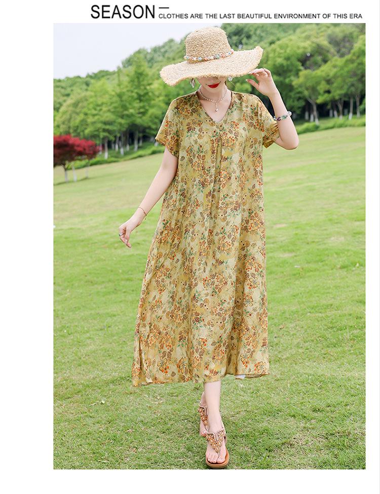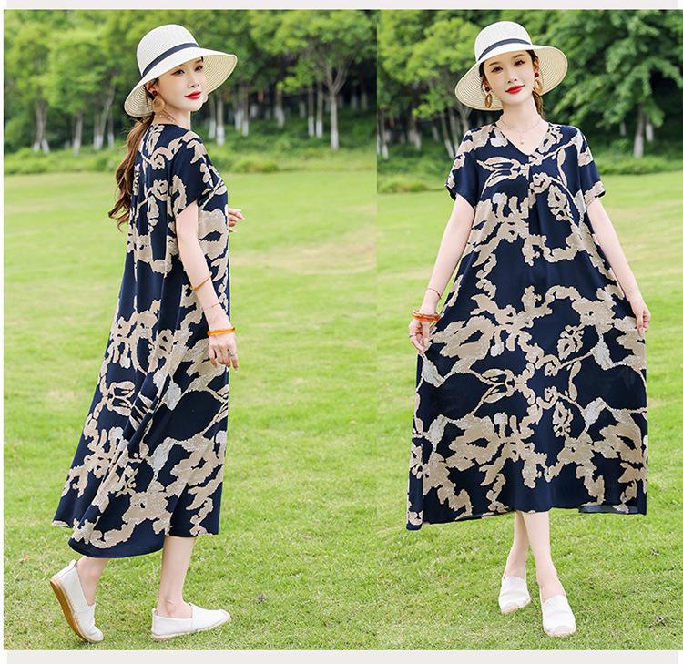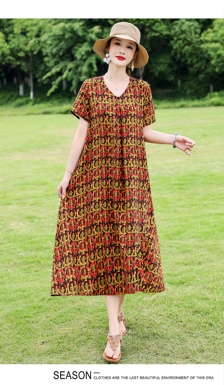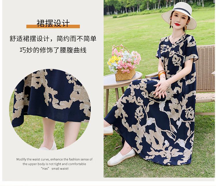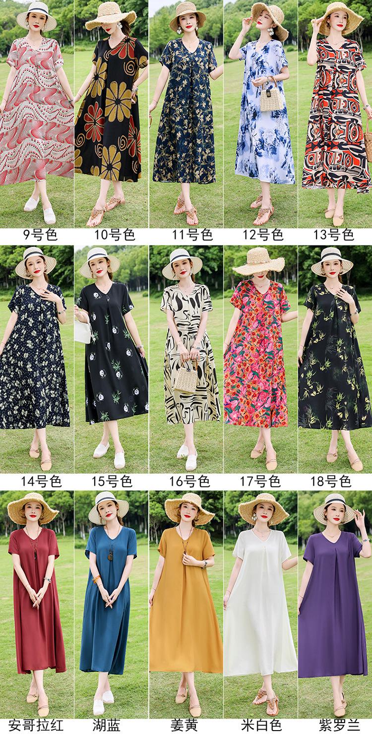 2023 novo vestido de seda de algodão de alta qualidade, moda externa de verão para mães de meia-idade, saia longa estampada com bolso para parecer magra