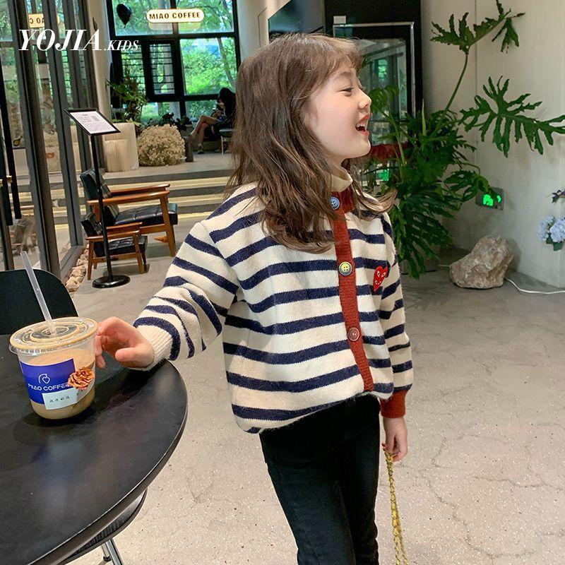 [Pronta Entrega] Cardigã Tricotado para Meninas Roupa Infantil 2025 Outono e Outono Novo Estilo Infantil Estilo Bebê Suéter Listrado