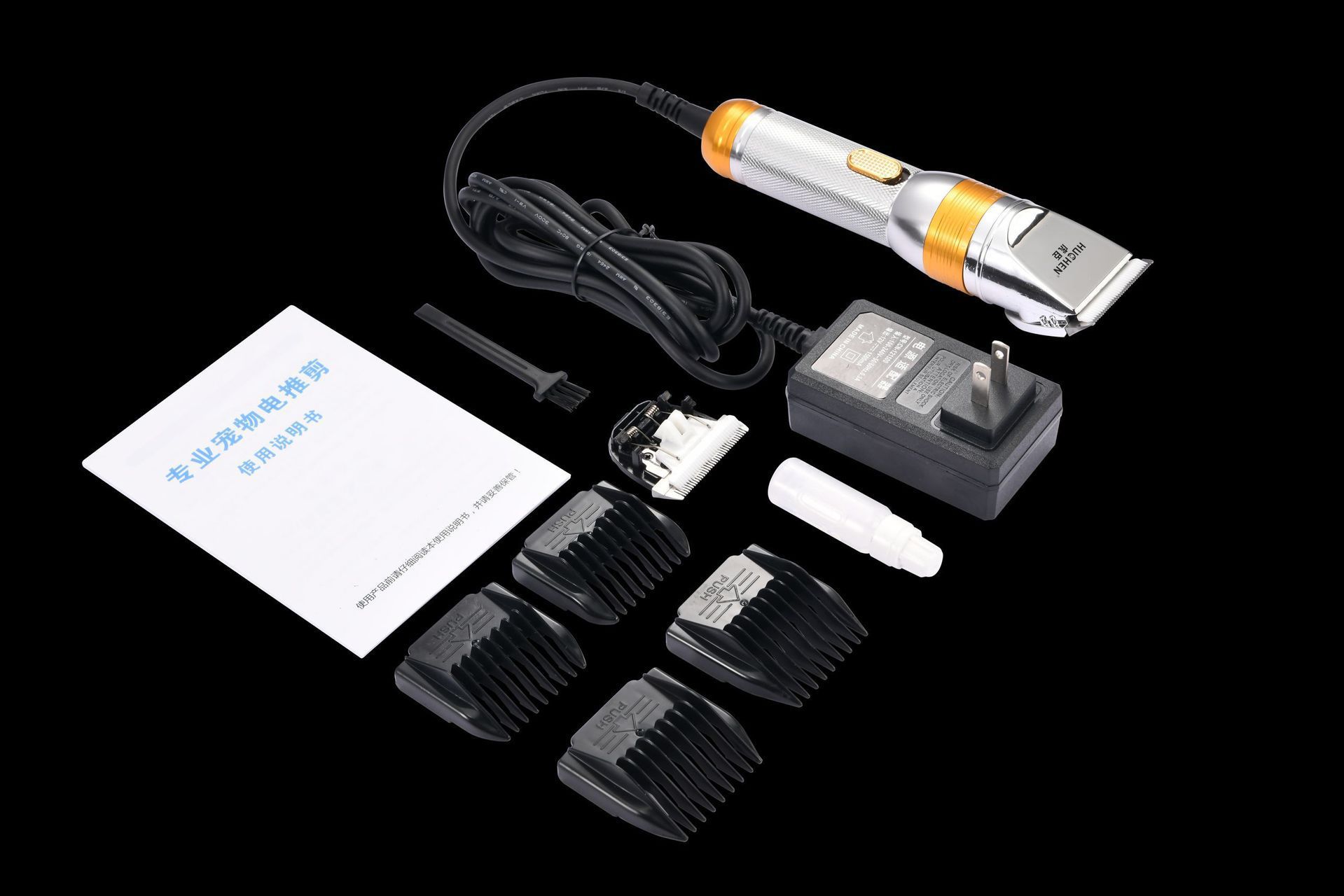 Acessórios do produto: caixa de embalagem, manual de instruções, quatro pentes limitadores, uma garrafa de óleo lubrificante, uma escova de limpeza, lâmina sobressalente