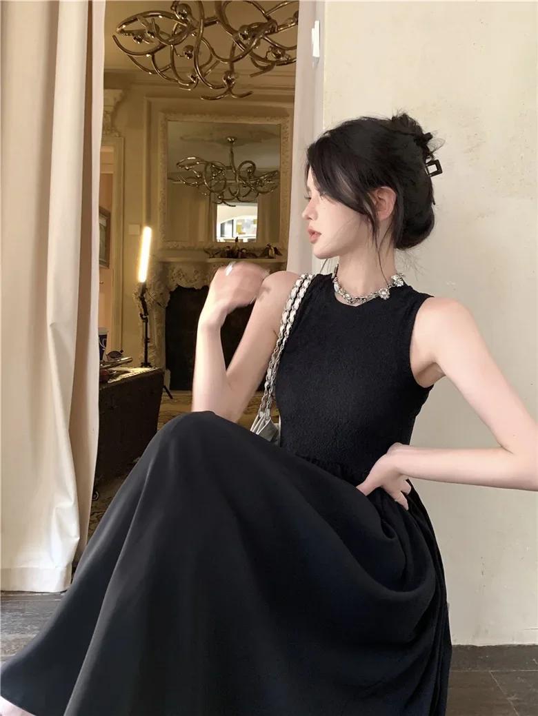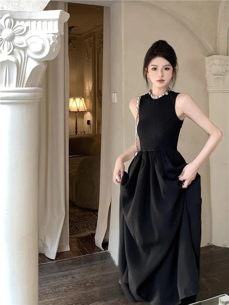 Vestidinho Preto Emagrecedor Feminino, Gola Redonda, Sem Mangas, Vestido Retrô Francês de Verão, Design com Saia Vazada Sem Costas