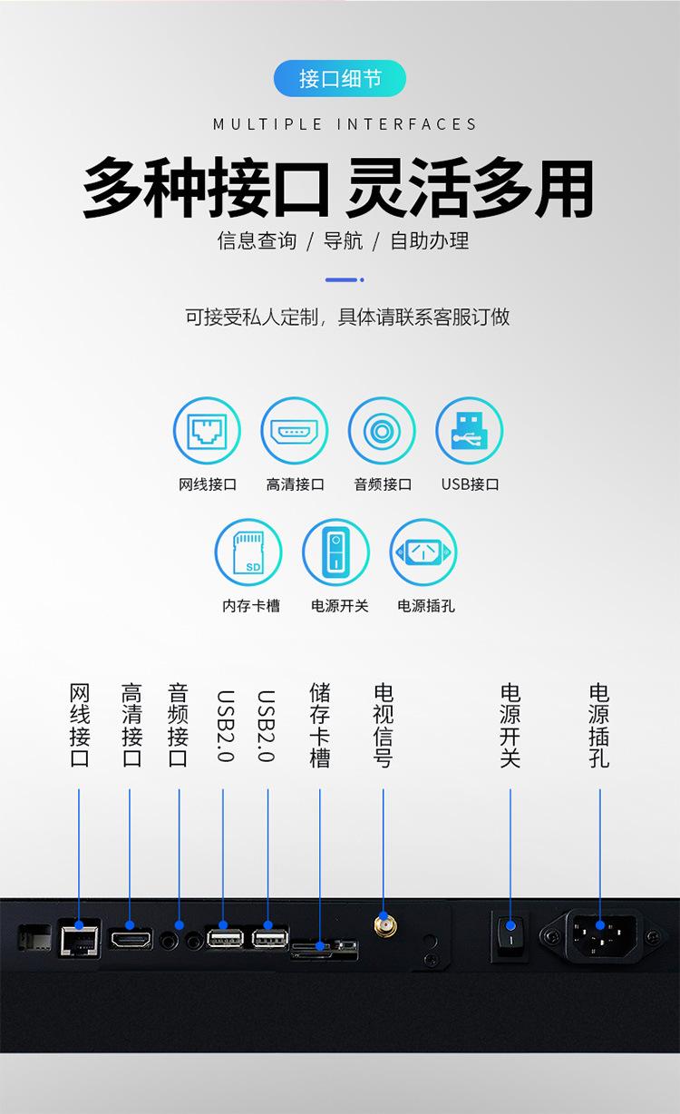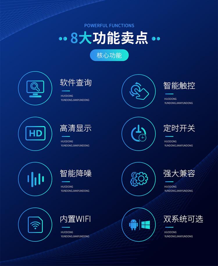 A versão de rede é um sistema Android, pode importar e reproduzir materiais usando um pen drive USB, pode conectar-se a uma rede WiFi e usar software para enviar e reproduzir programas remotamente, o toque Android adiciona uma função de toque à versão WiFi, principalmente para interação por clique do cliente e consulta por toque, e também inclui todas as funções da versão WiFi, o toque Computador é um sistema Windows, equivalente a um computador sensível ao toque, e também inclui toque de rede e outras funções, vídeo, imagem, texto, tela dividida, tela cheia, ligar/desligar personalizado e outras funções.