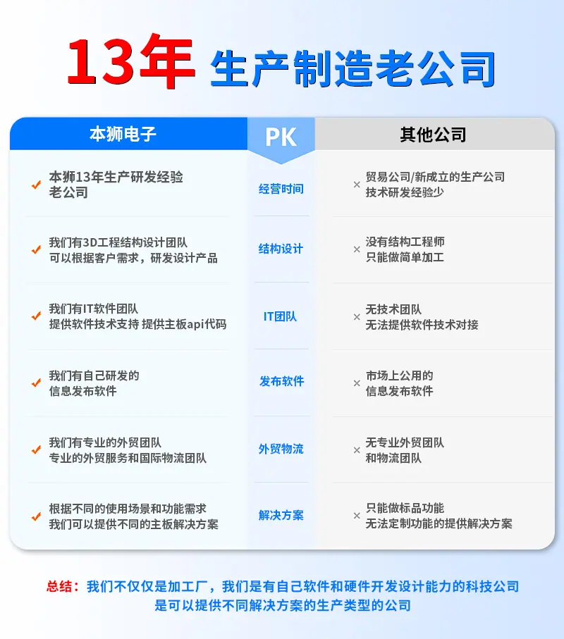 Guangzhou Benshi Electronics Co., Ltd., 13 anos de produção profissional e pesquisa e desenvolvimento de telas de publicidade de vários tamanhos e estilos, multifuncionais, soluções multi-placa-mãe, com software de liberação de informações correspondente. Liberação por celular, liberação por computador, toque e não toque opcionais, suporte para liberação remota WiFi, liberação LAN, liberação WAN, suporte para módulo 4G, pacote de cartão de tráfego correspondente, serviço completo, preço preferencial, vendas diretas da fábrica!