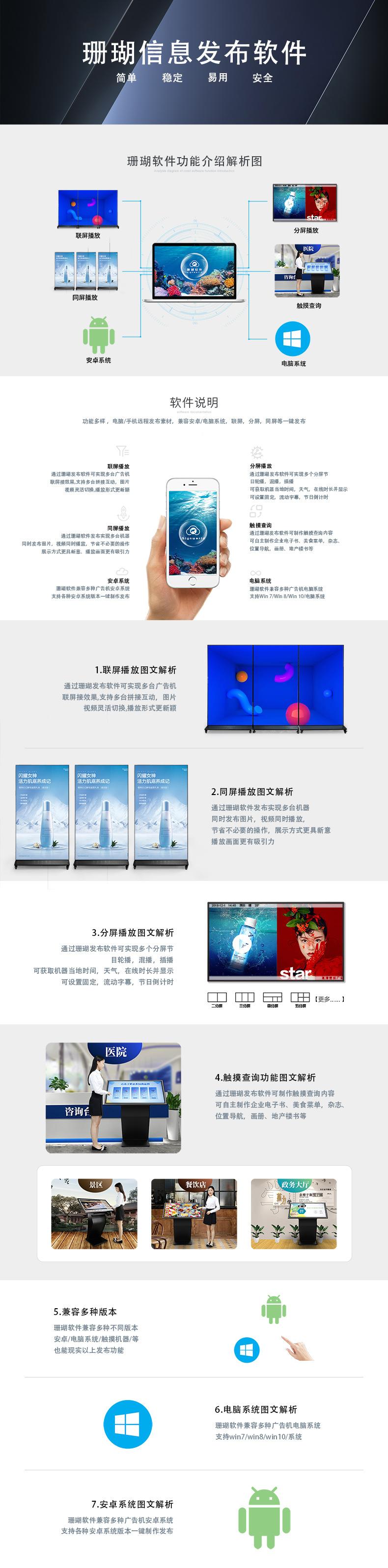 Pode tela dividida, tela cheia, vídeo, imagem, texto, documento, música tudo funciona, os materiais inseridos podem fazer loop automaticamente, definir o tempo de comutação da tela de reprodução, ligar/desligar programado, pode importar materiais de reprodução via pen drive USB, ou pode usar software para envio remoto, tudo é muito simples, o software para envio remoto pode ser logado e operado em qualquer computador!
