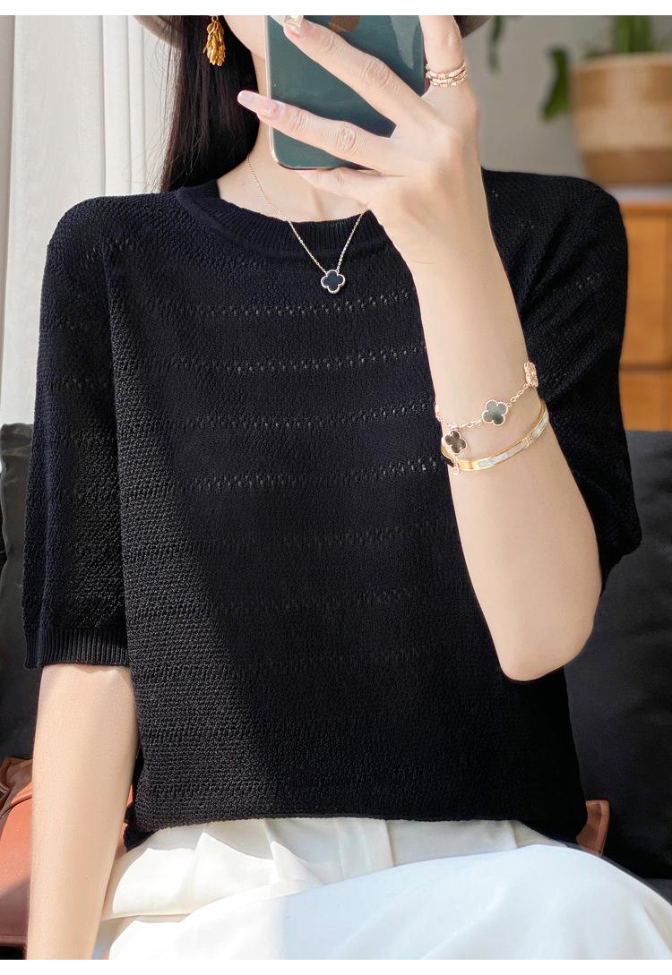 Camiseta feminina de malha fina de seda gelada de verão, manga curta, gola redonda, fina, respirável, solta, tamanho grande, meia manga, cor sólida