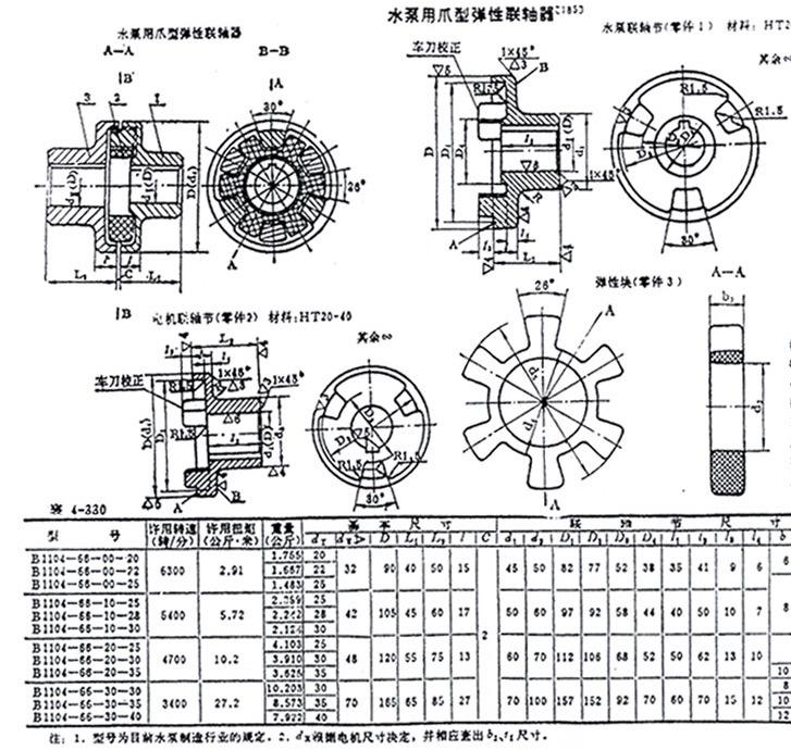 O acoplamento de garra é um tipo de acoplamento de bomba de água. O controle deslizante do meio é feito de baquelite reforçado com tecido ou poliuretano. O código padrão na indústria de bombas de água éBl104.① O controle deslizante do meio do acoplamento de garra é feito de baquelite reforçado com tecido ou náilon; ② É pequeno em tamanho, leve em peso, simples em estrutura, fácil de instalar e barato, e é frequentemente usado em aplicações de baixa potência; ③ Tem uma pequena força de inércia e é adequado para conectar dois eixos com baixo torque, alta velocidade e nenhum impacto brusco. O controle deslizante de náilon transmite menos torque, mas é mais adequado para operação em alta velocidade e não requer lubrificação; ④ O deslocamento radial relativo permitido(0,01d+0,25)mm,dO diâmetro do eixo(milímetros); Deslocamento angular relativo permitido0Toda vez40A força radial adicional do acoplamento é(0,1~0,3)P⑤O código padrão para a indústria de bombas de água éBl104, seu torque máximo permitido é850N·eu, o diâmetro máximo do eixo é50mm