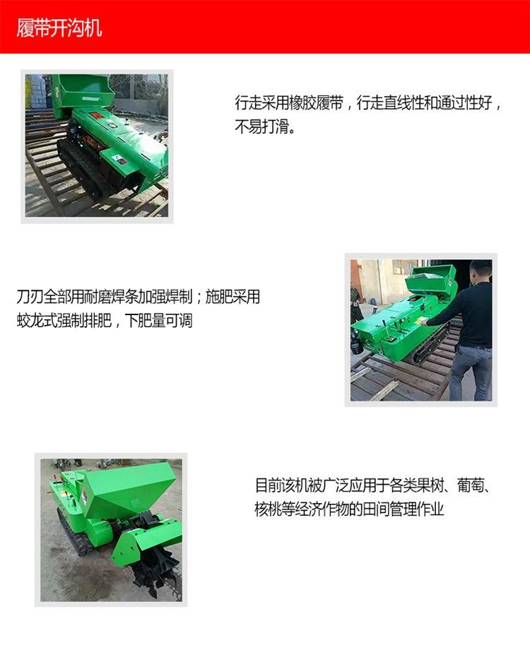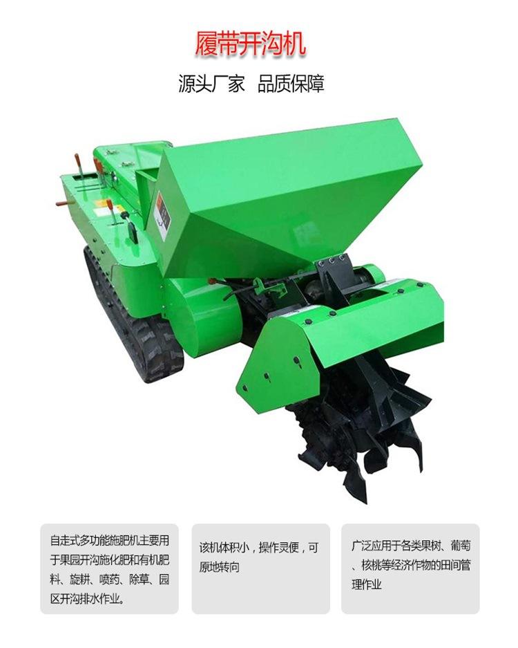 Gran aplicabilidad: Adecuado para diversas zonas montañosas, colinas, llanuras, campos secos, invernaderos, huertos y zonas estrechas. Apto para diversos tipos de suelo: suelo congelado, suelo duro, arcilla, suelo negro, montaña y suelo blando.El esparcidor de fertilizantes de zanja sobre orugas multifuncional puede operar en huertos, pequeñas parcelas de tierra, invernaderos, plantaciones de té, colinas, montañas y otros terrenos y tipos de suelo diferentes que son inaccesibles para maquinaria grande.