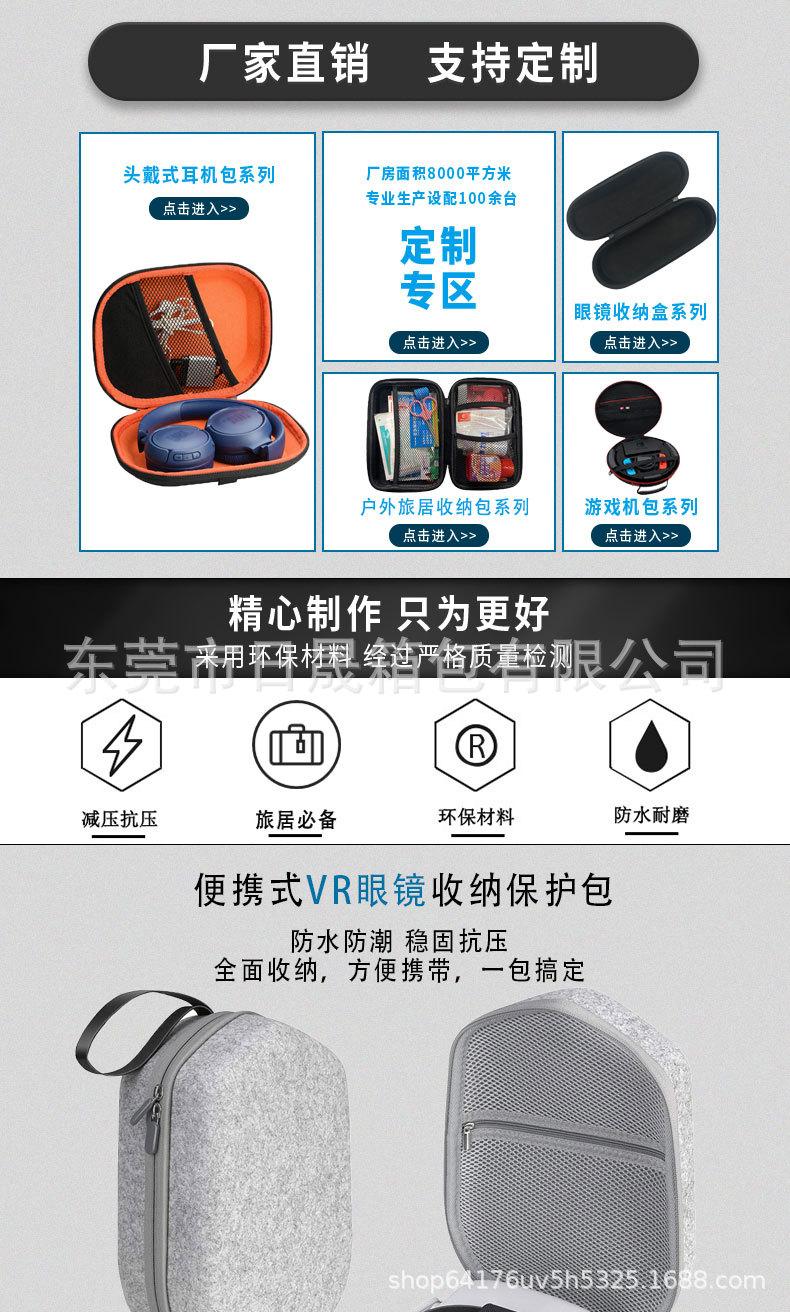 La empresa ha desarrollado y producido más de 100 bolsas de EVA. Se dividen principalmente en tres series: bolsas de EVA para productos electrónicos, bolsas de EVA para viajes y actividades al aire libre, y bolsas de EVA para artículos de primera necesidad. La empresa ofrece personalización y se centra en la producción de bolsas 3C para equipos digitales, instrumentos, deportes al aire libre y otros artículos: 1. Bolsas de EVA: bolsas para auriculares, bolsas para ordenador, maletines, bolsas para herramientas, bolsas para instrumentos musicales, bolsas para CD, bolsas para consolas de videojuegos, bolsas para cámaras, bolsas para deportes al aire libre;