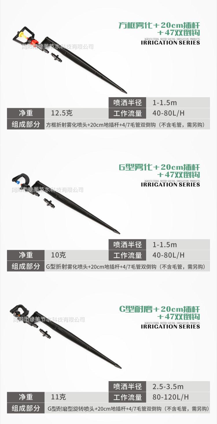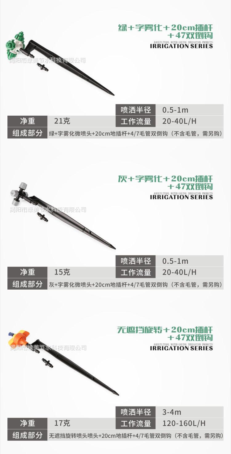 A Jieyang Lvmei Water Saving Technology Co., Ltd. lida principalmente com produtos de irrigação para economia de água agrícola e ferramentas de irrigação para jardins domésticos. Os produtos de irrigação para economia de água agrícola incluem principalmente: filtros centrífugos, filtros laminados, filtros de malha, aplicadores de fertilizantes venturi, microaspersores rotativos, microaspersores atomizadores refrativos, gotejadores de compensação de pressão, gotejadores de fluxo ajustável de 8 furos, gotejadores de bandeira vermelha, aspersores de braço oscilante ajustável, aspersores de chuva borboleta, tubos e conexões de PE, fitas e conexões de irrigação por gotejamento de remendo, tubos capilares e acessórios 3/5 4/7 8/12, perfuradores, etc.!Os produtos são amplamente utilizados em pulverização de campos agrícolas e irrigação por gotejamento; irrigação por microaspersão de plantio em estufas; irrigação de manutenção de projetos de ecologização de jardins e estradas; irrigação de ecologização tridimensional interna; bem como resfriamento e desinfecção de criação de gado e aves.