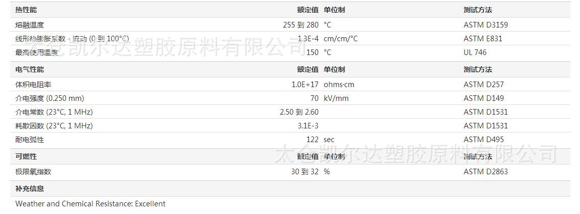 Isso mostra que o ETFE é um material resistente com um bom equilíbrio de propriedades mecânicas - resistência extremamente forte ao rasgo, alta resistência à tração, dureza média, excelente resistência ao impacto e longa vida útil telescópica. O ETFE é um bom material dielétrico com alta resistência de isolamento, uma constante dielétrica de 2,6, alta resistividade e um baixo fator de dissipação de apenas 0,003. Sua baixa constante dielétrica é basicamente constante sob mudanças de frequência e temperatura.