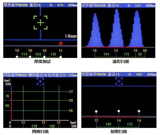 ◆Cada modo de detección es intuitivo y preciso, mostrando con precisión la posición, el espaciamiento y el espesor de la capa protectora de las barras de acero en la misma pantalla;