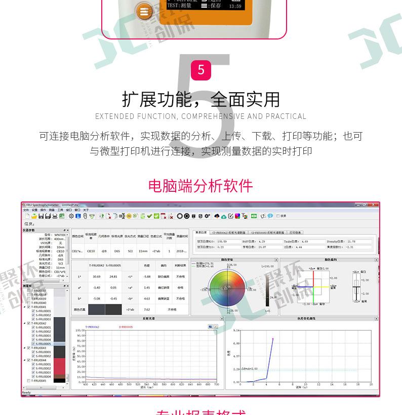 O espectrofotômetro 700D pode se comunicar com o software do computador host do lado do computador (opcional). O software do lado do computador pode ser usado para expandir as funções do instrumento e pode realizar funções como análise de dados, upload, download, impressão e entrada manual de valores LAB. ; Ele também pode ser conectado a uma micro impressora (opcional) para realizar a impressão em tempo real de dados de medição.