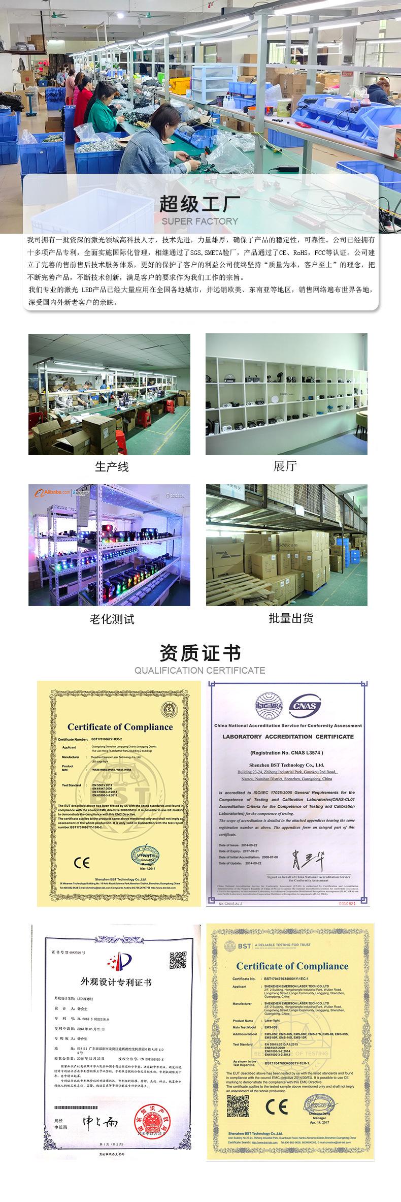 2. Nossa empresa produz todos os lasers (fontes de luz) usados em luzes laser por nós mesmos, em vez de montá-los comprando módulos laser do mercado (usados para ponteiros laser, que só funcionam por um curto período, têm materiais ópticos internos baratos, são propensos a falhas de luz após operação de longo prazo e têm baixo brilho e estabilidade), garantindo assim a qualidade do produto.