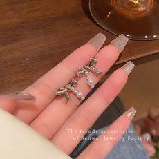 | |  | Brincos de pérolas de arco de prata estilo frio para mulheres, design de nicho versátil, brincos de temperamento, brincos novos de estilo coreano | | | |
