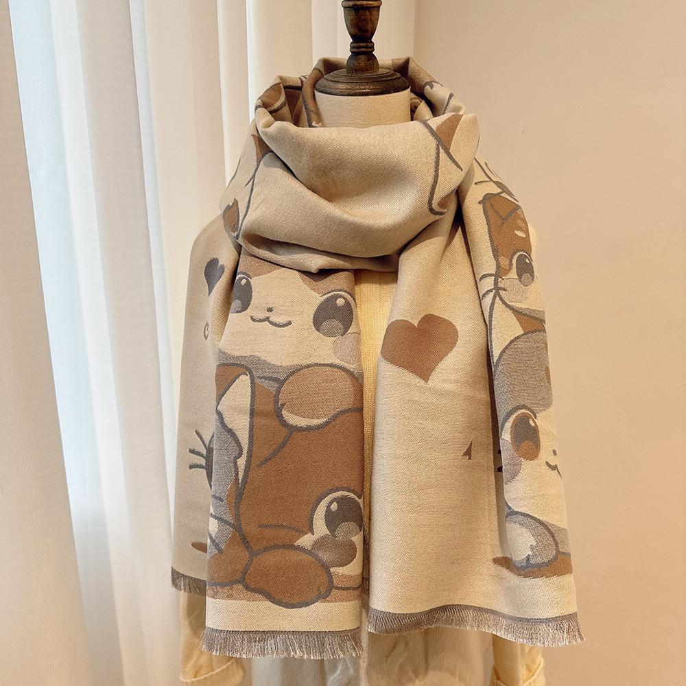 Um cachecol de cashmere indispensável para o outono e inverno, tem um toque suave e delicado, cores contrastantes populares e um padrão de estampa "stacked cat" super fofo que é único e moderno. As cores também são versáteis e podem ser usadas como cachecol ou xale.