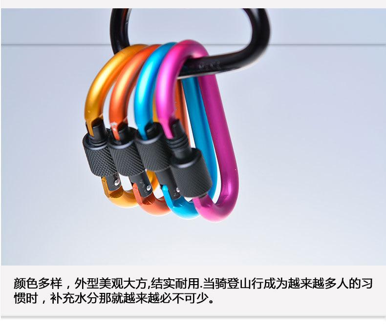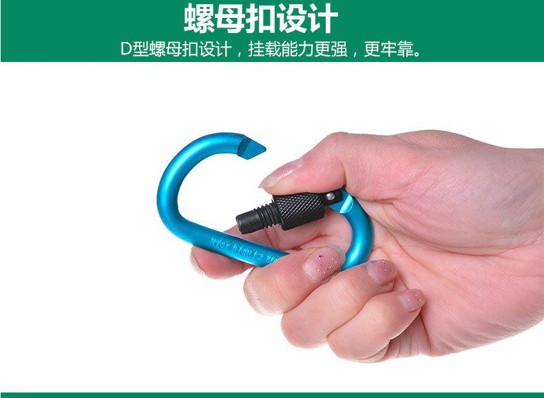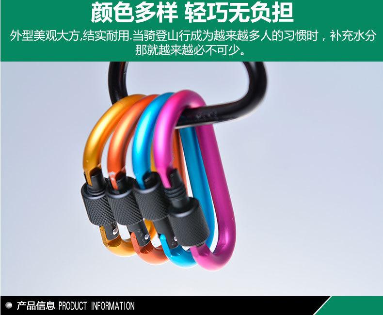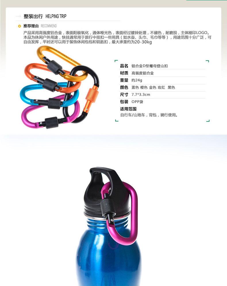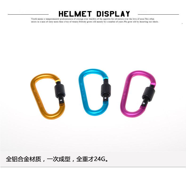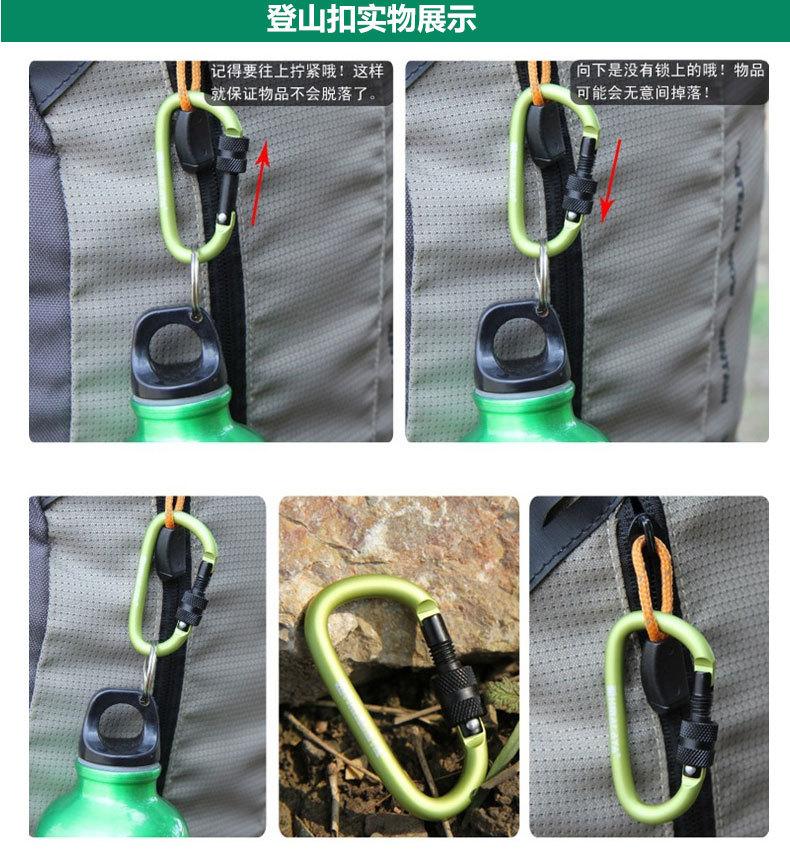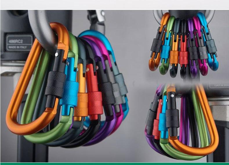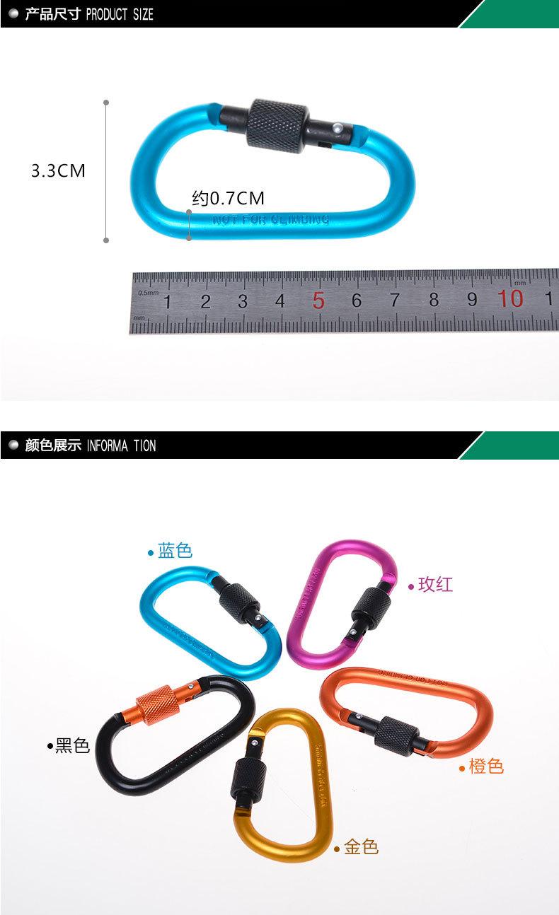 Feito de liga de alumínio duro, é extremamente duro. É feito de liga de alumínio em forma de D com tratamento de polimento, que é à prova d'água, resistente ao desgaste, de alta resistência e durável. Pode ser pendurado em mochilas, chaveiros, garrafas de água e todos os locais necessários, podendo ser usado para conectar barracas, cordas, etc.