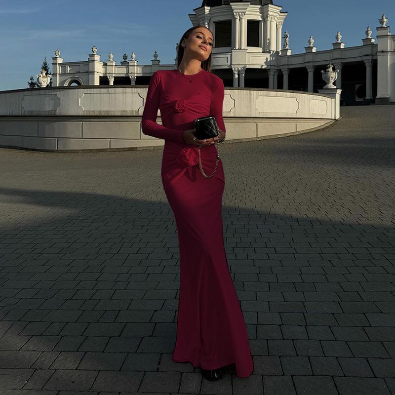 Compre 2024 Outono e Inverno Novo Comércio Exterior Europeu e Americano Transfronteiriço Sexy Apertado Vestido de Gola Redonda Flor Plissada Vestido Elegante Mulheres no atacado no Joom.pro