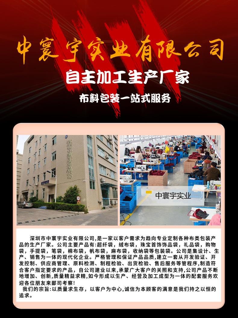 Shenzhen Zhonghuanyu Industrial Co., Ltd. é especializada na produção de várias sacolas de veludo para presentes de alta qualidade, sacolas para embalagens de produtos eletrônicos, sacolas de algodão e linho, sacolas de armazenamento e outros produtos de sacolas. Este produto é principalmente adequado para suportar embalagens de vários produtos eletrônicos, como fontes de alimentação móveis, bastões de selfie, fones de ouvido, câmeras digitais, telefones celulares, discos rígidos móveis e outros produtos digitais eletrônicos; também pode ser usado para embalar relógios, canetas, cosméticos, joias e outros produtos. A empresa pode escolher vários materiais, como tecido e couro, para encomendar de acordo com os requisitos de cada cliente, e personalizar as especificações e imprimir o LOGOTIPO de acordo com os requisitos do cliente. Os produtos da empresa são todos feitos de materiais de alta qualidade e acabamento fino, e são baseados no mesmo mercado da indústria com "excelente qualidade, tempo de entrega preciso, preço razoável e serviço atencioso". "Qualidade em primeiro lugar, integridade em primeiro lugar" é o nosso princípio de serviço. Damos as boas-vindas aos clientes para enviar amostras, manuscritos e chamadas para negociar pedidos!