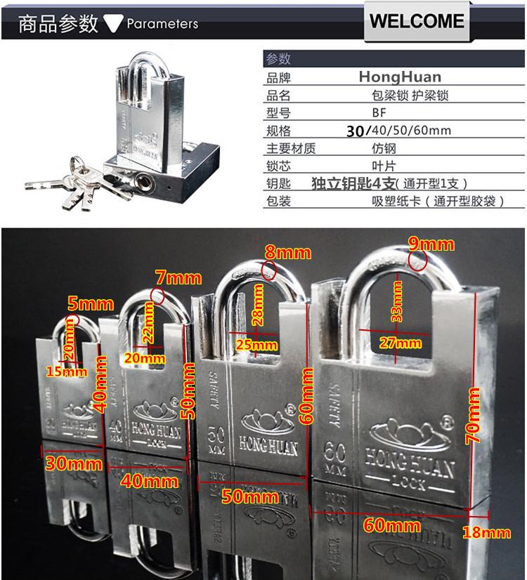 Especificações e materiais: cadeado de aço laminado a frio de meio grão de 30 mm, 40 mm, 50 mm e 60 mm