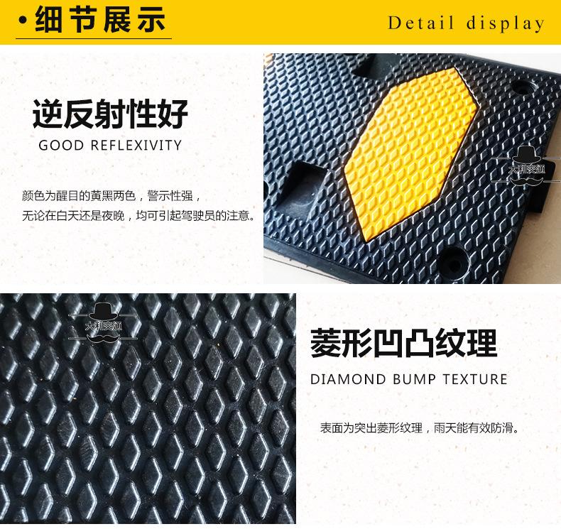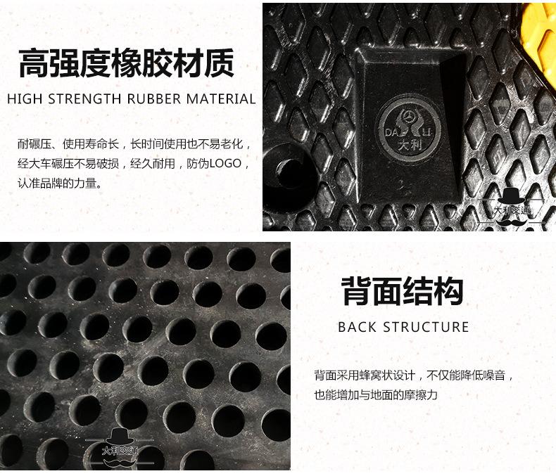 Os redutores de velocidade de borracha (também conhecidos como redutores de velocidade de borracha, faixas de proteção) são projetados com tecnologia de alta tecnologia com base no ângulo especial entre o pneu e o solo durante a condução. Eles são feitos de borracha especial e são resistentes à pressão, desgaste, clima e absorção de choque. Eles são adequados para cruzamentos de rodovias, faixas de pedágio, cruzamentos de cidades, cruzamentos de cinturões verdes, cruzamentos de postos de gasolina, etc. em cidades grandes, médias e pequenas. Depois de usar este produto, o carro fica seguro durante a condução e pode amortecer e desacelerar, melhorando a segurança dos cruzamentos de tráfego. Atualmente, este produto é uma instalação especial para segurança no trânsito. Os redutores de velocidade de borracha da marca Dali usam interfaces naturais convexas e côncavas correspondentes, que são mais convenientes e economizam mão de obra para instalar. O padrão usa padrões espinha de peixe, que são mais propícios à drenagem.