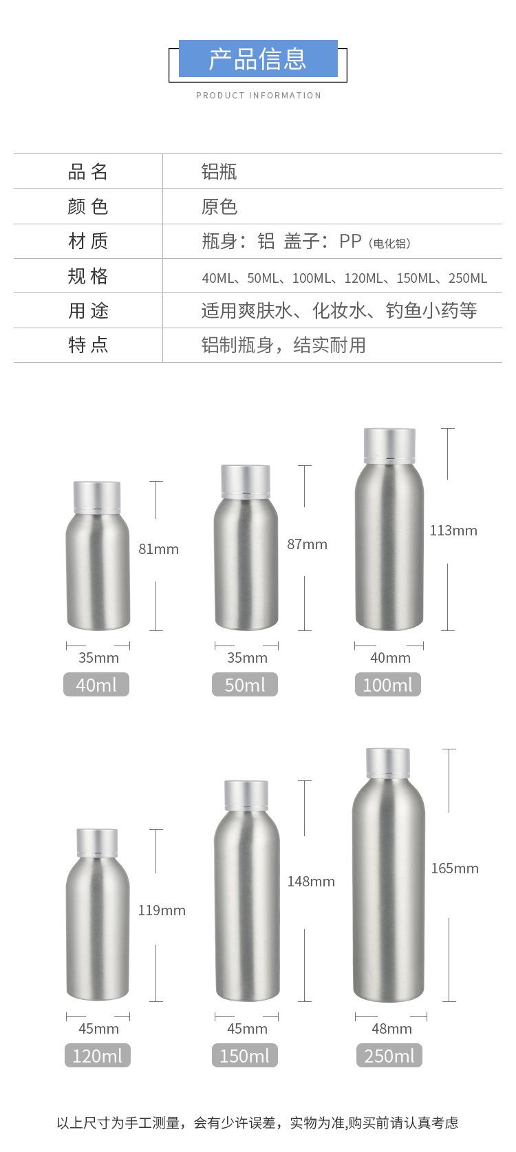 Nome do produto: Frasco de alumínio de 40-250ml + tampa de alumínio anodizado