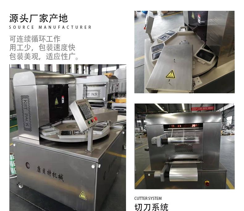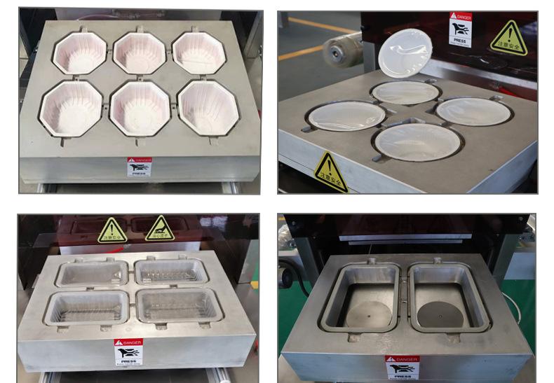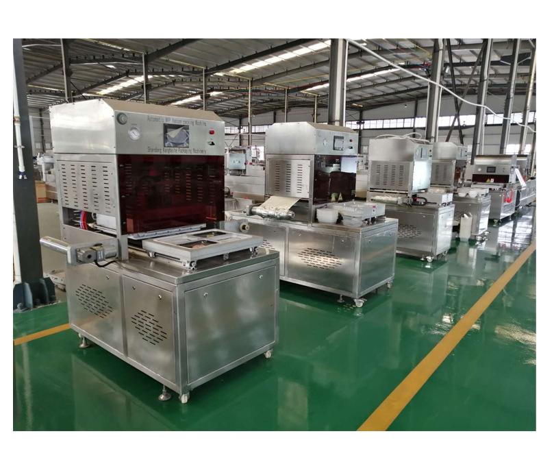 2. Primeiro coloque o produto na bandeja, depois coloque a bandeja no molde na área de descarga do equipamento. A bandeja entra no molde de vedação conforme a plataforma giratória (molde) gira. O molde de vedação desce, e o filme superior é preso à bandeja no molde de vedação. Primeiro, o nitrogênio ou gás misto é bombeado e então selado (o filme superior e a bandeja são selados juntos) e perfurado. O produto embalado continua a avançar conforme a plataforma giratória gira. O cilindro levanta a bandeja da porta de descarga, e a alavanca empurra a bandeja para fora para completar a embalagem do produto.