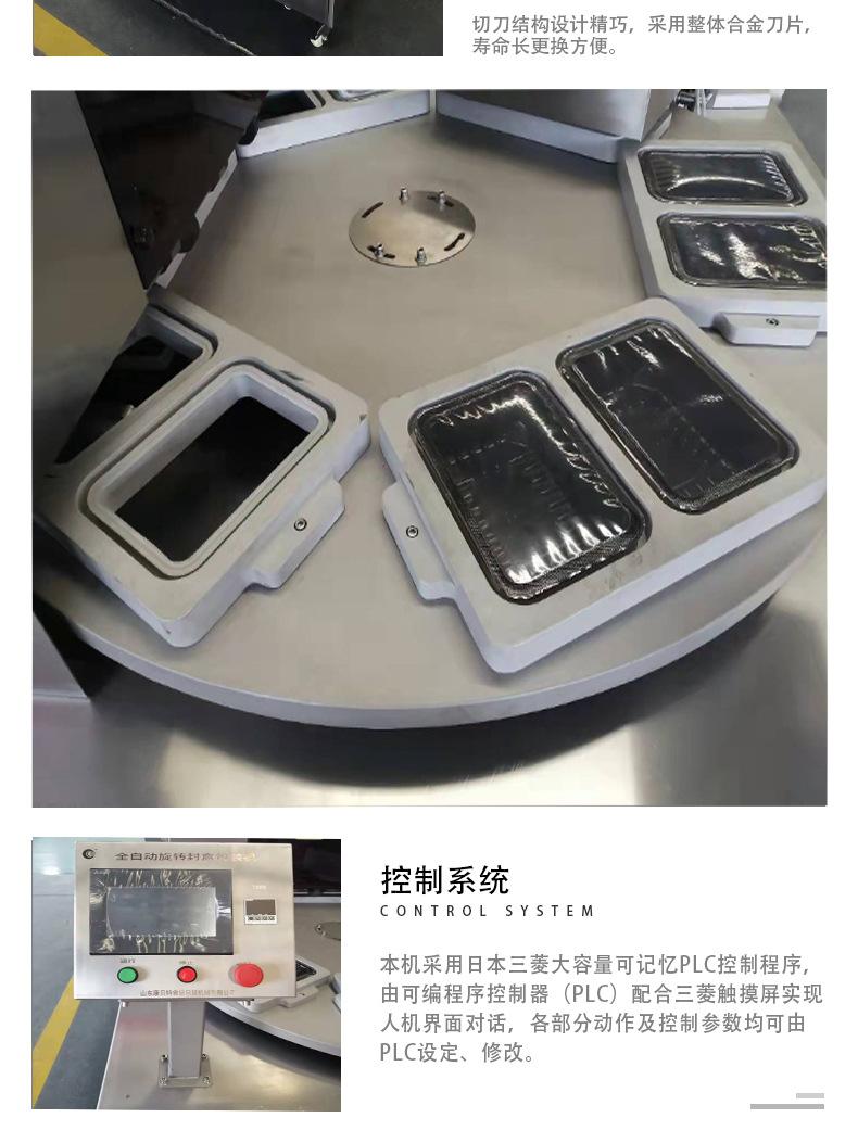 1. A máquina é rotativa, com 6 estações distribuídas no disco giratório. Cada estação tem um molde, dois dos quais são usados para colocar bandejas, um para inspeção de caixa de produto, um para selagem e embalagem de produto, um para empurrar materiais para fora, e a estação restante é uma posição reservada de segurança.