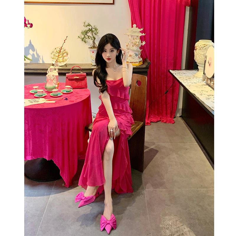 Compre Francês Retro Rosa Vermelho vestido branco estilingue indústria pesada vestido de babados e tornozelo-comprimento para viagens de férias no atacado no Joom.pro