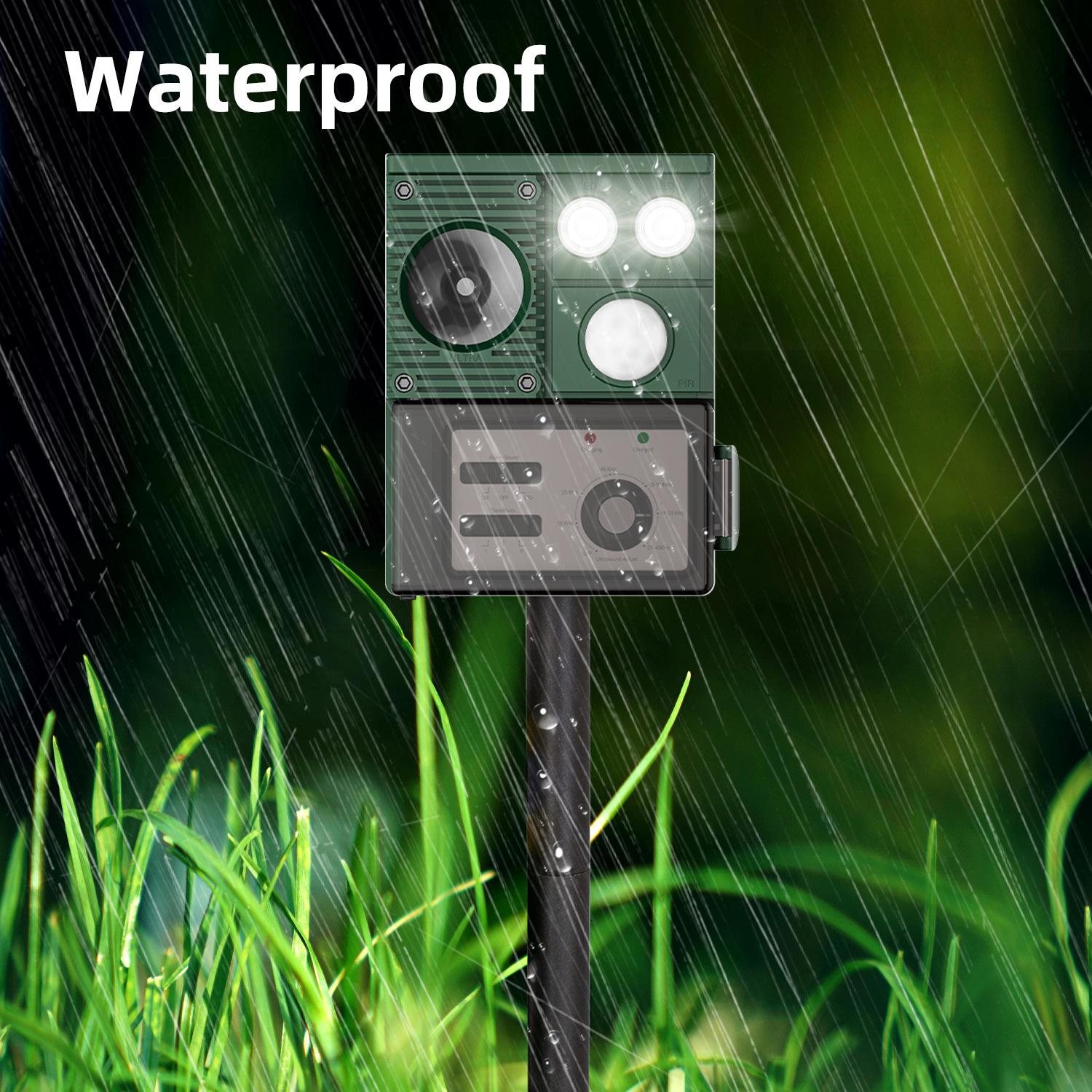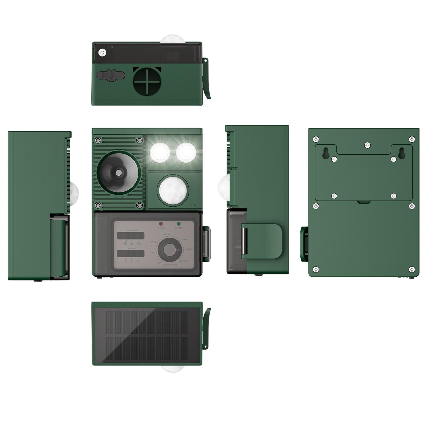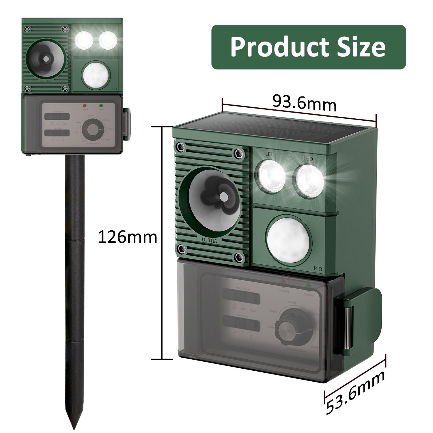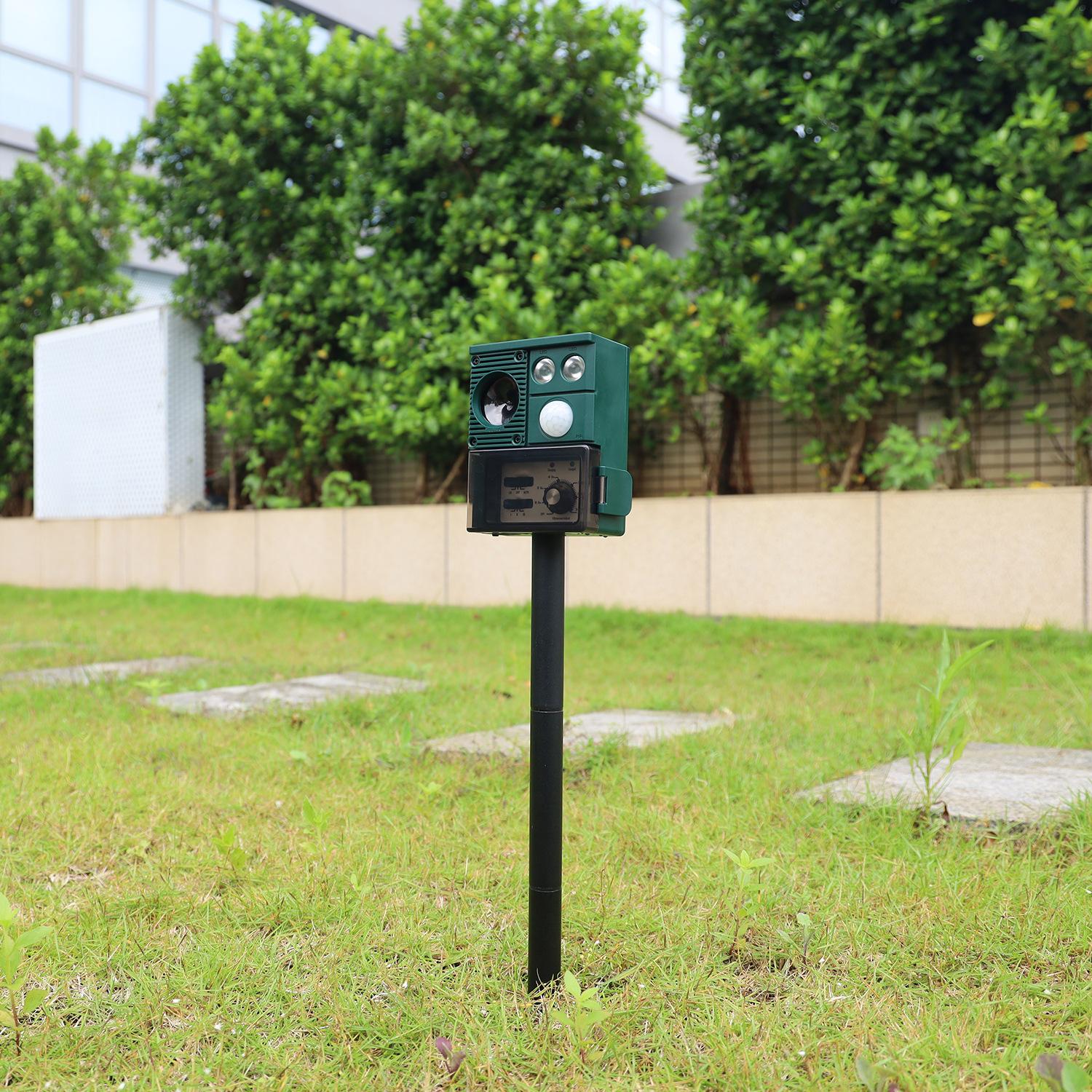 A través de ondas ultrasónicas de diferentes frecuencias, los nervios auditivos de los animales son estimulados repetidamente, las luces intermitentes estimulan los nervios ópticos de los animales, y el PIR se utiliza para detectar si los animales se están acercando. Una vez que se acercan al área protegida, el PIR activará el producto para que funcione, y el modo de trabajo inteligente estimulará repetidamente al animal, haciéndolo inquieto y huyendo de un entorno que no es adecuado para la supervivencia. Esto puede ahuyentar eficazmente a ardillas, ciervos, conejos, mapaches, zorrillos, gatos, perros, jabalíes, osos, zorros, etc.