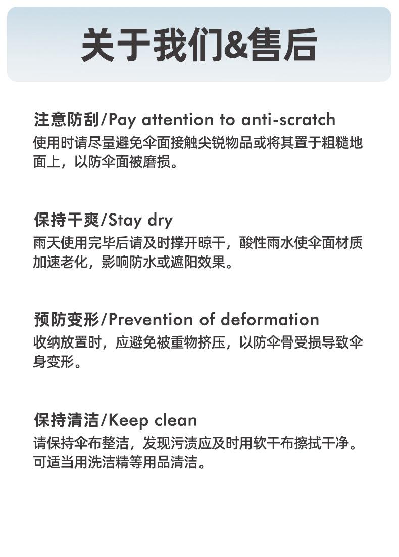 Guarda-chuvas são itens frágeis e possuem características especiais na entrega. Às vezes, eles podem ser danificados internamente devido a cargas e descargas violentas ou problemas de embalagem durante a entrega expressa. Portanto, os compradores devem inspecionar as mercadorias pessoalmente ao assiná-las. , se houver algum dano, registre imediatamente uma reclamação junto à empresa expressa ou entre em contato com a equipe de atendimento ao cliente. O melhor é tirar fotos ou obter um certificado do entregador expresso. Se não for constatado nenhum dano após a assinatura da mercadoria, a responsabilidade será da pessoa que a assinou. Por favor, coopere ativamente para evitar causar desconforto um ao outro ~~~~~~~~~~