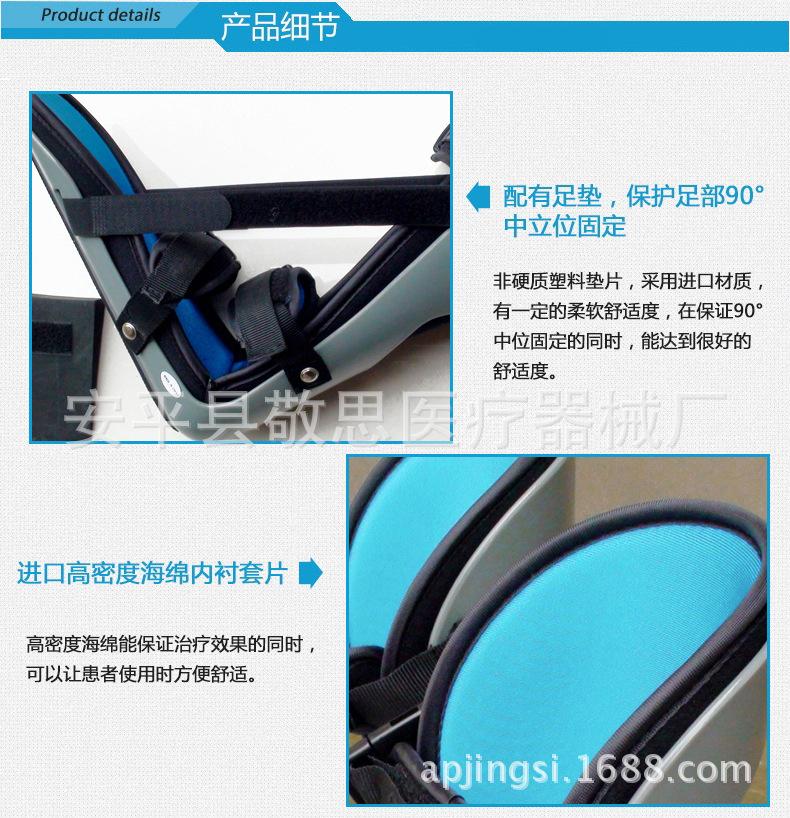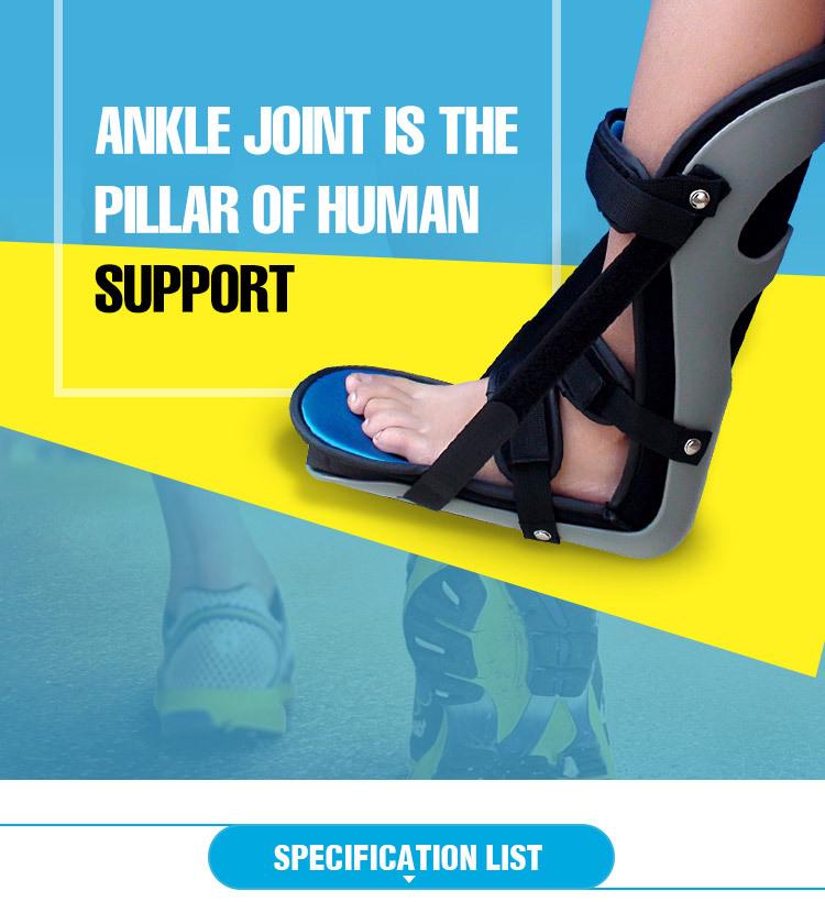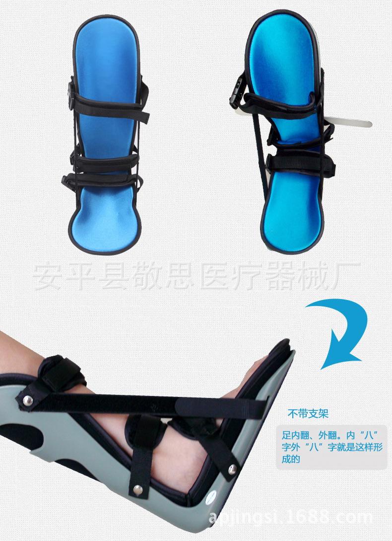 Función: Férula tobillo-pie que fija la articulación del tobillo en una posición funcional o utiliza un cordón para ajustar adecuadamente el ángulo fijo puede estabilizar y proteger la articulación del tobillo, prevenir la caída del pie y apoyar el pie con una tabla de soporte para el pie. También puede soportar la inversión y eversión del pie. Se utiliza a menudo para el cuidado del tobillo y del pie cuando se está acostado en la cama por la noche.
