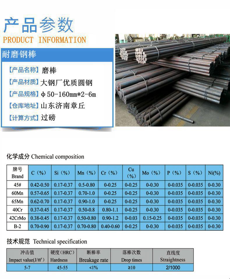 Processo de produção:As hastes de aço resistentes ao desgaste para moinhos de hastes são desenvolvidas e produzidas de forma independente por nossa empresa, usando um processo especial de tratamento térmico composto avançado e tecnologia de produção de linha de produção totalmente automatizada. As hastes de moagem tratadas termicamente têm alta dureza, propriedades mecânicas estáveis, sem flexão, sem hastes quebradas, sem hastes bagunçadas, sem duas pontas pontiagudas e baixo desgaste. O tamanho e a dureza podem ser ajustados de acordo com os requisitos do cliente (produtos convencionais HRC50-60), o que pode estender a vida útil das hastes de moagem e melhorar muito a eficiência da produção do moinho. É um produto famoso e de alta qualidade na província de Shandong e ganhou muitas patentes de invenção técnica e empresas provinciais de alta tecnologia.