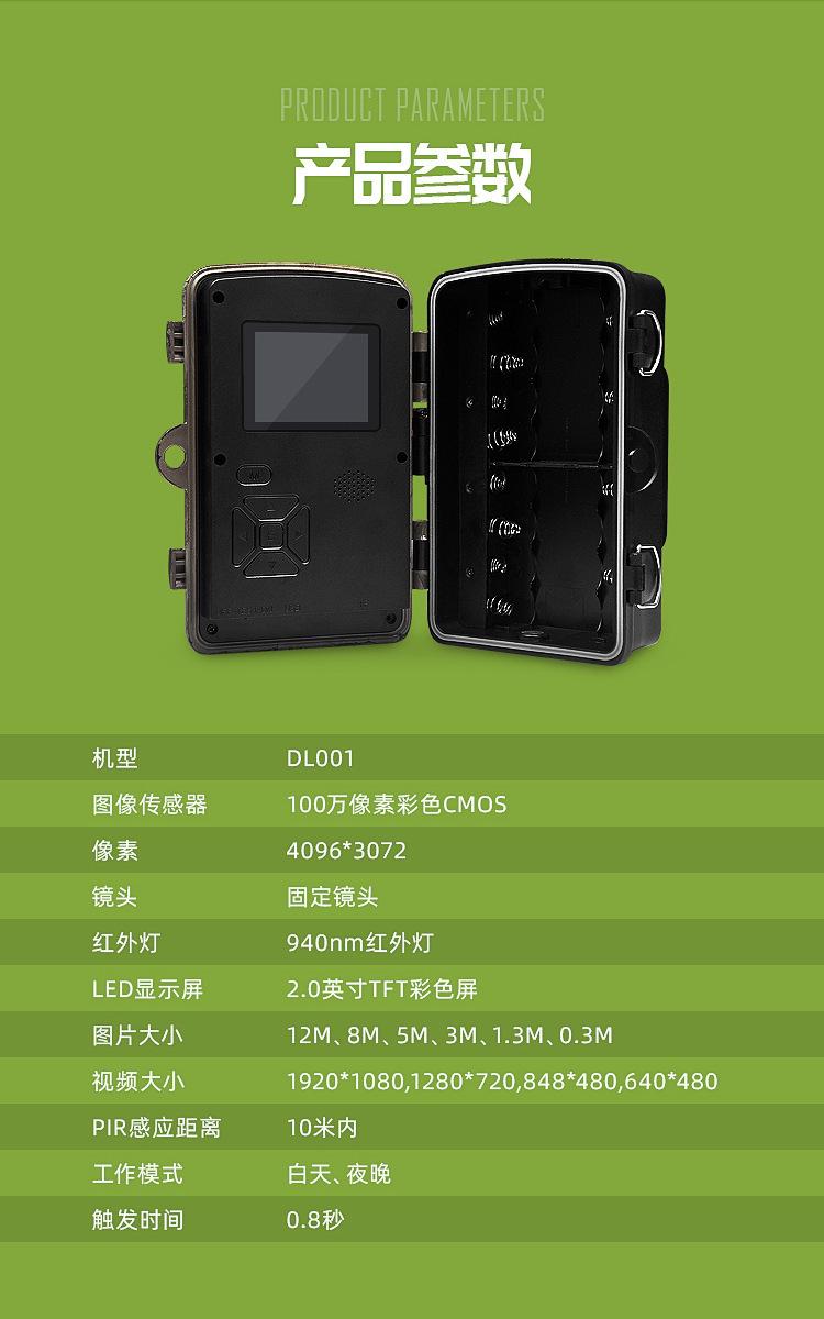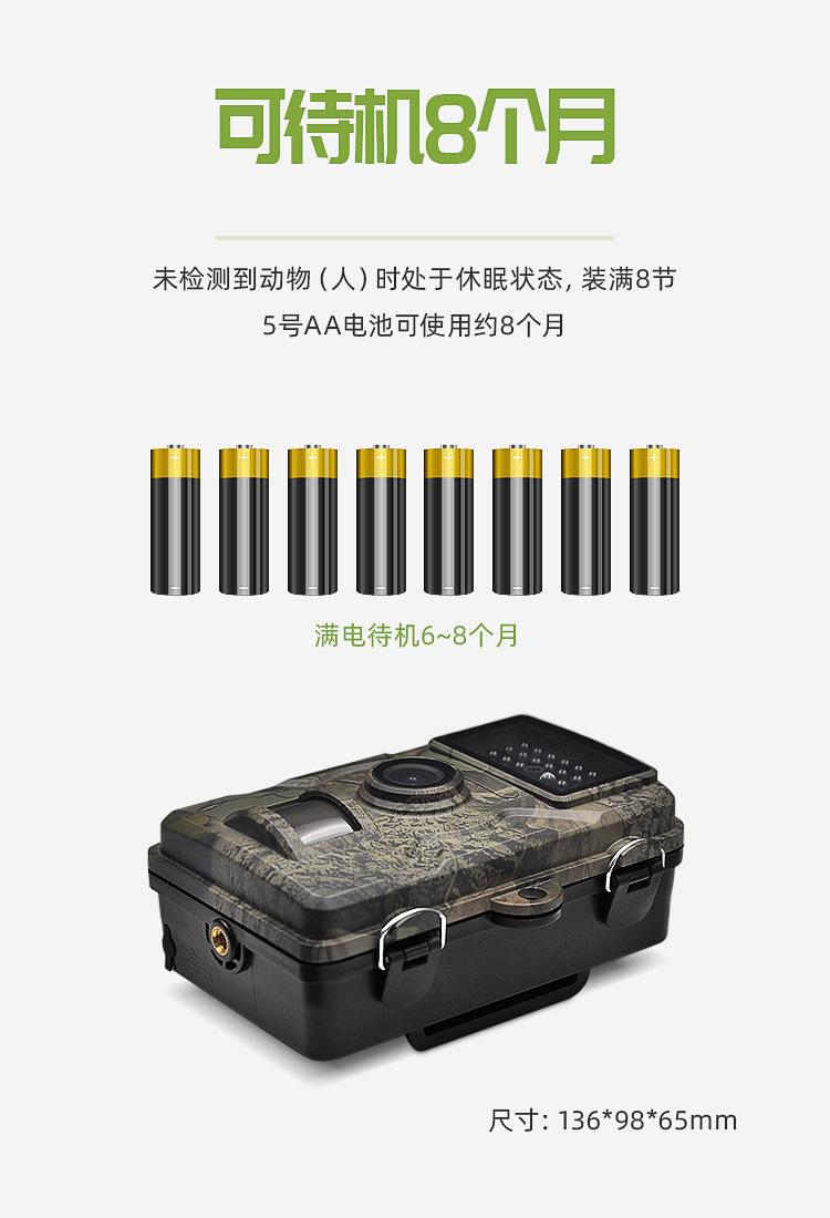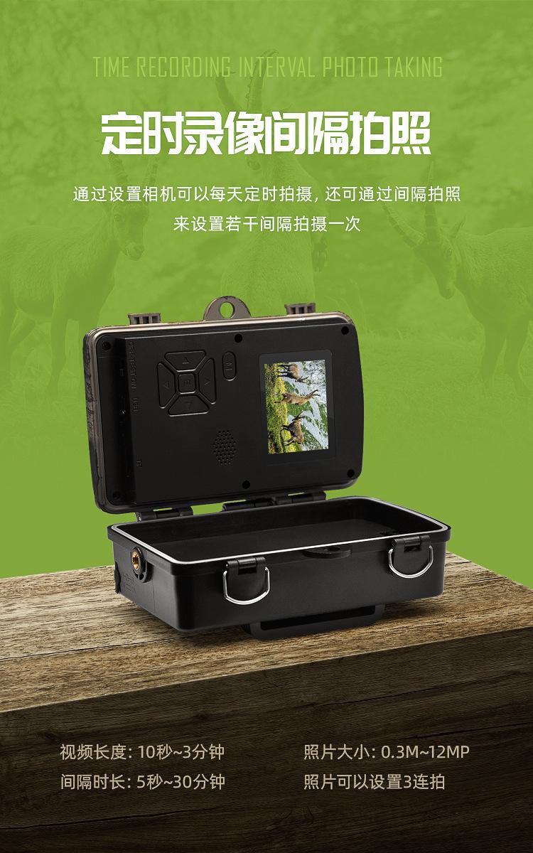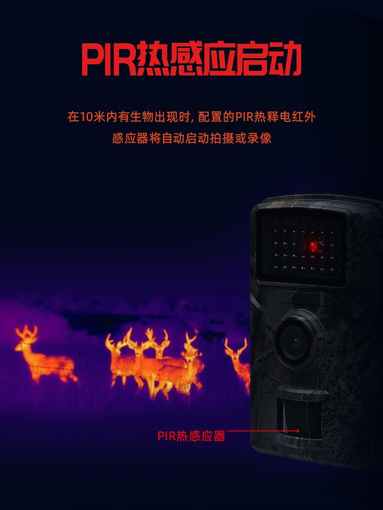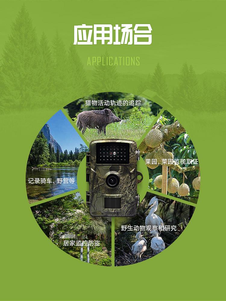 Esta câmera externa de pomar (também conhecida como câmera de detecção de vida selvagem) é um dispositivo de busca. É equipado com um sensor infravermelho piroelétrico PIR altamente sensível. Quando uma pessoa (ou animal) se move e provoca uma mudança de temperatura no ambiente externo, ele será acionado e automaticamente capturará fotos ou gravará vídeos em alta definição. Esta câmera pode realizar mais aplicações definindo temporizadores, intervalos e outras funções.