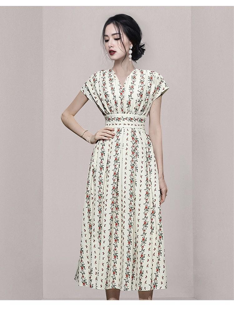 Vestido vintage estilo fresco com decote em V elegante plissado estampado, novo vestido feminino de verão com cintura justa e emagrecimento em linha A