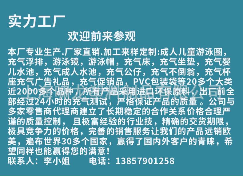 Nossa empresa está localizada em Xangai e Jinhua, Zhejiang. É um fabricante de produtos de esportes aquáticos, brinquedos e outros produtos. Os brinquedos aquáticos que operamos são populares no mercado consumidor. Nossos produtos desfrutam de um alto status entre os consumidores. A empresa estabeleceu relações cooperativas estáveis e de longo prazo com muitos varejistas e agentes. O preço é razoável. Com forte força, crédito, conformidade contratual e garantia de qualidade do produto, conquistamos a confiança dos clientes com as características de operação multi-variedade e o princípio de pequenos lucros, mas giro rápido.