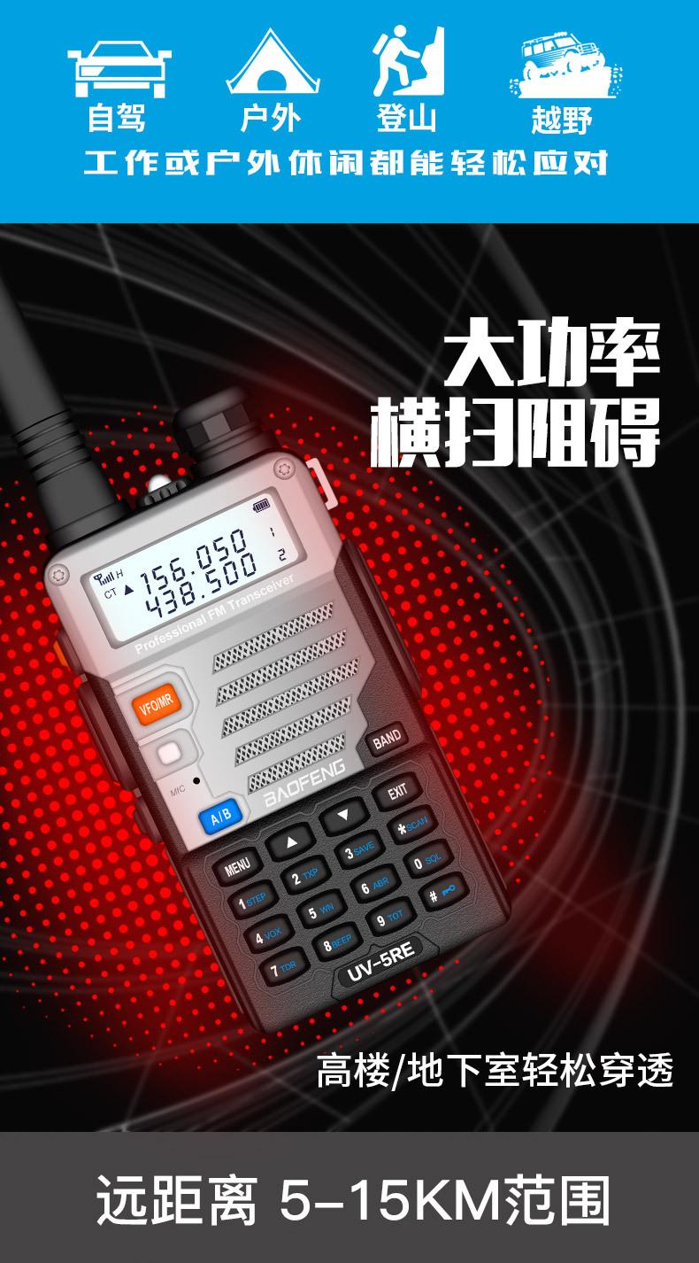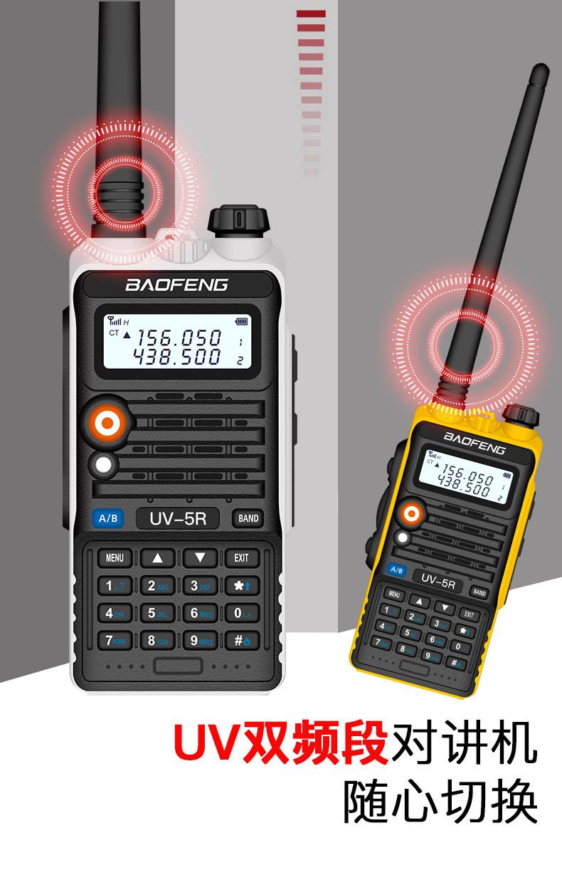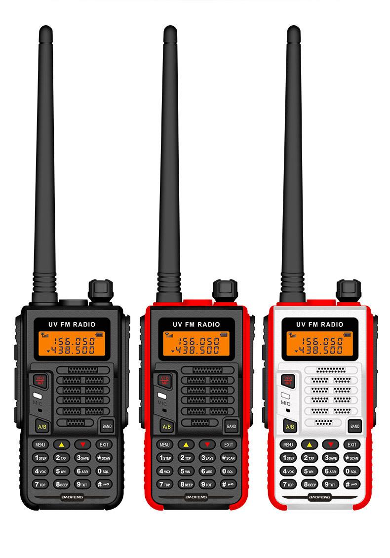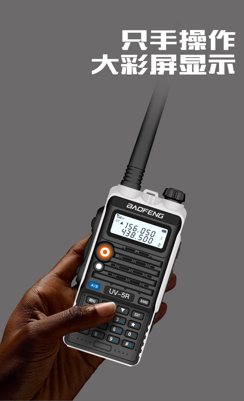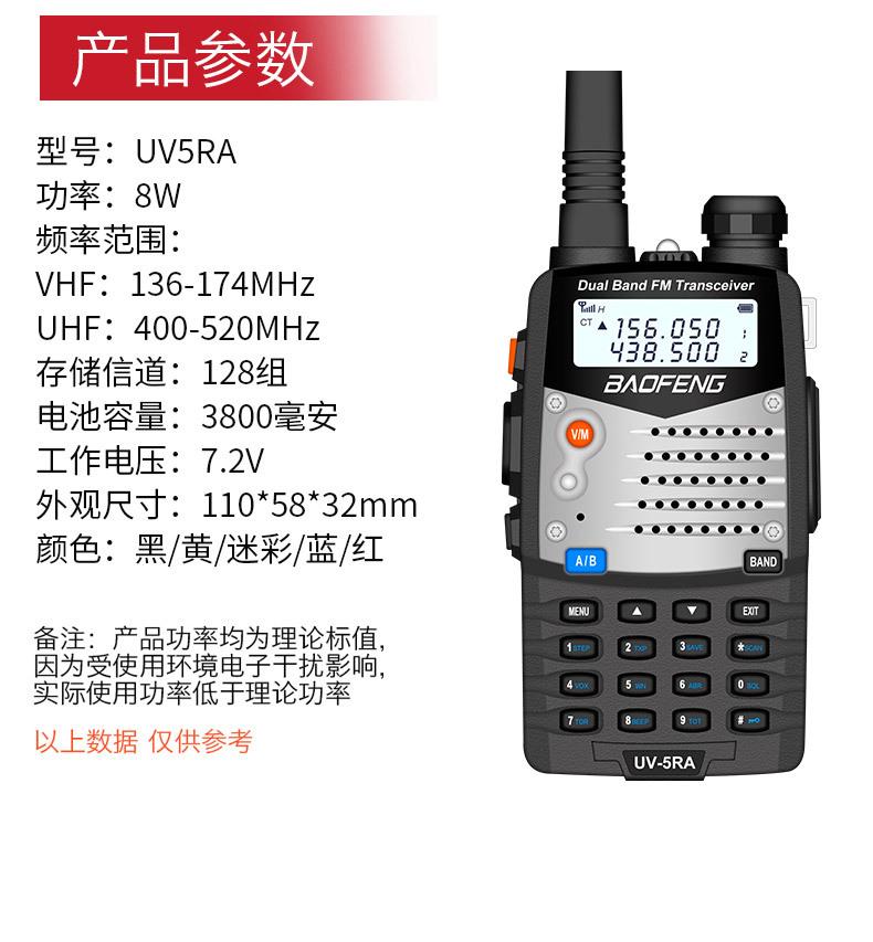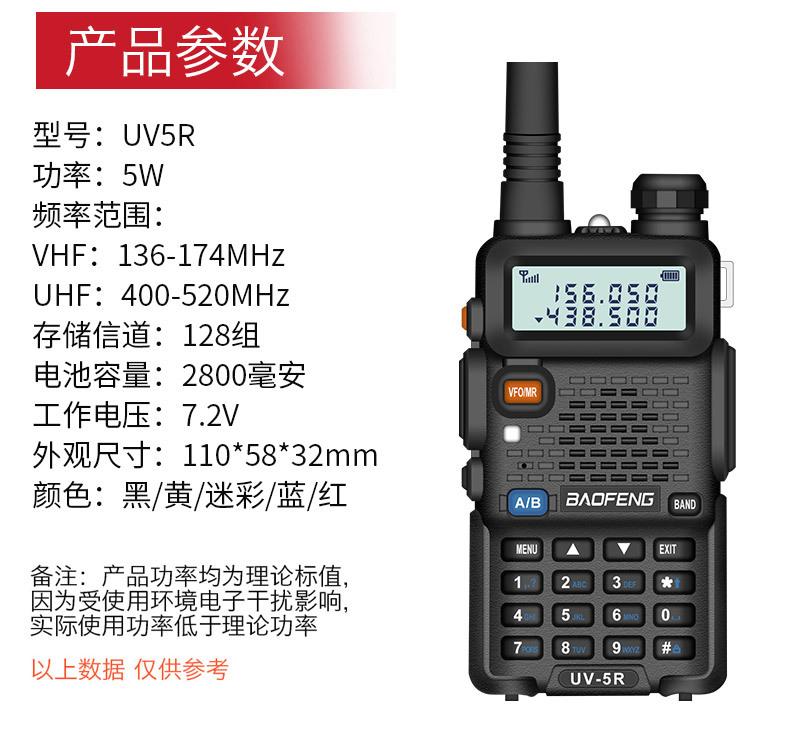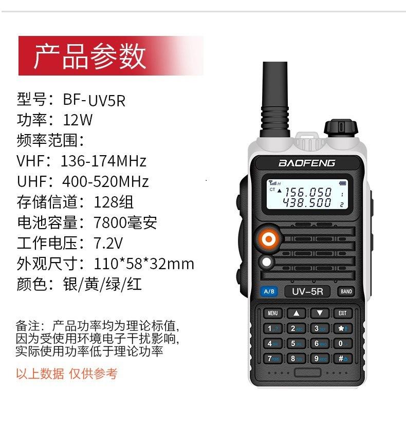 Com função de busca automática e exibição de sinalização CTCSS/DCS Com rádio novo, com função de iluminação por lanterna Com função de trabalho UU, VV, UV Com função de edição de nome de canal Com função de intercomunicação de banda dupla, com função de programação por computador Com função de controle de voz, frequência, varredura de canal Função de edição de tabela de varredura de canal (os canais podem ser livremente selecionados para participar da varredura) UV-5RE Faixa de frequência: FM: 65-108MHz (rádio, pode receber, não transmitir) VHF: 136.000-174.00MHz (VHF, transmite e recebe) UHF: 400-520.00MHz (UHF, transmite e recebe) Número de canais: 128 Tensão de trabalho: 7.2V DC Bateria de lítio 1800MAH Passo de frequência: 2.5/6.25/10/12.5/20/25KHz Estabilidade de frequência: ± 2.5PPM Impedância da antena 50Ω Tamanho: 99.7mm×54.4mm×31.7mm (altura×largura×espessura) (a altura nos dados acima não inclui a antena, a espessura inclui a bateria, o comprimento da antena é de cerca de 120mm e a espessura da bateria é de cerca de 15mm) Potência de saída do transmissor: alta ≥8W, baixa ≥3W Corrente: ≤1.4A (4W) Sensibilidade de modulação: 8-12mV Distorção de modulação: <10% Limite de modulação Banda larga <5KHz, banda estreita <2.5KHz Sub-áudio/sub-áudio digital Desvio de frequência: 0.75KHz±50Hz, 0.37KHz±30Hz Radiação espúria: <7μW Modo de modulação: 16KΦF3E/11KΦF3E Características de modulação: 6dB/por aumento de frequência Parte receptora sensibilidade de referência: -122dBm (12dB SINAD) Potência de áudio: 1W Distorção de áudio: <10% Largura de banda de recepção de modulação: 5K Supressão de ruído: ≥65dB Seletividade de canal adjacente (banda larga, banda estreita): ≥65dB, ≥60dB Intermodulação (banda larga, banda estreita): ≥60dB, ≥55dB Bloqueio: ≥85dB Configuração padrão: 1 unidade principal, 1 antena, 1 bateria, 1 carregador, 1 clipe de cinto, 1 cordão de mão, 1 manual de instruções, 1 caixa de embalagem.