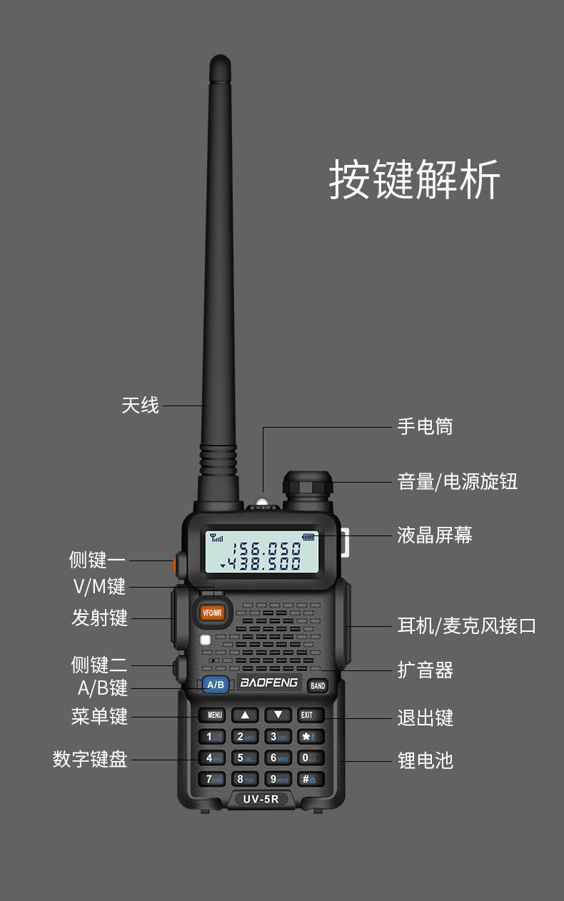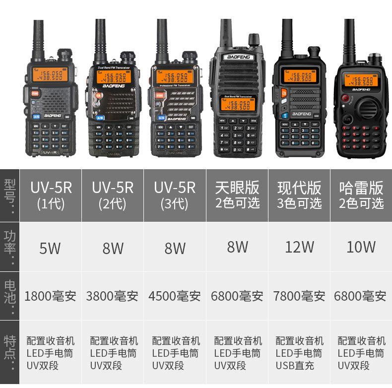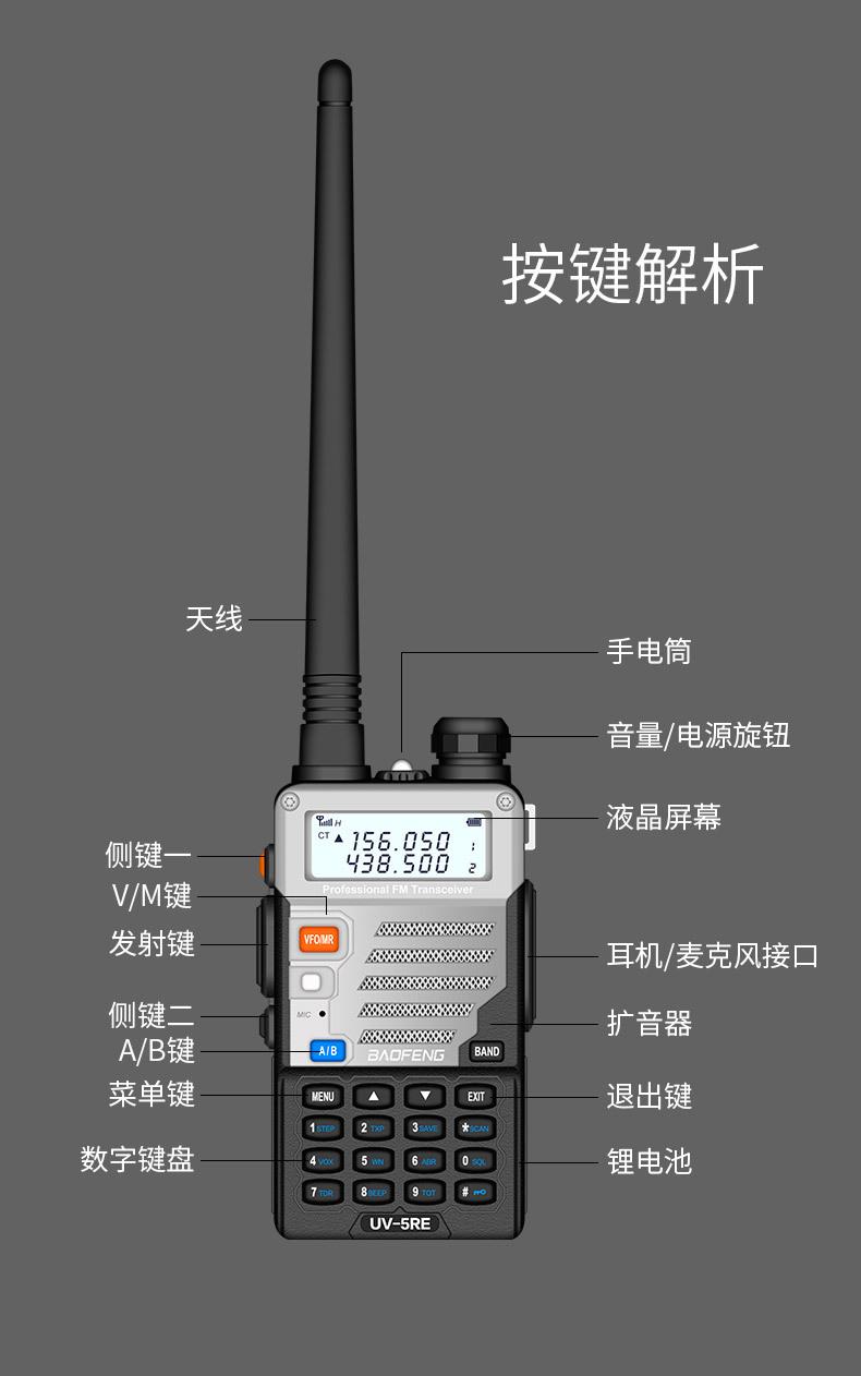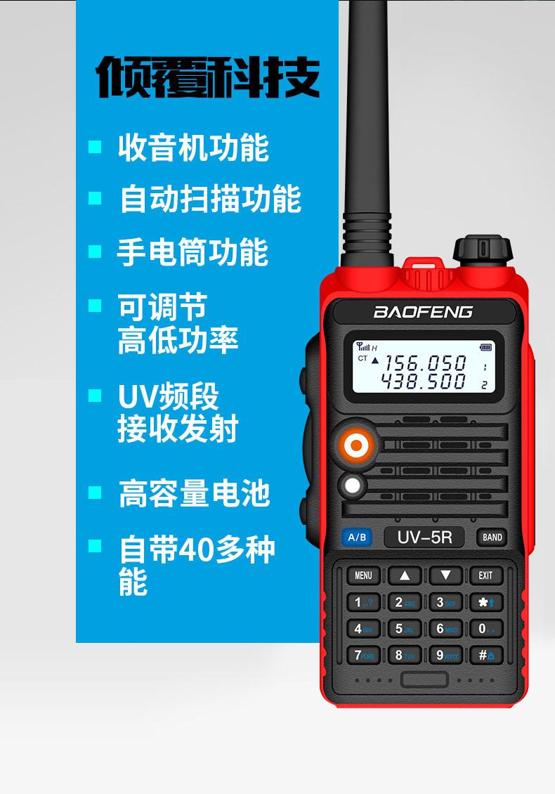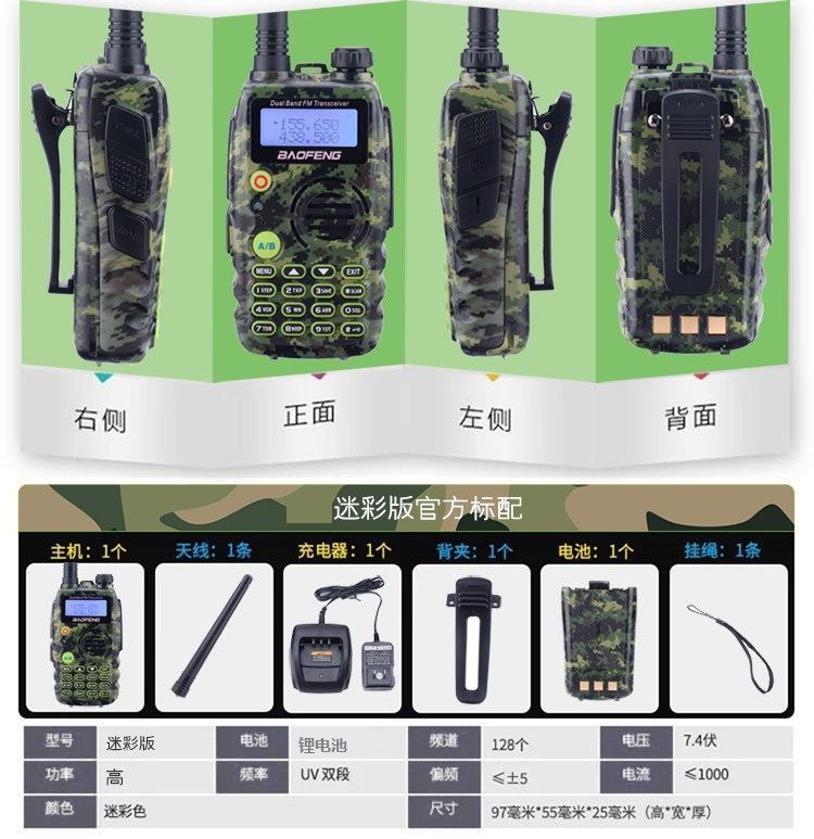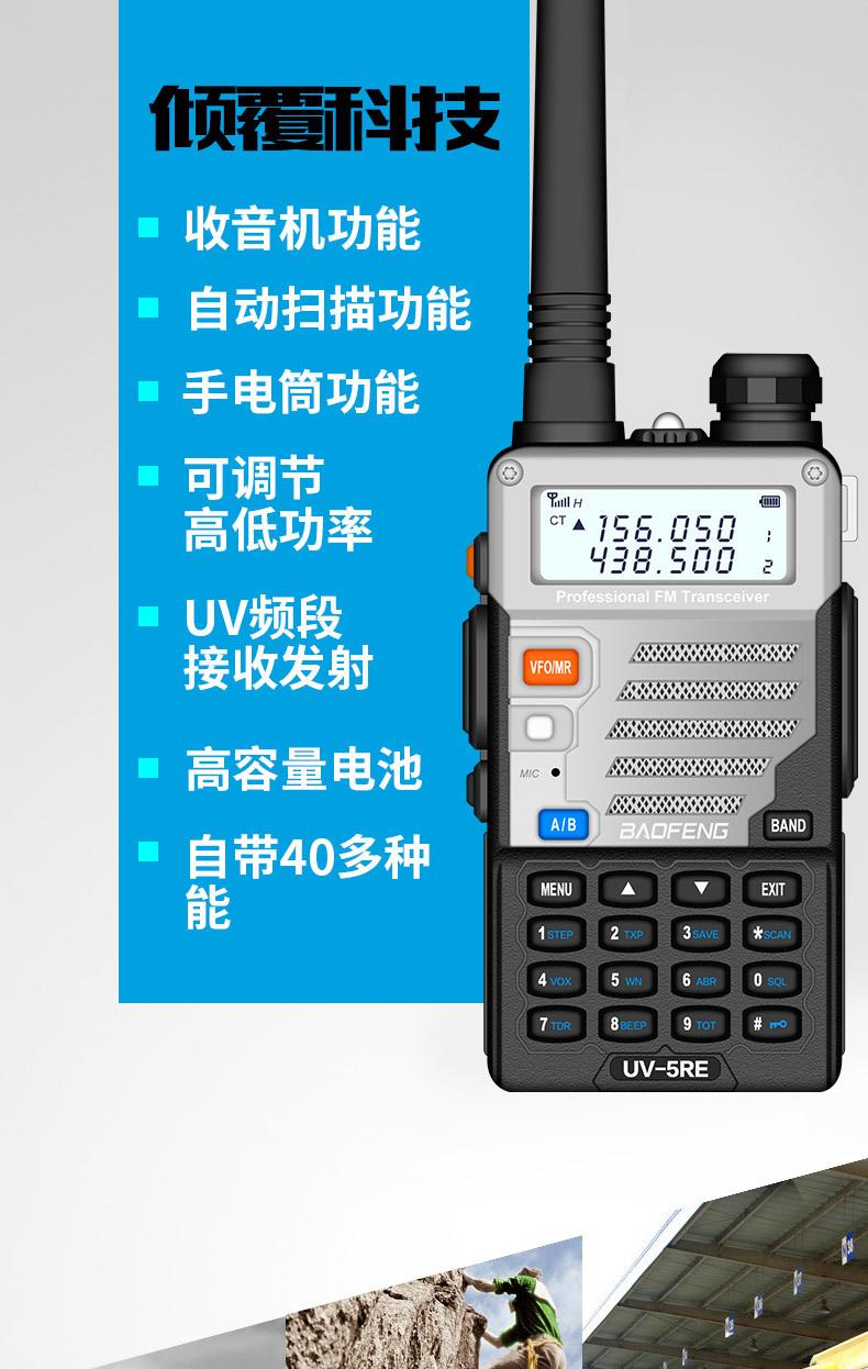 Com função de busca automática e exibição de sinalização CTCSS/DCS Com rádio novo, com função de iluminação por lanterna Com função de trabalho UU, VV, UV Com função de edição de nome de canal Com função de intercomunicação de banda dupla, com função de programação por computador Com função de controle de voz, frequência, varredura de canal Função de edição de tabela de varredura de canal (os canais podem ser livremente selecionados para participar da varredura) UV-5RE Faixa de frequência: FM: 65-108MHz (rádio, pode receber, não transmitir) VHF: 136.000-174.00MHz (VHF, transmite e recebe) UHF: 400-520.00MHz (UHF, transmite e recebe) Número de canais: 128 Tensão de trabalho: 7.2V DC Bateria de lítio 1800MAH Passo de frequência: 2.5/6.25/10/12.5/20/25KHz Estabilidade de frequência: ± 2.5PPM Impedância da antena 50Ω Tamanho: 99.7mm×54.4mm×31.7mm (altura×largura×espessura) (a altura nos dados acima não inclui a antena, a espessura inclui a bateria, o comprimento da antena é de cerca de 120mm e a espessura da bateria é de cerca de 15mm) Potência de saída do transmissor: alta ≥8W, baixa ≥3W Corrente: ≤1.4A (4W) Sensibilidade de modulação: 8-12mV Distorção de modulação: <10% Limite de modulação Banda larga <5KHz, banda estreita <2.5KHz Sub-áudio/sub-áudio digital Desvio de frequência: 0.75KHz±50Hz, 0.37KHz±30Hz Radiação espúria: <7μW Modo de modulação: 16KΦF3E/11KΦF3E Características de modulação: 6dB/por aumento de frequência Parte receptora sensibilidade de referência: -122dBm (12dB SINAD) Potência de áudio: 1W Distorção de áudio: <10% Largura de banda de recepção de modulação: 5K Supressão de ruído: ≥65dB Seletividade de canal adjacente (banda larga, banda estreita): ≥65dB, ≥60dB Intermodulação (banda larga, banda estreita): ≥60dB, ≥55dB Bloqueio: ≥85dB Configuração padrão: 1 unidade principal, 1 antena, 1 bateria, 1 carregador, 1 clipe de cinto, 1 cordão de mão, 1 manual de instruções, 1 caixa de embalagem.