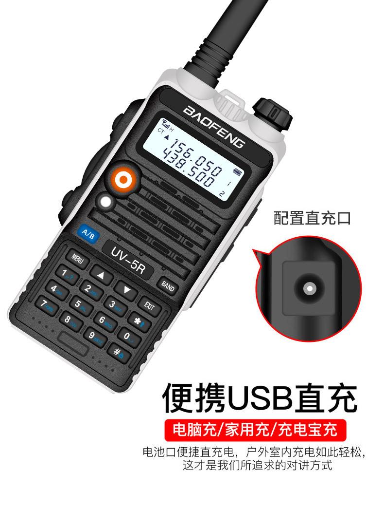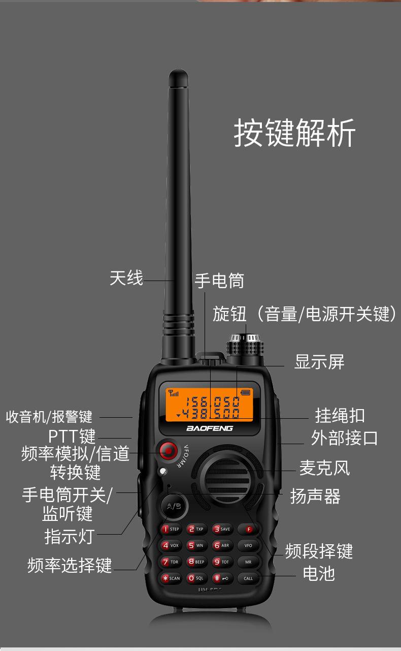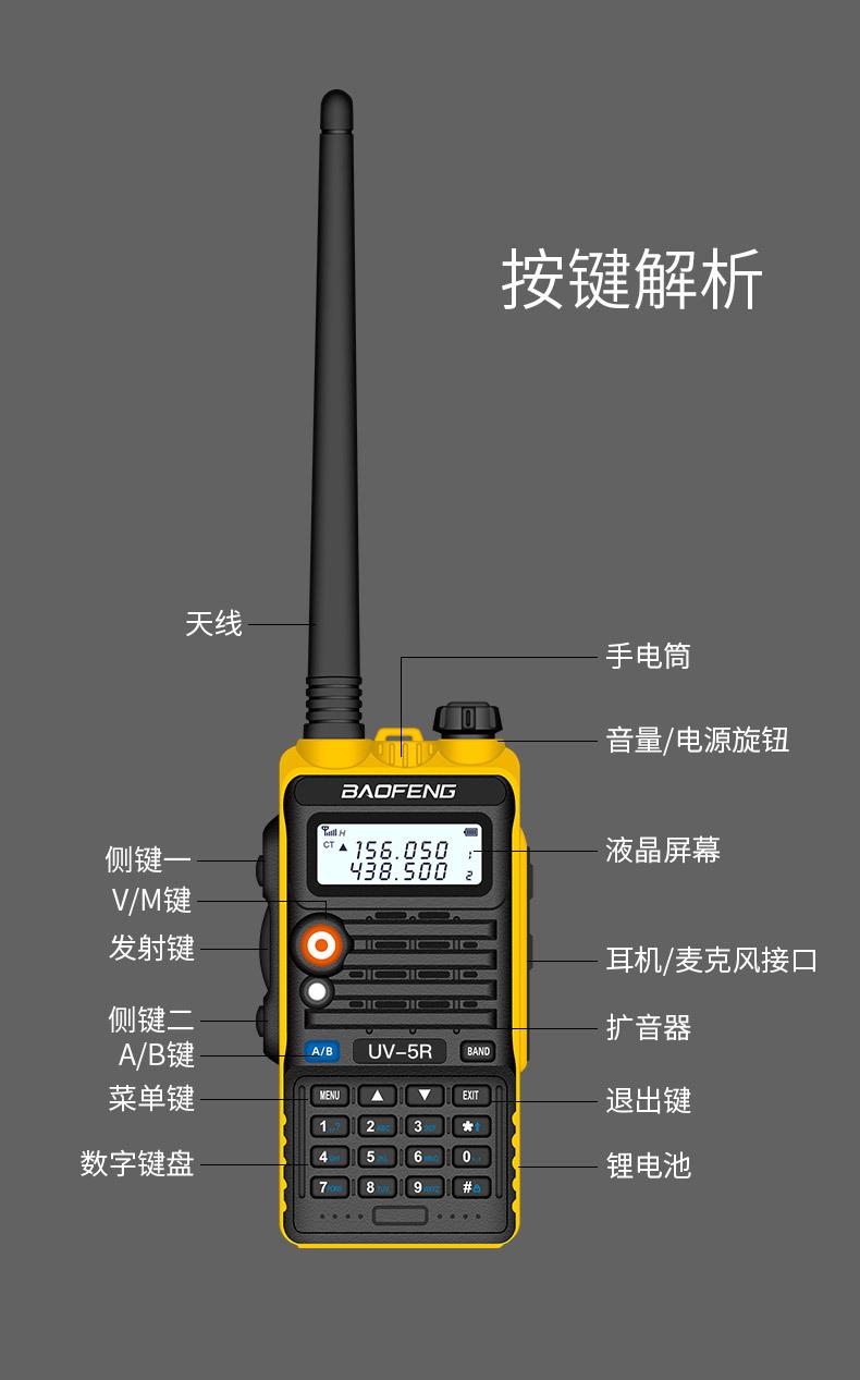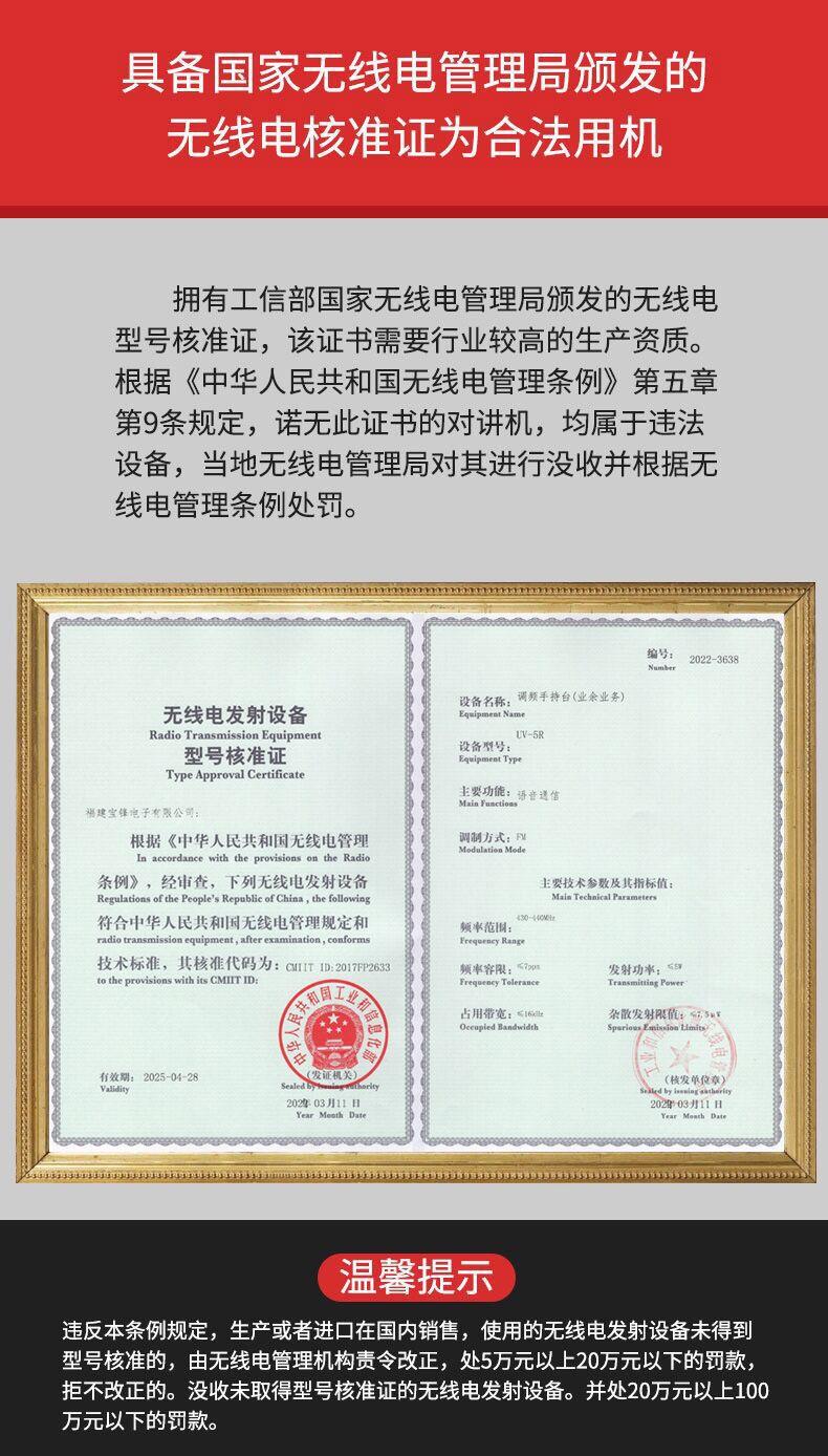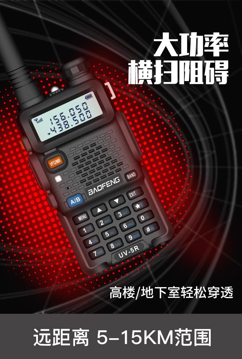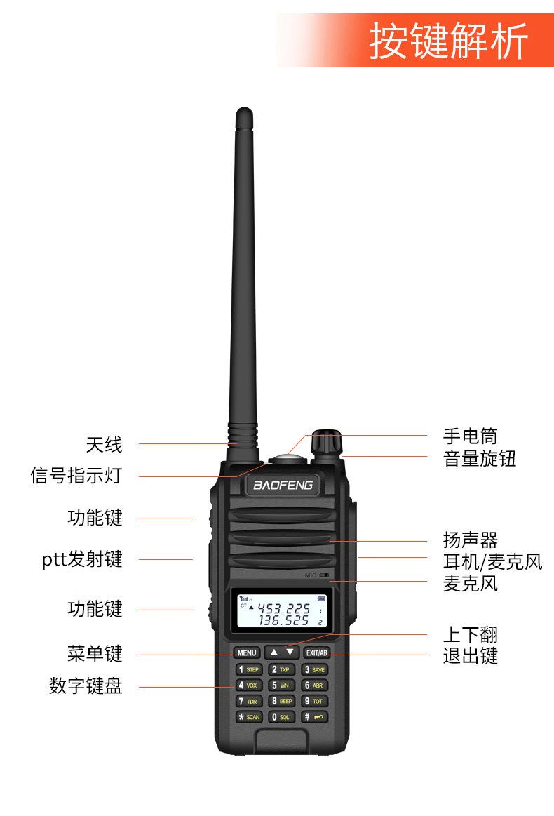 Com função de busca automática e exibição de sinalização CTCSS/DCS Com rádio novo, com função de iluminação por lanterna Com função de trabalho UU, VV, UV Com função de edição de nome de canal Com função de intercomunicação de banda dupla, com função de programação por computador Com função de controle de voz, frequência, varredura de canal Função de edição de tabela de varredura de canal (os canais podem ser livremente selecionados para participar da varredura) UV-5RE Faixa de frequência: FM: 65-108MHz (rádio, pode receber, não transmitir) VHF: 136.000-174.00MHz (VHF, transmite e recebe) UHF: 400-520.00MHz (UHF, transmite e recebe) Número de canais: 128 Tensão de trabalho: 7.2V DC Bateria de lítio 1800MAH Passo de frequência: 2.5/6.25/10/12.5/20/25KHz Estabilidade de frequência: ± 2.5PPM Impedância da antena 50Ω Tamanho: 99.7mm×54.4mm×31.7mm (altura×largura×espessura) (a altura nos dados acima não inclui a antena, a espessura inclui a bateria, o comprimento da antena é de cerca de 120mm e a espessura da bateria é de cerca de 15mm) Potência de saída do transmissor: alta ≥8W, baixa ≥3W Corrente: ≤1.4A (4W) Sensibilidade de modulação: 8-12mV Distorção de modulação: <10% Limite de modulação Banda larga <5KHz, banda estreita <2.5KHz Sub-áudio/sub-áudio digital Desvio de frequência: 0.75KHz±50Hz, 0.37KHz±30Hz Radiação espúria: <7μW Modo de modulação: 16KΦF3E/11KΦF3E Características de modulação: 6dB/por aumento de frequência Parte receptora sensibilidade de referência: -122dBm (12dB SINAD) Potência de áudio: 1W Distorção de áudio: <10% Largura de banda de recepção de modulação: 5K Supressão de ruído: ≥65dB Seletividade de canal adjacente (banda larga, banda estreita): ≥65dB, ≥60dB Intermodulação (banda larga, banda estreita): ≥60dB, ≥55dB Bloqueio: ≥85dB Configuração padrão: 1 unidade principal, 1 antena, 1 bateria, 1 carregador, 1 clipe de cinto, 1 cordão de mão, 1 manual de instruções, 1 caixa de embalagem.
