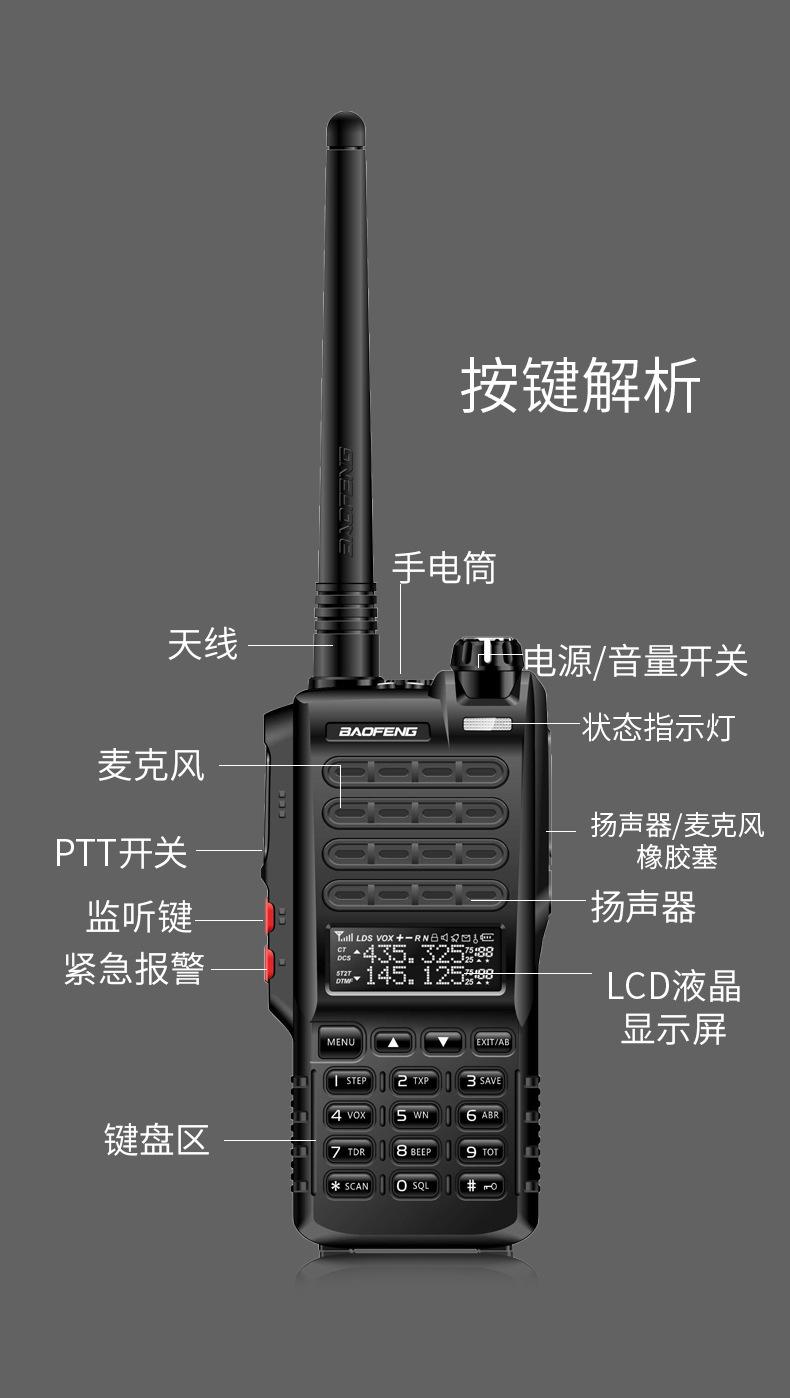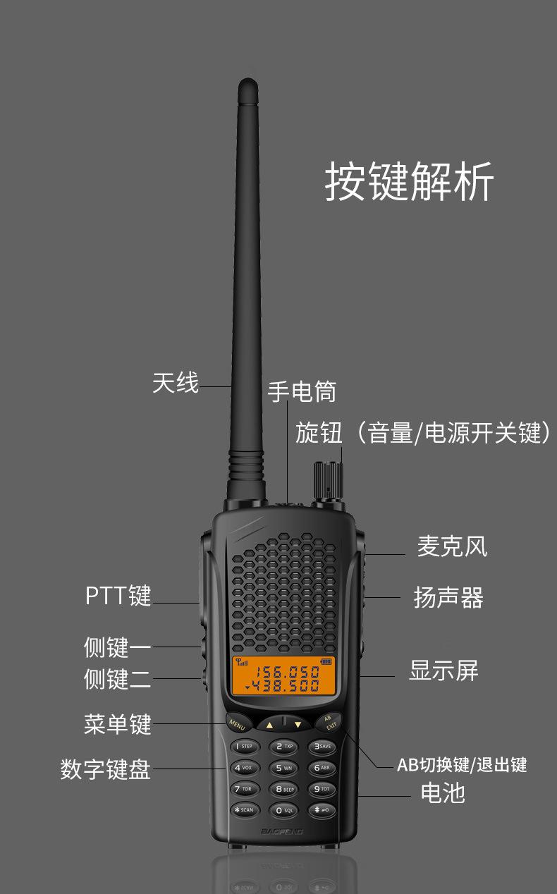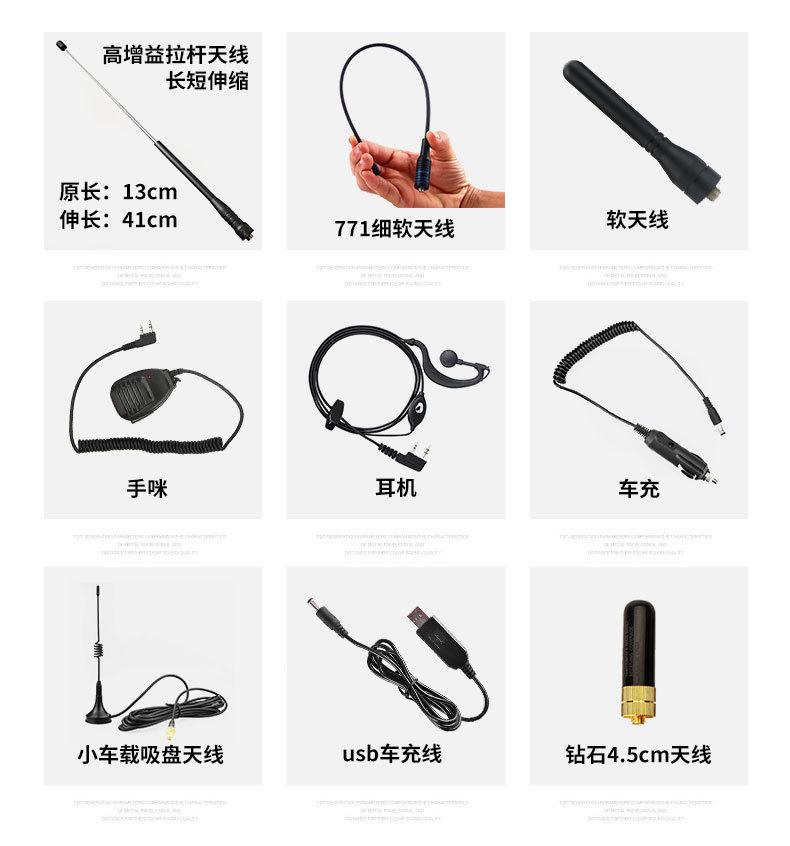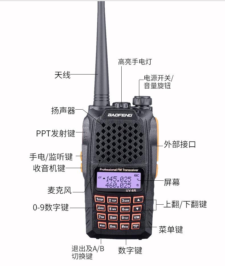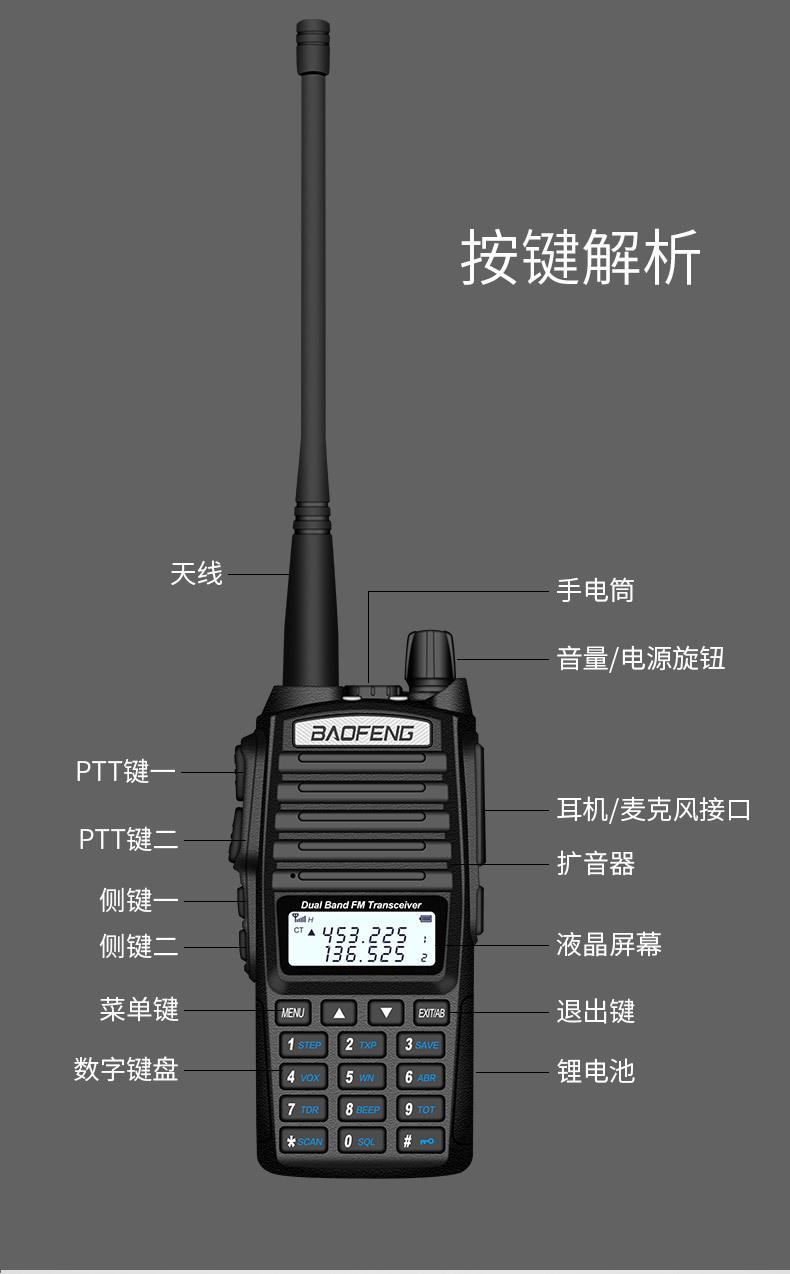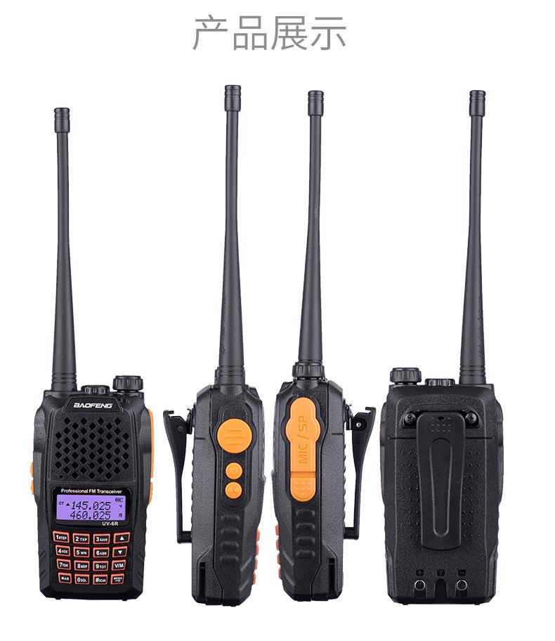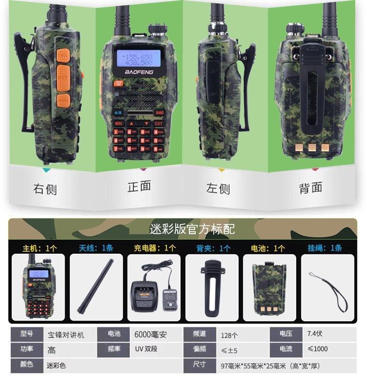 Com função de busca automática e exibição de sinalização CTCSS/DCS Com rádio novo, com função de iluminação por lanterna Com função de trabalho UU, VV, UV Com função de edição de nome de canal Com função de intercomunicação de banda dupla, com função de programação por computador Com função de controle de voz, frequência, varredura de canal Função de edição de tabela de varredura de canal (os canais podem ser livremente selecionados para participar da varredura) UV-5RE Faixa de frequência: FM: 65-108MHz (rádio, pode receber, não transmitir) VHF: 136.000-174.00MHz (VHF, transmite e recebe) UHF: 400-520.00MHz (UHF, transmite e recebe) Número de canais: 128 Tensão de trabalho: 7.2V DC Bateria de lítio 1800MAH Passo de frequência: 2.5/6.25/10/12.5/20/25KHz Estabilidade de frequência: ± 2.5PPM Impedância da antena 50Ω Tamanho: 99.7mm×54.4mm×31.7mm (altura×largura×espessura) (a altura nos dados acima não inclui a antena, a espessura inclui a bateria, o comprimento da antena é de cerca de 120mm e a espessura da bateria é de cerca de 15mm) Potência de saída do transmissor: alta ≥8W, baixa ≥3W Corrente: ≤1.4A (4W) Sensibilidade de modulação: 8-12mV Distorção de modulação: <10% Limite de modulação Banda larga <5KHz, banda estreita <2.5KHz Sub-áudio/sub-áudio digital Desvio de frequência: 0.75KHz±50Hz, 0.37KHz±30Hz Radiação espúria: <7μW Modo de modulação: 16KΦF3E/11KΦF3E Características de modulação: 6dB/por aumento de frequência Parte receptora sensibilidade de referência: -122dBm (12dB SINAD) Potência de áudio: 1W Distorção de áudio: <10% Largura de banda de recepção de modulação: 5K Supressão de ruído: ≥65dB Seletividade de canal adjacente (banda larga, banda estreita): ≥65dB, ≥60dB Intermodulação (banda larga, banda estreita): ≥60dB, ≥55dB Bloqueio: ≥85dB Configuração padrão: 1 unidade principal, 1 antena, 1 bateria, 1 carregador, 1 clipe de cinto, 1 cordão de mão, 1 manual de instruções, 1 caixa de embalagem.