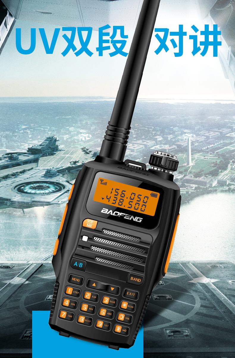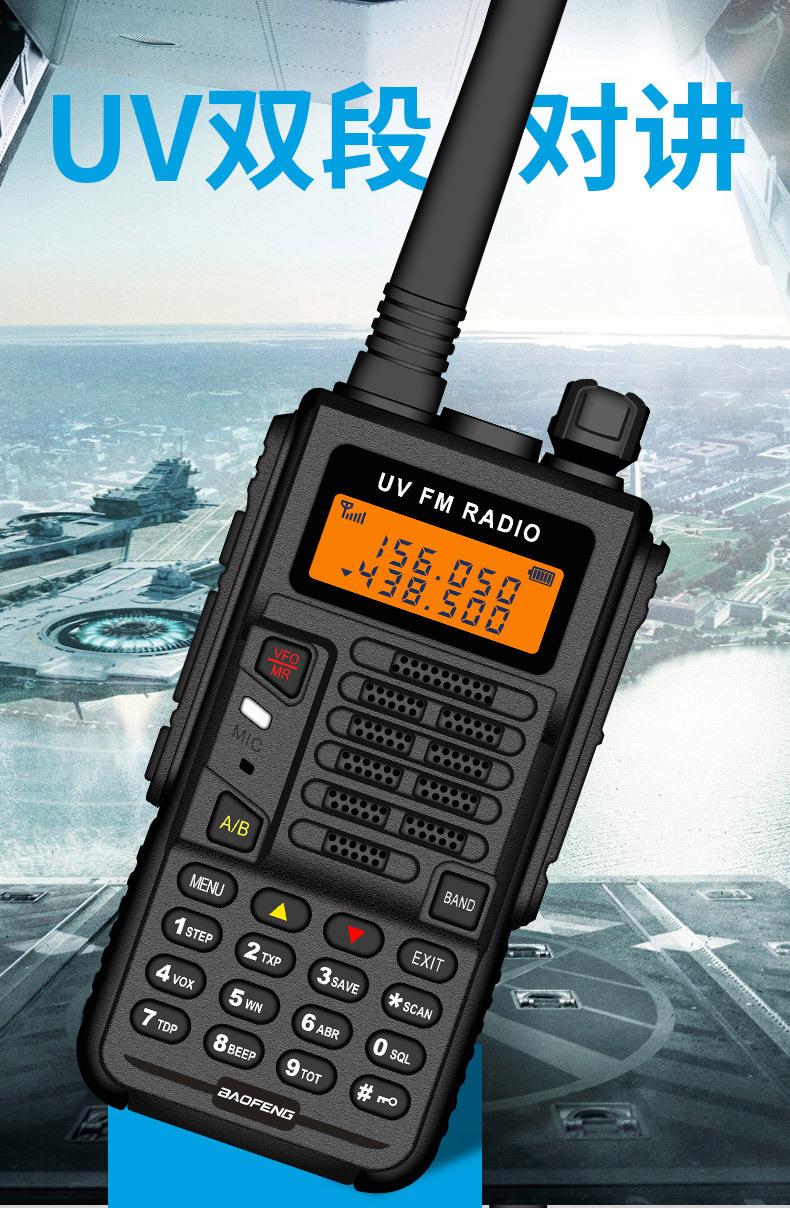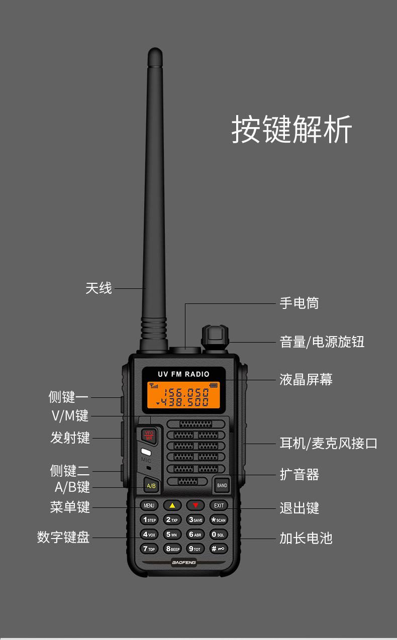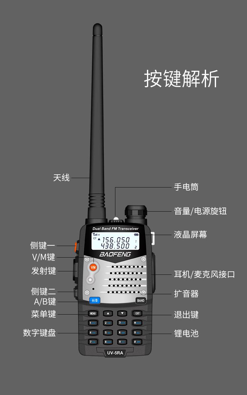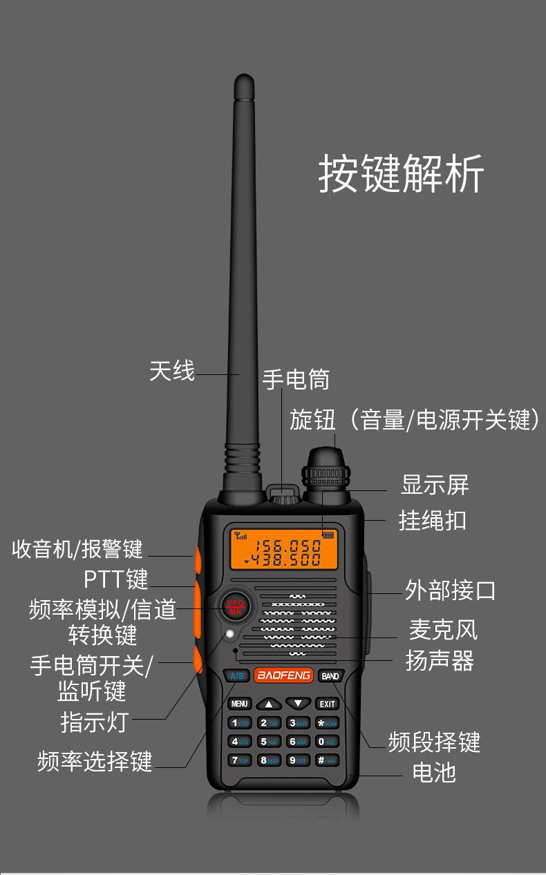 Com função de busca automática e exibição de sinalização CTCSS/DCS Com rádio novo, com função de iluminação por lanterna Com função de trabalho UU, VV, UV Com função de edição de nome de canal Com função de intercomunicação de banda dupla, com função de programação por computador Com função de controle de voz, frequência, varredura de canal Função de edição de tabela de varredura de canal (os canais podem ser livremente selecionados para participar da varredura) UV-5RE Faixa de frequência: FM: 65-108MHz (rádio, pode receber, não transmitir) VHF: 136.000-174.00MHz (VHF, transmite e recebe) UHF: 400-520.00MHz (UHF, transmite e recebe) Número de canais: 128 Tensão de trabalho: 7.2V DC Bateria de lítio 1800MAH Passo de frequência: 2.5/6.25/10/12.5/20/25KHz Estabilidade de frequência: ± 2.5PPM Impedância da antena 50Ω Tamanho: 99.7mm×54.4mm×31.7mm (altura×largura×espessura) (a altura nos dados acima não inclui a antena, a espessura inclui a bateria, o comprimento da antena é de cerca de 120mm e a espessura da bateria é de cerca de 15mm) Potência de saída do transmissor: alta ≥8W, baixa ≥3W Corrente: ≤1.4A (4W) Sensibilidade de modulação: 8-12mV Distorção de modulação: <10% Limite de modulação Banda larga <5KHz, banda estreita <2.5KHz Sub-áudio/sub-áudio digital Desvio de frequência: 0.75KHz±50Hz, 0.37KHz±30Hz Radiação espúria: <7μW Modo de modulação: 16KΦF3E/11KΦF3E Características de modulação: 6dB/por aumento de frequência Parte receptora sensibilidade de referência: -122dBm (12dB SINAD) Potência de áudio: 1W Distorção de áudio: <10% Largura de banda de recepção de modulação: 5K Supressão de ruído: ≥65dB Seletividade de canal adjacente (banda larga, banda estreita): ≥65dB, ≥60dB Intermodulação (banda larga, banda estreita): ≥60dB, ≥55dB Bloqueio: ≥85dB Configuração padrão: 1 unidade principal, 1 antena, 1 bateria, 1 carregador, 1 clipe de cinto, 1 cordão de mão, 1 manual de instruções, 1 caixa de embalagem.