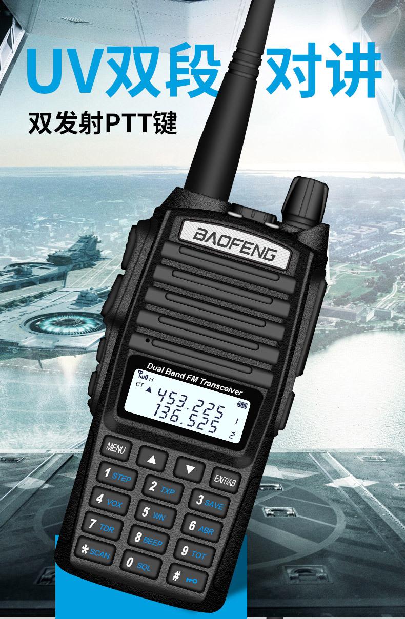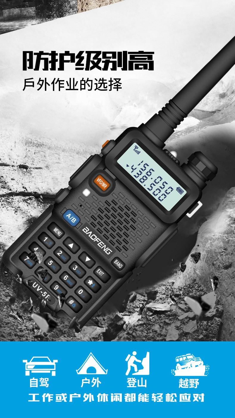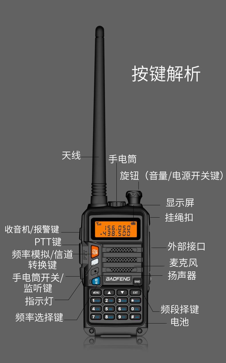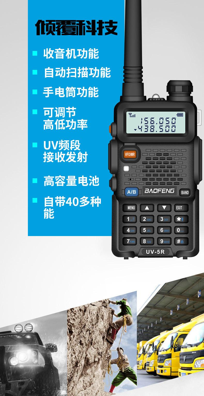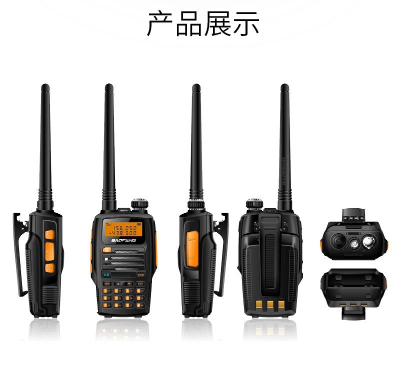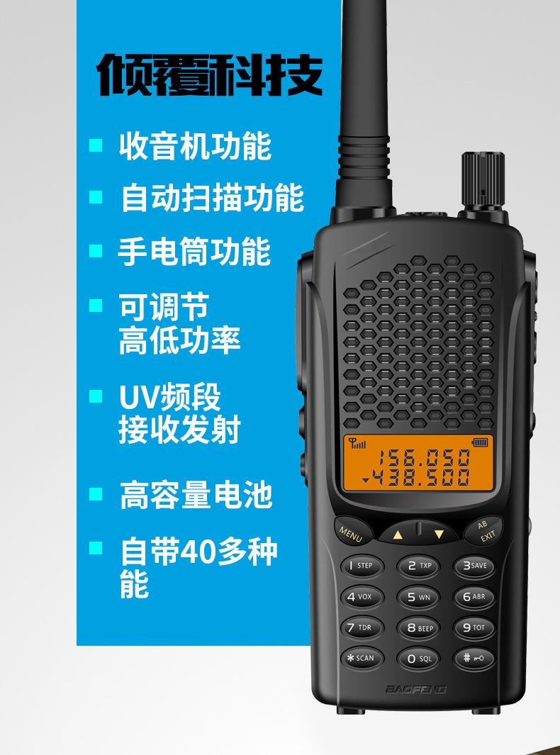 Com função de busca automática e exibição de sinalização CTCSS/DCS Com rádio novo, com função de iluminação por lanterna Com função de trabalho UU, VV, UV Com função de edição de nome de canal Com função de intercomunicação de banda dupla, com função de programação por computador Com função de controle de voz, frequência, varredura de canal Função de edição de tabela de varredura de canal (os canais podem ser livremente selecionados para participar da varredura) UV-5RE Faixa de frequência: FM: 65-108MHz (rádio, pode receber, não transmitir) VHF: 136.000-174.00MHz (VHF, transmite e recebe) UHF: 400-520.00MHz (UHF, transmite e recebe) Número de canais: 128 Tensão de trabalho: 7.2V DC Bateria de lítio 1800MAH Passo de frequência: 2.5/6.25/10/12.5/20/25KHz Estabilidade de frequência: ± 2.5PPM Impedância da antena 50Ω Tamanho: 99.7mm×54.4mm×31.7mm (altura×largura×espessura) (a altura nos dados acima não inclui a antena, a espessura inclui a bateria, o comprimento da antena é de cerca de 120mm e a espessura da bateria é de cerca de 15mm) Potência de saída do transmissor: alta ≥8W, baixa ≥3W Corrente: ≤1.4A (4W) Sensibilidade de modulação: 8-12mV Distorção de modulação: <10% Limite de modulação Banda larga <5KHz, banda estreita <2.5KHz Sub-áudio/sub-áudio digital Desvio de frequência: 0.75KHz±50Hz, 0.37KHz±30Hz Radiação espúria: <7μW Modo de modulação: 16KΦF3E/11KΦF3E Características de modulação: 6dB/por aumento de frequência Parte receptora sensibilidade de referência: -122dBm (12dB SINAD) Potência de áudio: 1W Distorção de áudio: <10% Largura de banda de recepção de modulação: 5K Supressão de ruído: ≥65dB Seletividade de canal adjacente (banda larga, banda estreita): ≥65dB, ≥60dB Intermodulação (banda larga, banda estreita): ≥60dB, ≥55dB Bloqueio: ≥85dB Configuração padrão: 1 unidade principal, 1 antena, 1 bateria, 1 carregador, 1 clipe de cinto, 1 cordão de mão, 1 manual de instruções, 1 caixa de embalagem.