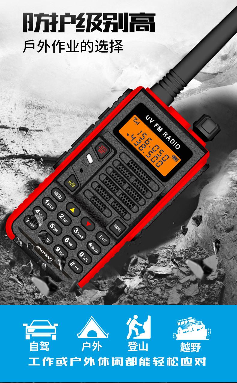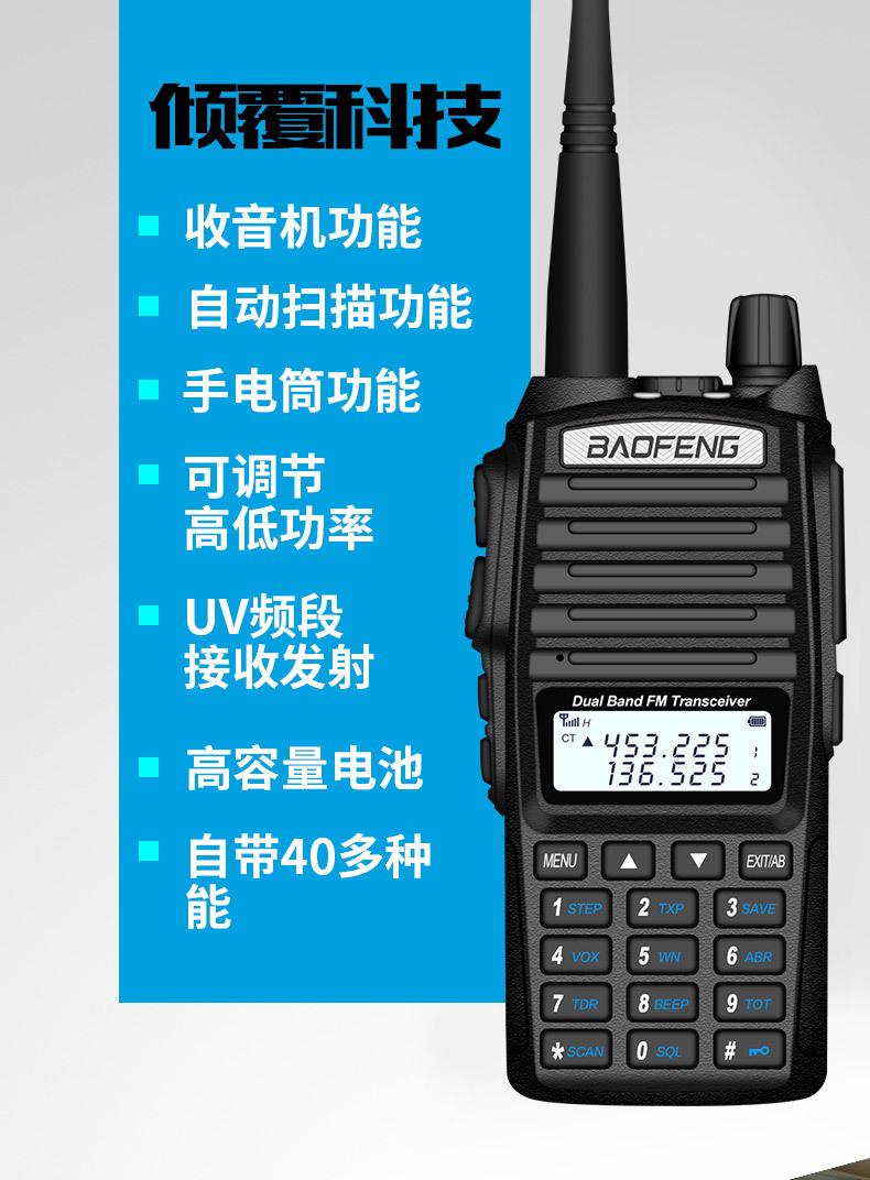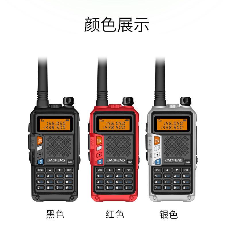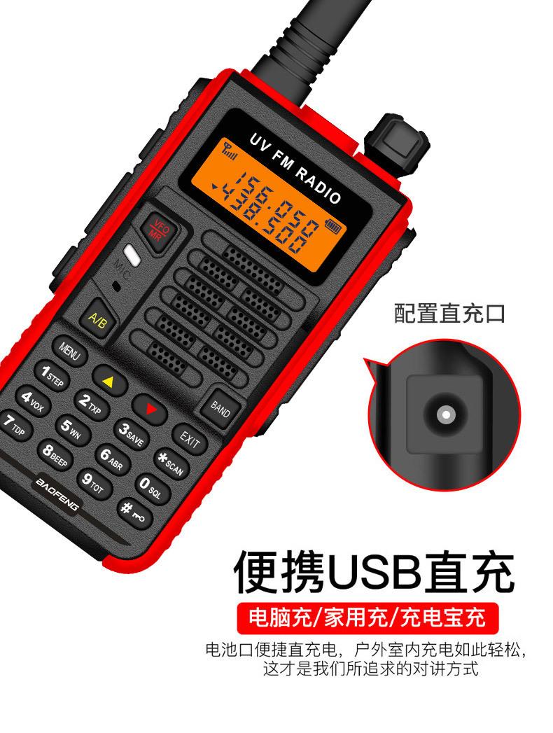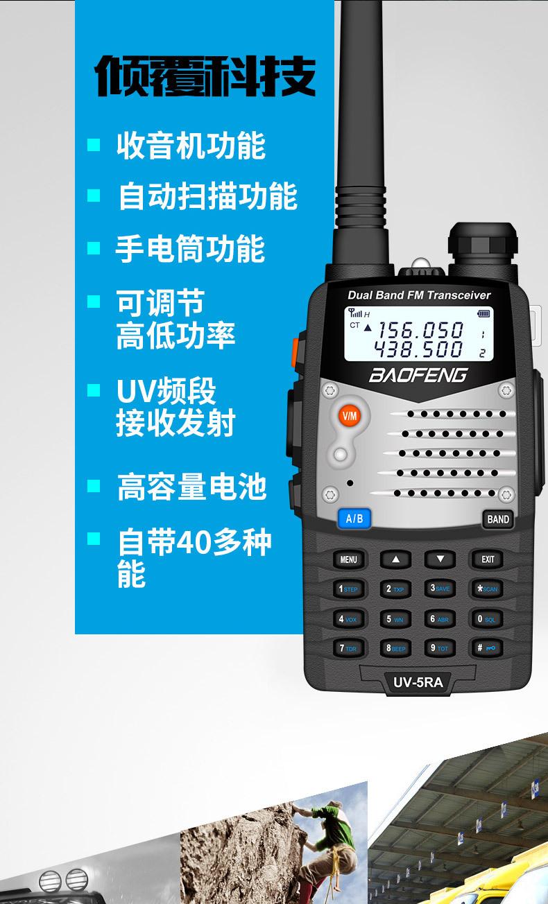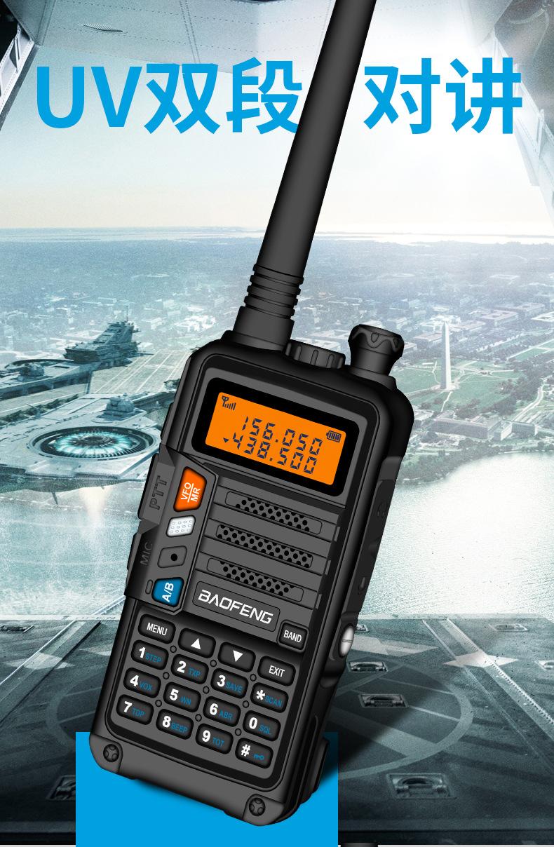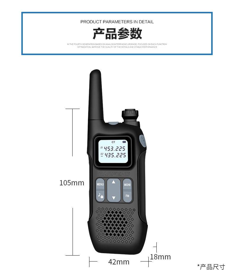 Com função de busca automática e exibição de sinalização CTCSS/DCS Com rádio novo, com função de iluminação por lanterna Com função de trabalho UU, VV, UV Com função de edição de nome de canal Com função de intercomunicação de banda dupla, com função de programação por computador Com função de controle de voz, frequência, varredura de canal Função de edição de tabela de varredura de canal (os canais podem ser livremente selecionados para participar da varredura) UV-5RE Faixa de frequência: FM: 65-108MHz (rádio, pode receber, não transmitir) VHF: 136.000-174.00MHz (VHF, transmite e recebe) UHF: 400-520.00MHz (UHF, transmite e recebe) Número de canais: 128 Tensão de trabalho: 7.2V DC Bateria de lítio 1800MAH Passo de frequência: 2.5/6.25/10/12.5/20/25KHz Estabilidade de frequência: ± 2.5PPM Impedância da antena 50Ω Tamanho: 99.7mm×54.4mm×31.7mm (altura×largura×espessura) (a altura nos dados acima não inclui a antena, a espessura inclui a bateria, o comprimento da antena é de cerca de 120mm e a espessura da bateria é de cerca de 15mm) Potência de saída do transmissor: alta ≥8W, baixa ≥3W Corrente: ≤1.4A (4W) Sensibilidade de modulação: 8-12mV Distorção de modulação: <10% Limite de modulação Banda larga <5KHz, banda estreita <2.5KHz Sub-áudio/sub-áudio digital Desvio de frequência: 0.75KHz±50Hz, 0.37KHz±30Hz Radiação espúria: <7μW Modo de modulação: 16KΦF3E/11KΦF3E Características de modulação: 6dB/por aumento de frequência Parte receptora sensibilidade de referência: -122dBm (12dB SINAD) Potência de áudio: 1W Distorção de áudio: <10% Largura de banda de recepção de modulação: 5K Supressão de ruído: ≥65dB Seletividade de canal adjacente (banda larga, banda estreita): ≥65dB, ≥60dB Intermodulação (banda larga, banda estreita): ≥60dB, ≥55dB Bloqueio: ≥85dB Configuração padrão: 1 unidade principal, 1 antena, 1 bateria, 1 carregador, 1 clipe de cinto, 1 cordão de mão, 1 manual de instruções, 1 caixa de embalagem.