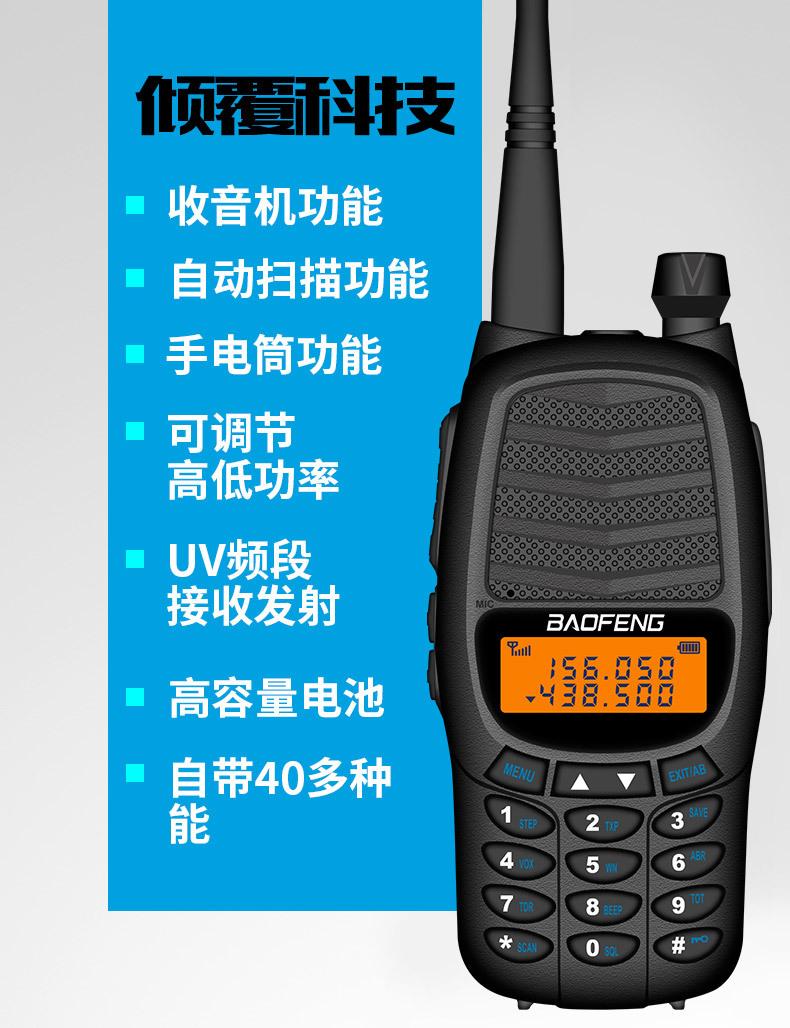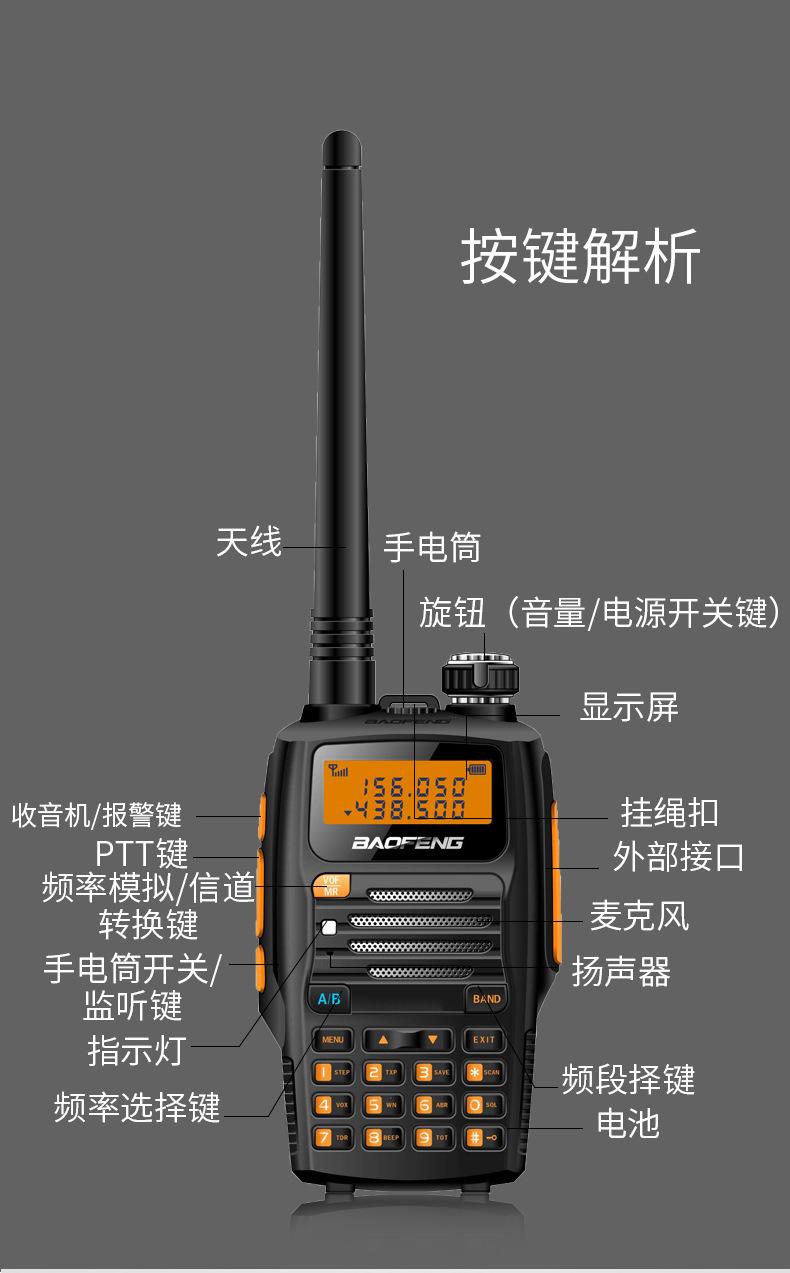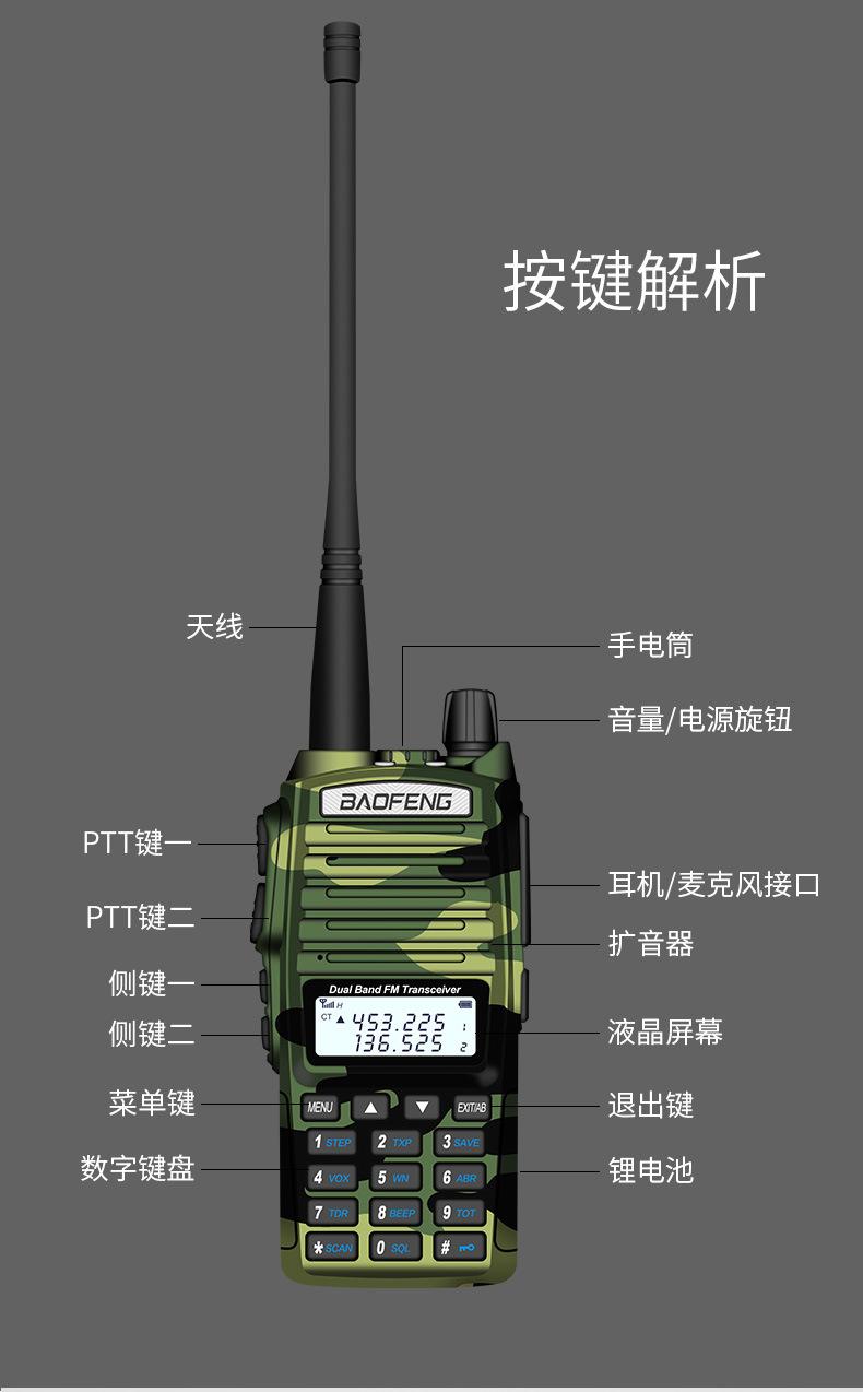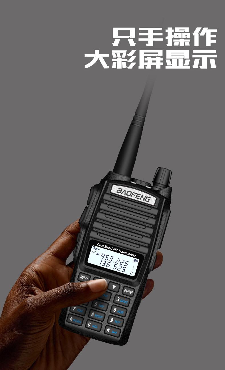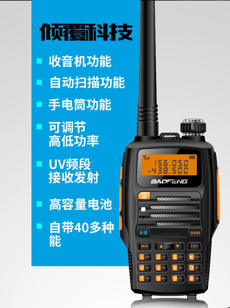 Com função de busca automática e exibição de sinalização CTCSS/DCS Com rádio novo, com função de iluminação por lanterna Com função de trabalho UU, VV, UV Com função de edição de nome de canal Com função de intercomunicação de banda dupla, com função de programação por computador Com função de controle de voz, frequência, varredura de canal Função de edição de tabela de varredura de canal (os canais podem ser livremente selecionados para participar da varredura) UV-5RE Faixa de frequência: FM: 65-108MHz (rádio, pode receber, não transmitir) VHF: 136.000-174.00MHz (VHF, transmite e recebe) UHF: 400-520.00MHz (UHF, transmite e recebe) Número de canais: 128 Tensão de trabalho: 7.2V DC Bateria de lítio 1800MAH Passo de frequência: 2.5/6.25/10/12.5/20/25KHz Estabilidade de frequência: ± 2.5PPM Impedância da antena 50Ω Tamanho: 99.7mm×54.4mm×31.7mm (altura×largura×espessura) (a altura nos dados acima não inclui a antena, a espessura inclui a bateria, o comprimento da antena é de cerca de 120mm e a espessura da bateria é de cerca de 15mm) Potência de saída do transmissor: alta ≥8W, baixa ≥3W Corrente: ≤1.4A (4W) Sensibilidade de modulação: 8-12mV Distorção de modulação: <10% Limite de modulação Banda larga <5KHz, banda estreita <2.5KHz Sub-áudio/sub-áudio digital Desvio de frequência: 0.75KHz±50Hz, 0.37KHz±30Hz Radiação espúria: <7μW Modo de modulação: 16KΦF3E/11KΦF3E Características de modulação: 6dB/por aumento de frequência Parte receptora sensibilidade de referência: -122dBm (12dB SINAD) Potência de áudio: 1W Distorção de áudio: <10% Largura de banda de recepção de modulação: 5K Supressão de ruído: ≥65dB Seletividade de canal adjacente (banda larga, banda estreita): ≥65dB, ≥60dB Intermodulação (banda larga, banda estreita): ≥60dB, ≥55dB Bloqueio: ≥85dB Configuração padrão: 1 unidade principal, 1 antena, 1 bateria, 1 carregador, 1 clipe de cinto, 1 cordão de mão, 1 manual de instruções, 1 caixa de embalagem.