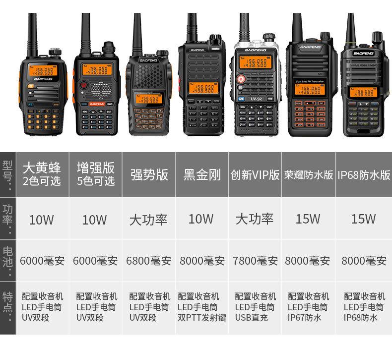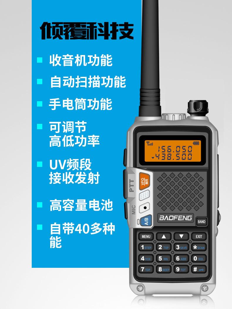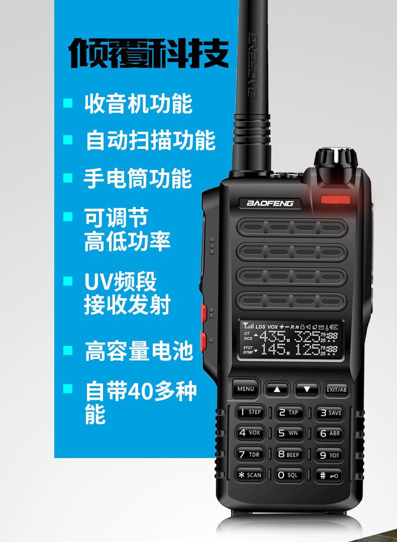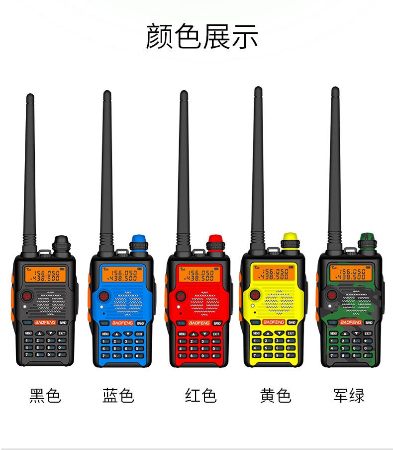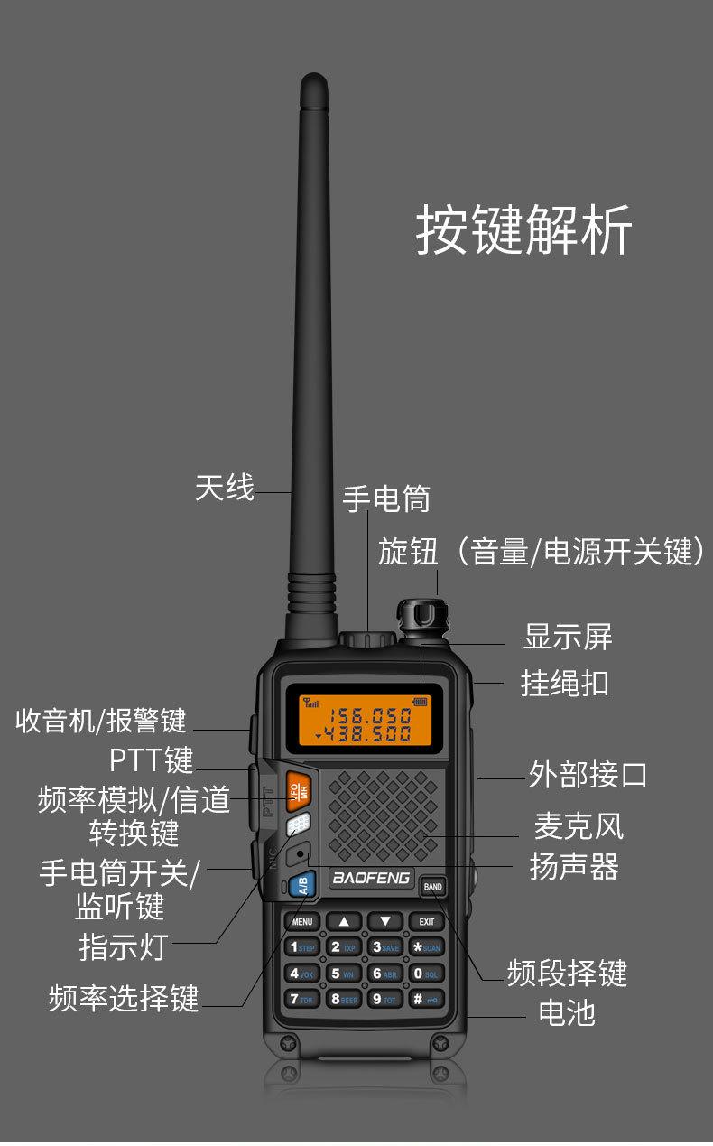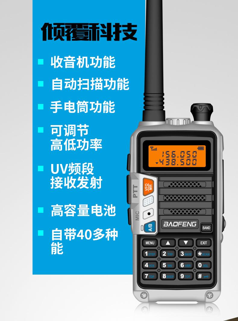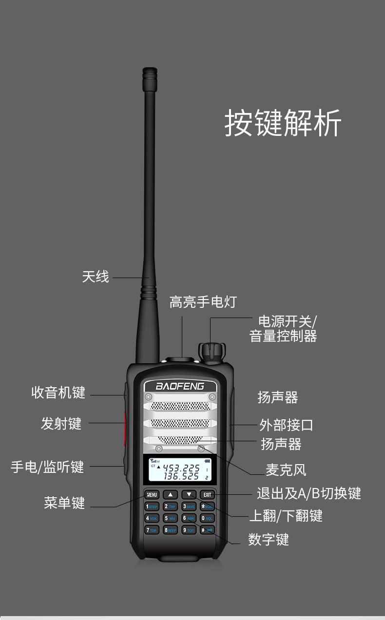 Com função de busca automática e exibição de sinalização CTCSS/DCS Com rádio novo, com função de iluminação por lanterna Com função de trabalho UU, VV, UV Com função de edição de nome de canal Com função de intercomunicação de banda dupla, com função de programação por computador Com função de controle de voz, frequência, varredura de canal Função de edição de tabela de varredura de canal (os canais podem ser livremente selecionados para participar da varredura) UV-5RE Faixa de frequência: FM: 65-108MHz (rádio, pode receber, não transmitir) VHF: 136.000-174.00MHz (VHF, transmite e recebe) UHF: 400-520.00MHz (UHF, transmite e recebe) Número de canais: 128 Tensão de trabalho: 7.2V DC Bateria de lítio 1800MAH Passo de frequência: 2.5/6.25/10/12.5/20/25KHz Estabilidade de frequência: ± 2.5PPM Impedância da antena 50Ω Tamanho: 99.7mm×54.4mm×31.7mm (altura×largura×espessura) (a altura nos dados acima não inclui a antena, a espessura inclui a bateria, o comprimento da antena é de cerca de 120mm e a espessura da bateria é de cerca de 15mm) Potência de saída do transmissor: alta ≥8W, baixa ≥3W Corrente: ≤1.4A (4W) Sensibilidade de modulação: 8-12mV Distorção de modulação: <10% Limite de modulação Banda larga <5KHz, banda estreita <2.5KHz Sub-áudio/sub-áudio digital Desvio de frequência: 0.75KHz±50Hz, 0.37KHz±30Hz Radiação espúria: <7μW Modo de modulação: 16KΦF3E/11KΦF3E Características de modulação: 6dB/por aumento de frequência Parte receptora sensibilidade de referência: -122dBm (12dB SINAD) Potência de áudio: 1W Distorção de áudio: <10% Largura de banda de recepção de modulação: 5K Supressão de ruído: ≥65dB Seletividade de canal adjacente (banda larga, banda estreita): ≥65dB, ≥60dB Intermodulação (banda larga, banda estreita): ≥60dB, ≥55dB Bloqueio: ≥85dB Configuração padrão: 1 unidade principal, 1 antena, 1 bateria, 1 carregador, 1 clipe de cinto, 1 cordão de mão, 1 manual de instruções, 1 caixa de embalagem.