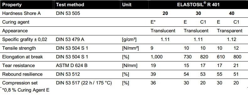 ELASTOSILProdutos de diferentes graus de dureza na série R401/X (x=20,30,40,50,60,70,80,90) podem ser misturados em qualquer proporção para obter o produto com grau de dureza intermediário desejado.