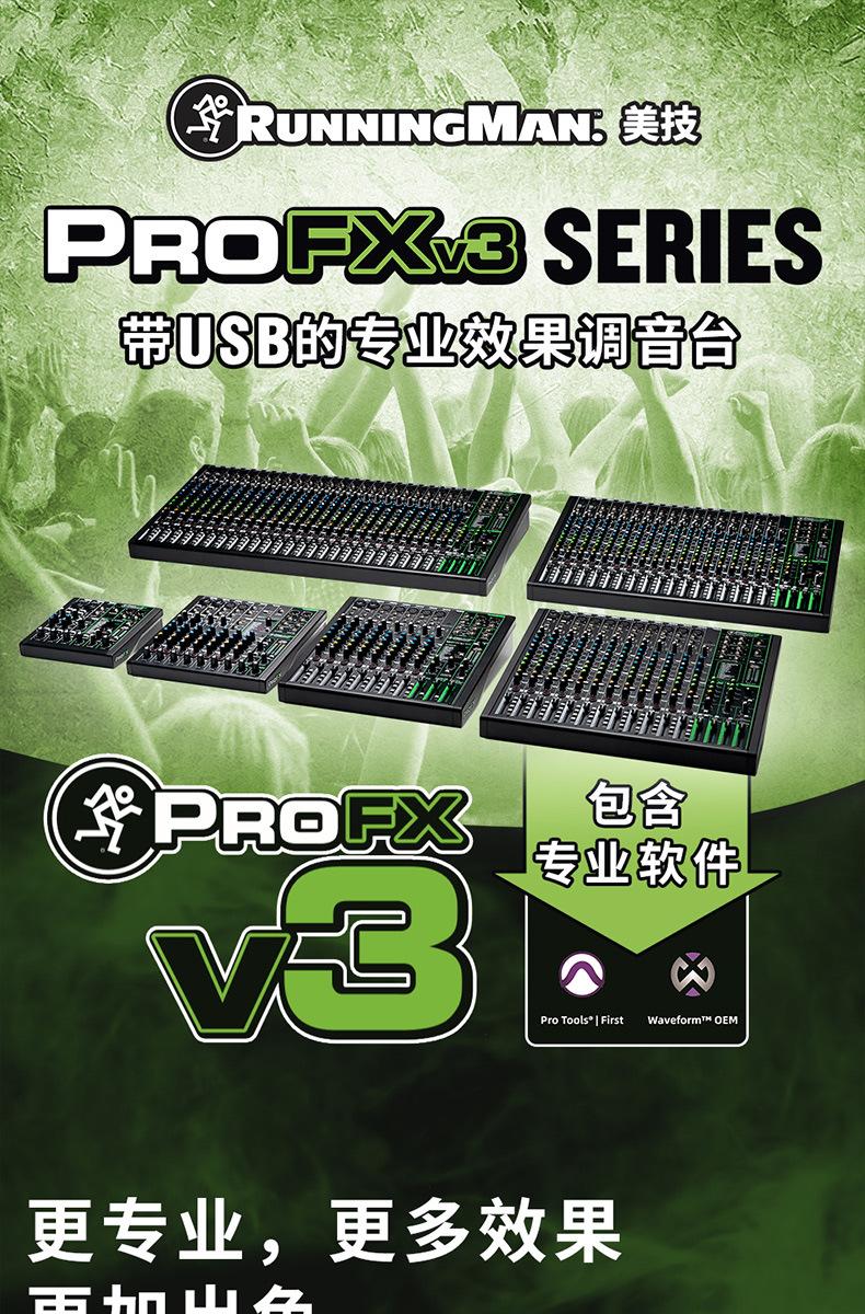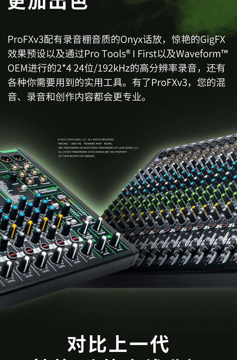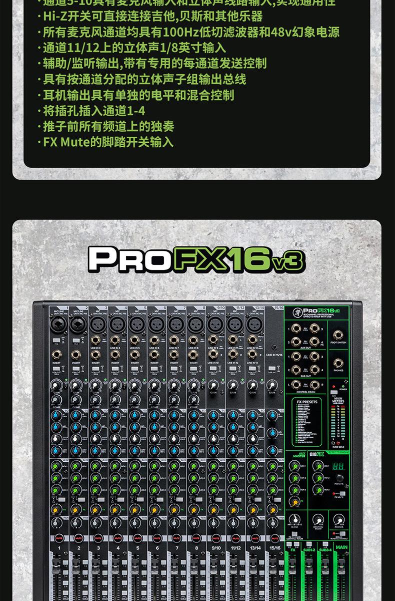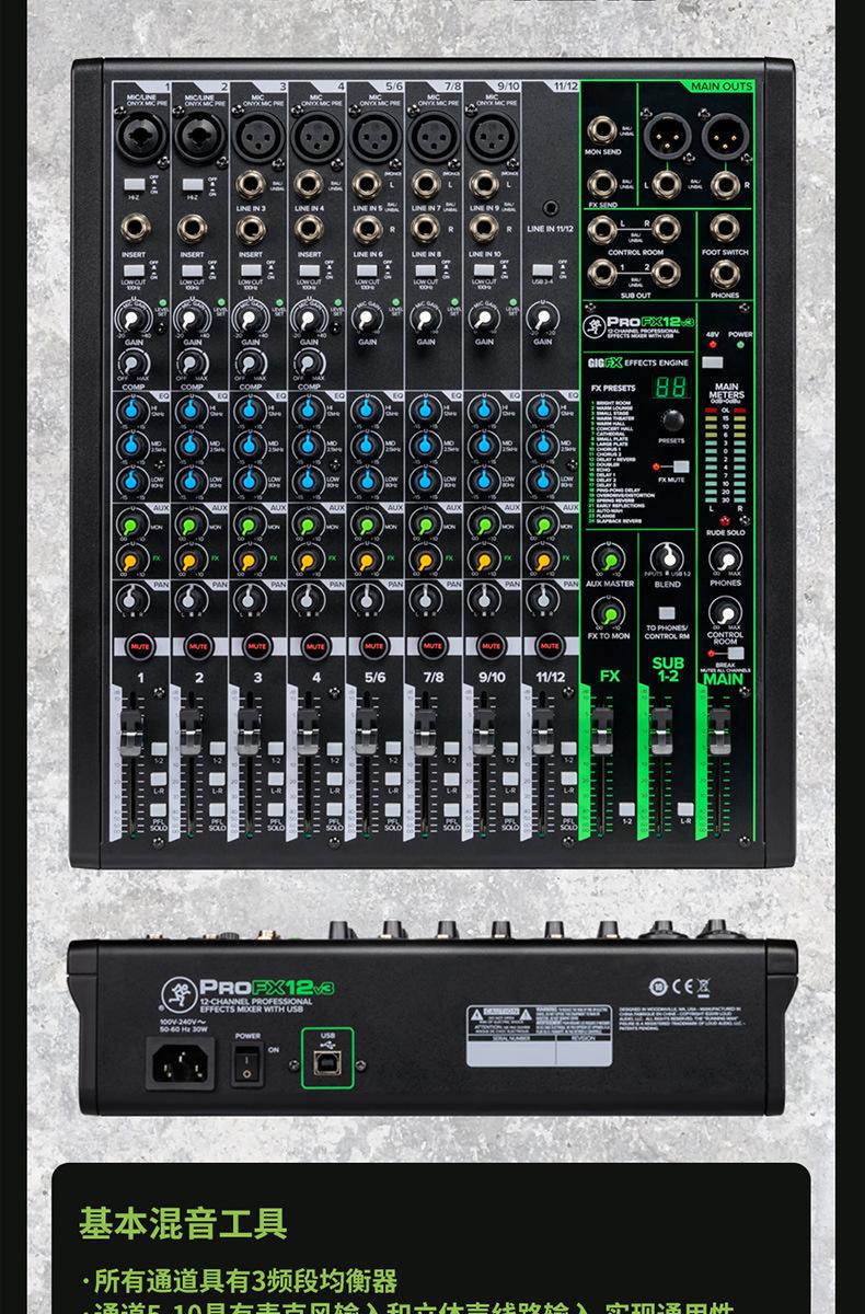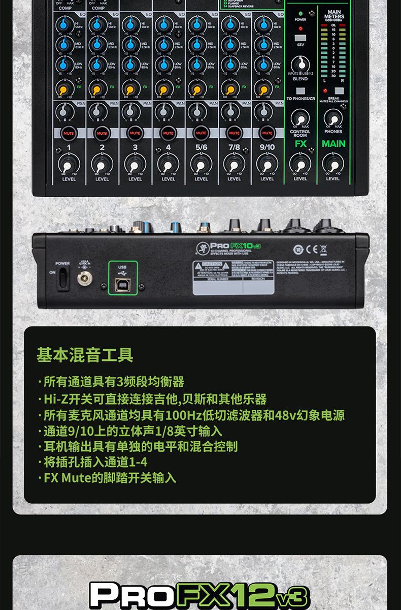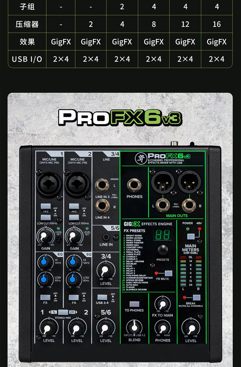 Conteúdo da Embalagem Conteúdo da Embalagem • Mixer ProFX12v3 1 unidade • Cabo de Alimentação 1 peça • Cabo USB 1 peça • Manual do Usuário 1 cópia • Motor de Efeitos GigFX: 24 efeitos • Pré-amplificadores: 7 Mackie Onyx • Características de Ruído (ruído de entrada equivalente com impedância de fonte de 150Ω): Entrada de microfone para saída de envio de inserção, ganho máximo: -126dBu Ruído de saída residual: Todas as saídas, fader principal e nível de linha desligados: -95dBu; Todas as saídas, fader principal em unidade, um nível de linha em unidade: -80dBu • Resposta de Frequência: Entrada de microfone para qualquer saída (ganho unitário): +0, -1dB, 20Hz-30kHz • Distorção (THD+N): Entrada de microfone para saída principal (22Hz-80kHz): <0.02% @ +4dBu de saída • Atenuação e Diafonia (20Hz-20kHz): Saídas adjacentes @ 1kHz: -90dB; Entrada para saída @ 1kHz: -80dB; Ganho desligado @ 1kHz: -75dB; Chave Mute / Chave Cut Mudo @ 1kHz: -90dB • Alimentação Fantasma: 48V • Nível Máximo: Todas as entradas: +22dBu; Saída XLR da Mixagem Principal: +28dBu; Todas as outras saídas: +22dBu • USB: USB 2.0, 1 saída estéreo, 2 entradas estéreo, A/D/A: 24-bit, 44.1/48/96/192kHz • Alimentação CA: 100V-240V CA, 50-60Hz, 30W • Dimensões: 102 x 330 x 376 mm • Peso: 3.6kg