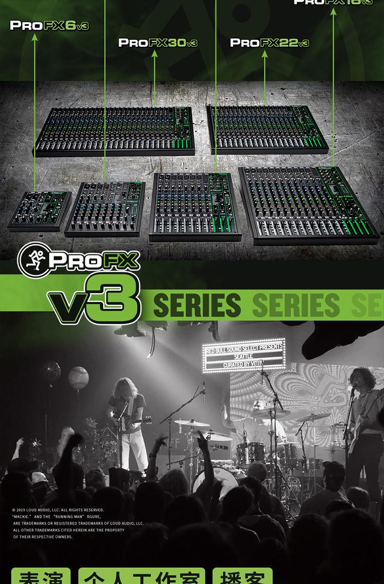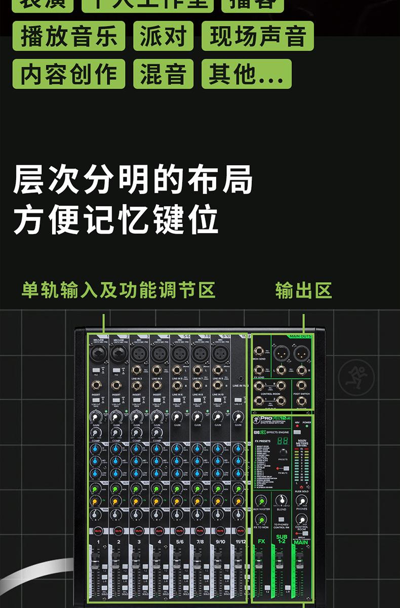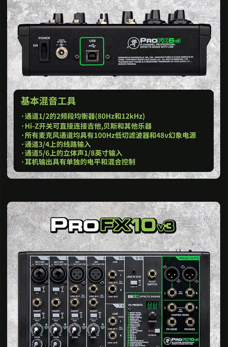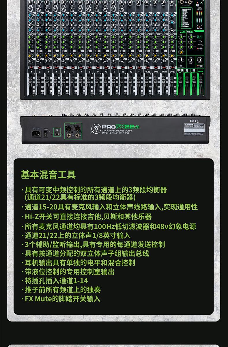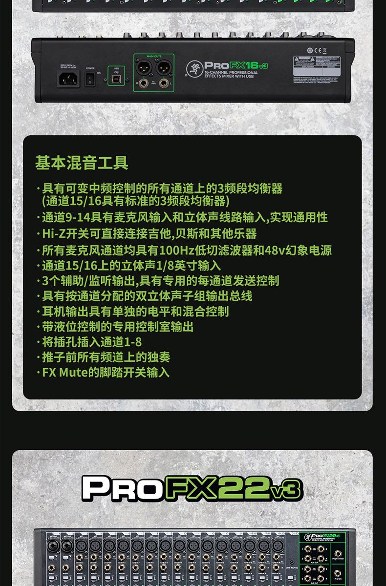 Conteúdo da Embalagem Conteúdo da Embalagem • Mixer ProFX12v3 1 unidade • Cabo de Alimentação 1 peça • Cabo USB 1 peça • Manual do Usuário 1 cópia • Motor de Efeitos GigFX: 24 efeitos • Pré-amplificadores: 7 Mackie Onyx • Características de Ruído (ruído de entrada equivalente com impedância de fonte de 150Ω): Entrada de microfone para saída de envio de inserção, ganho máximo: -126dBu Ruído de saída residual: Todas as saídas, fader principal e nível de linha desligados: -95dBu; Todas as saídas, fader principal em unidade, um nível de linha em unidade: -80dBu • Resposta de Frequência: Entrada de microfone para qualquer saída (ganho unitário): +0, -1dB, 20Hz-30kHz • Distorção (THD+N): Entrada de microfone para saída principal (22Hz-80kHz): <0.02% @ +4dBu de saída • Atenuação e Diafonia (20Hz-20kHz): Saídas adjacentes @ 1kHz: -90dB; Entrada para saída @ 1kHz: -80dB; Ganho desligado @ 1kHz: -75dB; Chave Mute / Chave Cut Mudo @ 1kHz: -90dB • Alimentação Fantasma: 48V • Nível Máximo: Todas as entradas: +22dBu; Saída XLR da Mixagem Principal: +28dBu; Todas as outras saídas: +22dBu • USB: USB 2.0, 1 saída estéreo, 2 entradas estéreo, A/D/A: 24-bit, 44.1/48/96/192kHz • Alimentação CA: 100V-240V CA, 50-60Hz, 30W • Dimensões: 102 x 330 x 376 mm • Peso: 3.6kg