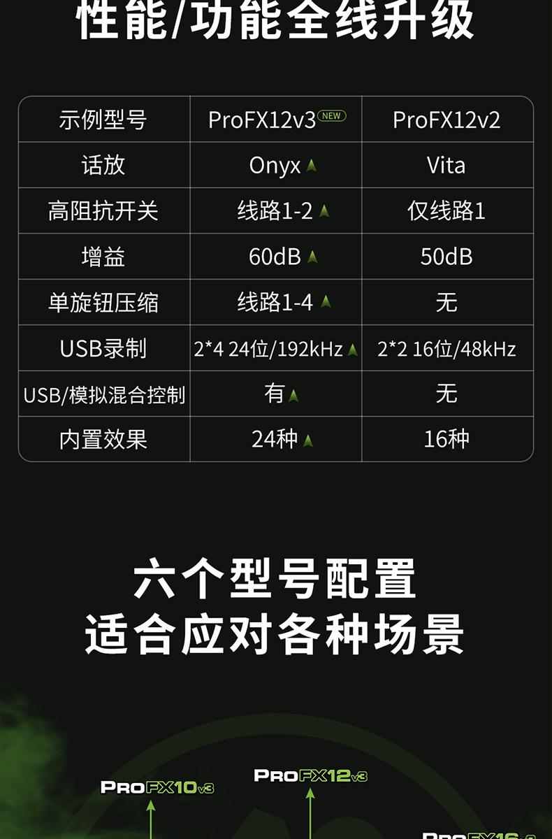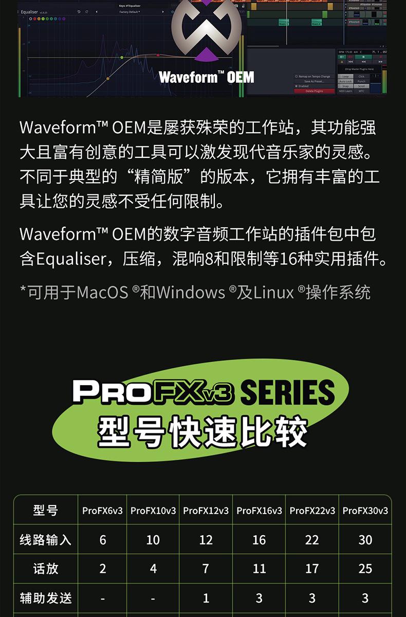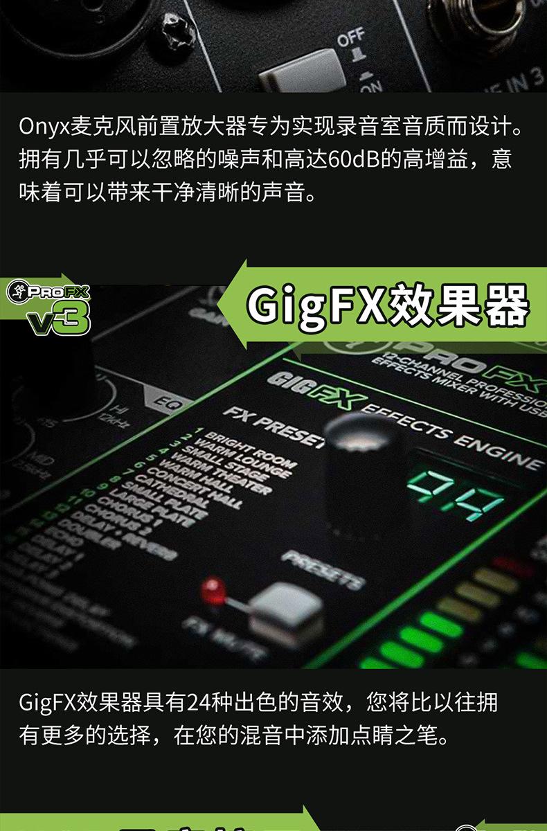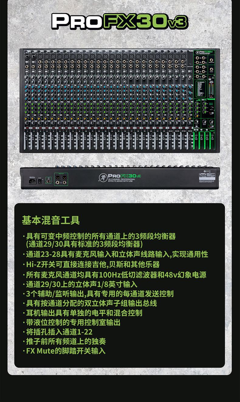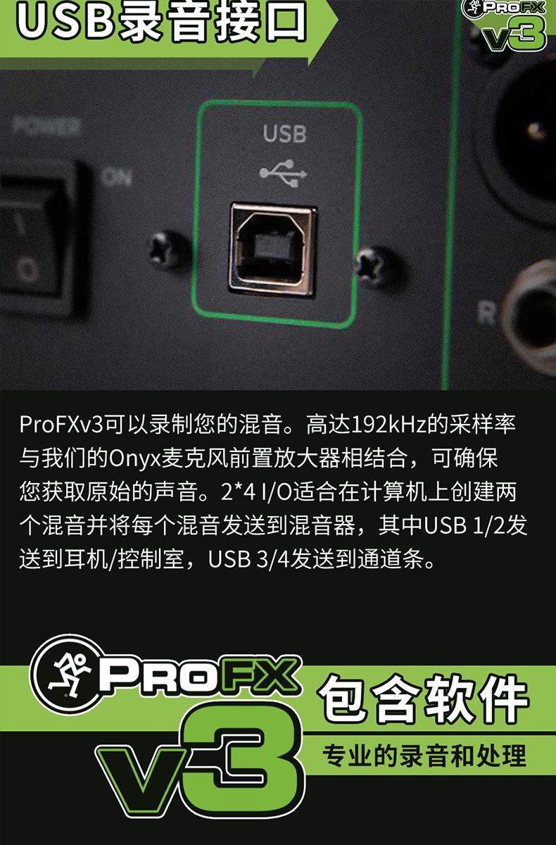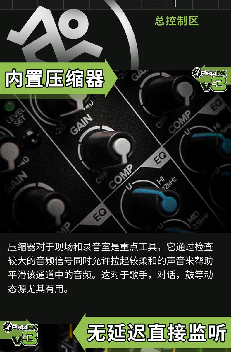 Conteúdo da Embalagem Conteúdo da Embalagem • Mixer ProFX12v3 1 unidade • Cabo de Alimentação 1 peça • Cabo USB 1 peça • Manual do Usuário 1 cópia • Motor de Efeitos GigFX: 24 efeitos • Pré-amplificadores: 7 Mackie Onyx • Características de Ruído (ruído de entrada equivalente com impedância de fonte de 150Ω): Entrada de microfone para saída de envio de inserção, ganho máximo: -126dBu Ruído de saída residual: Todas as saídas, fader principal e nível de linha desligados: -95dBu; Todas as saídas, fader principal em unidade, um nível de linha em unidade: -80dBu • Resposta de Frequência: Entrada de microfone para qualquer saída (ganho unitário): +0, -1dB, 20Hz-30kHz • Distorção (THD+N): Entrada de microfone para saída principal (22Hz-80kHz): <0.02% @ +4dBu de saída • Atenuação e Diafonia (20Hz-20kHz): Saídas adjacentes @ 1kHz: -90dB; Entrada para saída @ 1kHz: -80dB; Ganho desligado @ 1kHz: -75dB; Chave Mute / Chave Cut Mudo @ 1kHz: -90dB • Alimentação Fantasma: 48V • Nível Máximo: Todas as entradas: +22dBu; Saída XLR da Mixagem Principal: +28dBu; Todas as outras saídas: +22dBu • USB: USB 2.0, 1 saída estéreo, 2 entradas estéreo, A/D/A: 24-bit, 44.1/48/96/192kHz • Alimentação CA: 100V-240V CA, 50-60Hz, 30W • Dimensões: 102 x 330 x 376 mm • Peso: 3.6kg