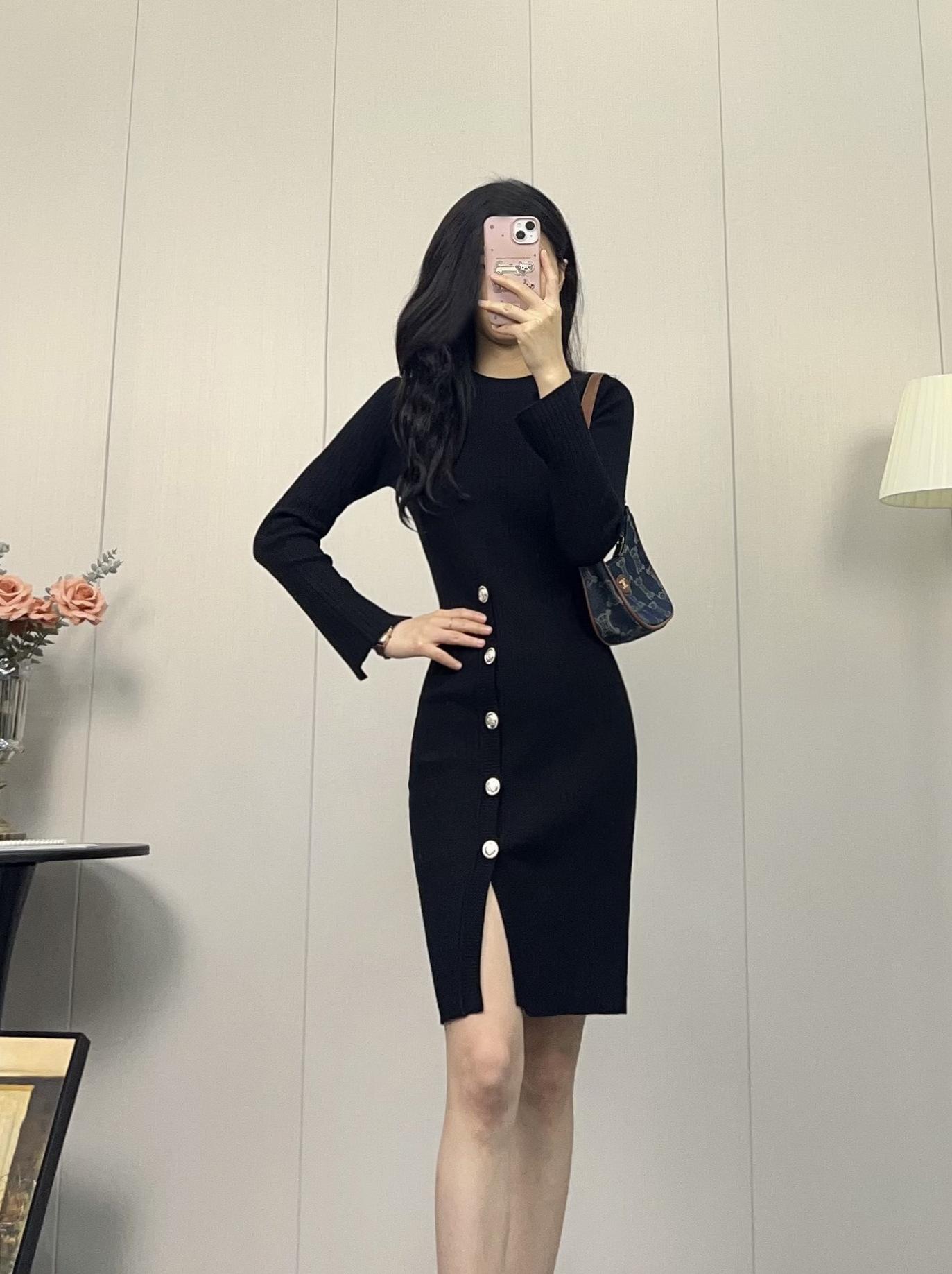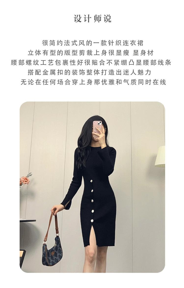 Compra Vestido de Punto de Estilo Francés a la Moda 2025 Nuevo Diseño de Abertura con Hebilla Metálica Vestido Suéter Negro Ajustado a las Caderas al por mayor en Joom.pro